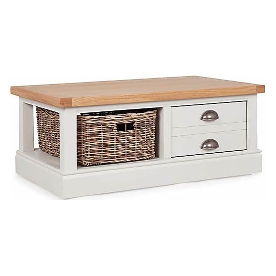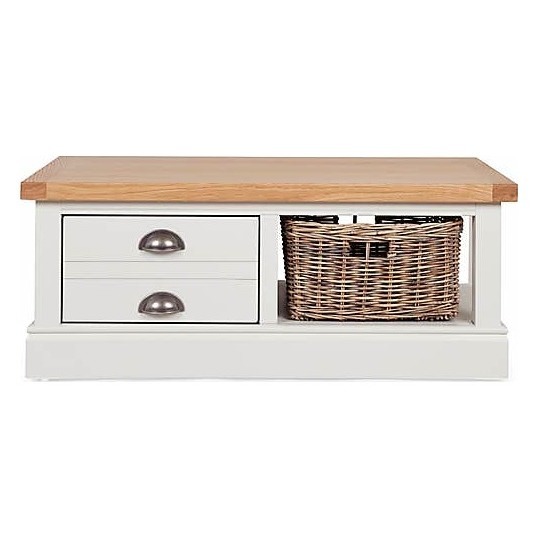 Dunelm Exclusive – Designed and Developed by Dunelm. Inspired by clean and simplistic styling with a natural look that will complement a host of interiors, the charming Compton range features natural solid oak and oak veneer tops accompanied with an elegant Ivory painted finish. Crafted with classic antique silver cup handles, this range is designed with sturdy pine plinth base. Featuring clean lines for a classic aesthetic, this fully assembled coffee table offers an appealingly smooth feel and features a large rattan basket and a spacious drawer with a unique runner mechanism, allowing you to access the drawer from both sides. Care Instructions: Avoid common hazards such as harsh solvents or abrasives as this can damage the furniture and mop up any spills with a dry cloth. Avoid exposure to direct sunlight or extreme conditions. Don't put your furniture near heating sources or in highly air-conditioned spaces.