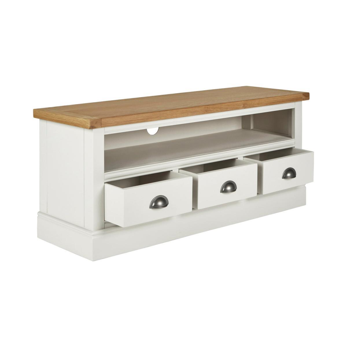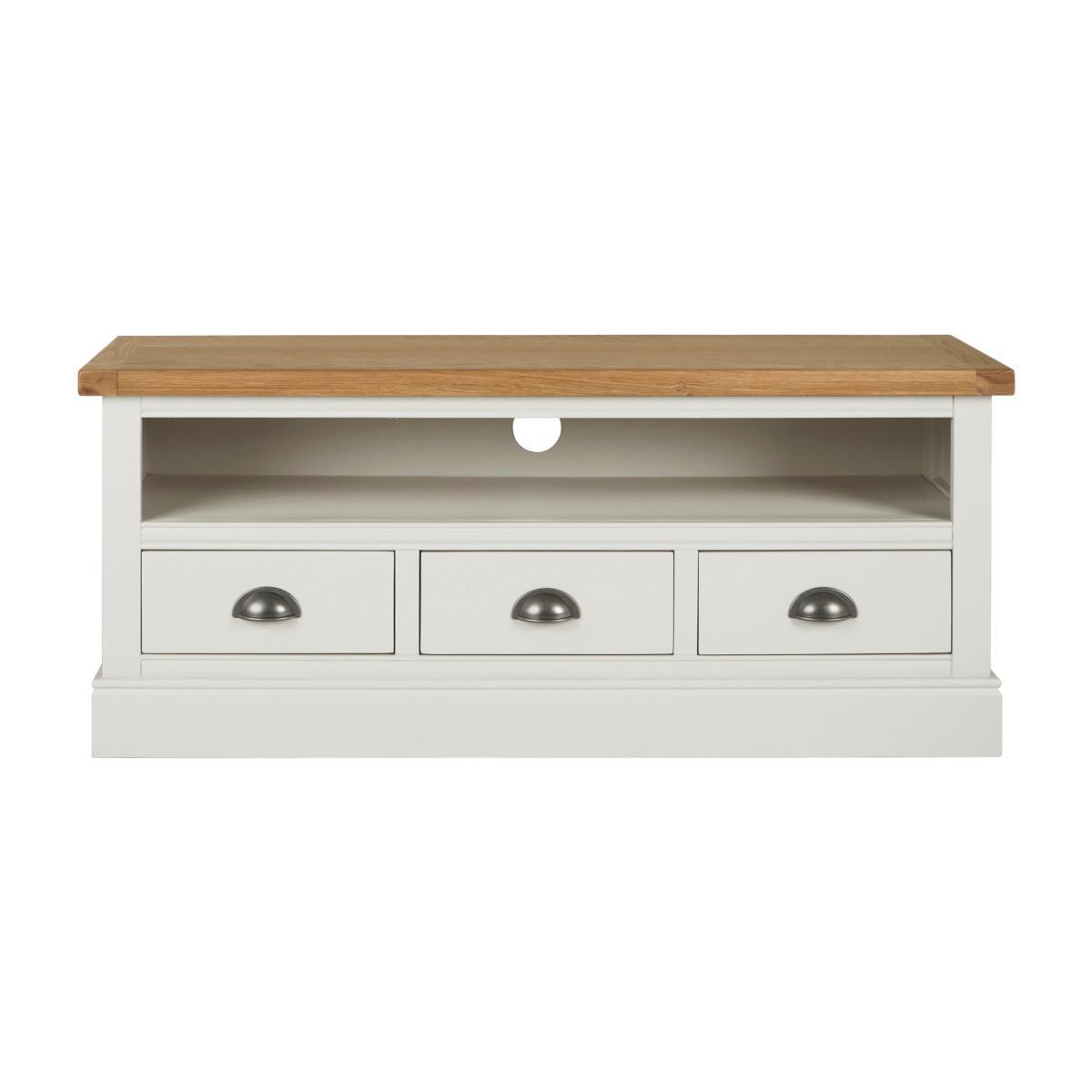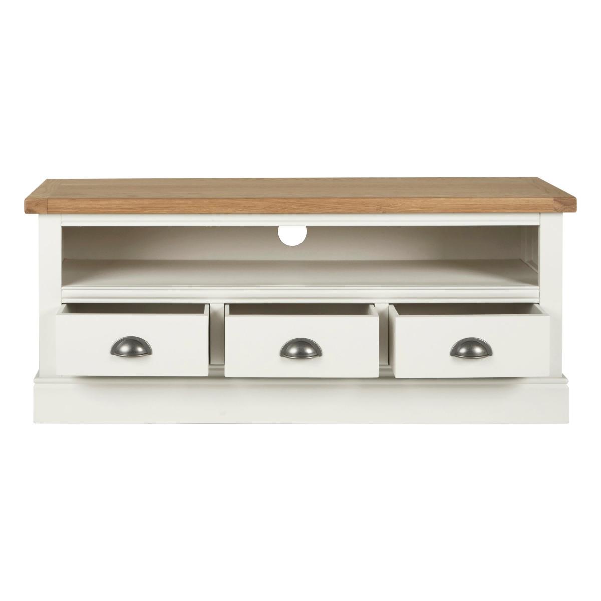 Dunelm Exclusive - Designed and Developed by Dunelm. Inspired by clean and simplistic styling with a natural look that will compliment a host of interiors, the charming Compton range features natural solid oak and thick oak veneer tops accompanied with an elegant ivory painted finish. Crafted with classic antique silver cup handles, this range is designed with solid pine wood legs. Offering ample storage space, this fully assembled large TV stand features a fixed open shelf with cable access and three spacious drawers. Shelf dimensions: H 16. 5cm x W 111cm x D 31cm. Drawer dimensions: H 11. 5cm x W 30. 5cm x D 27cm. Item fully assembled.