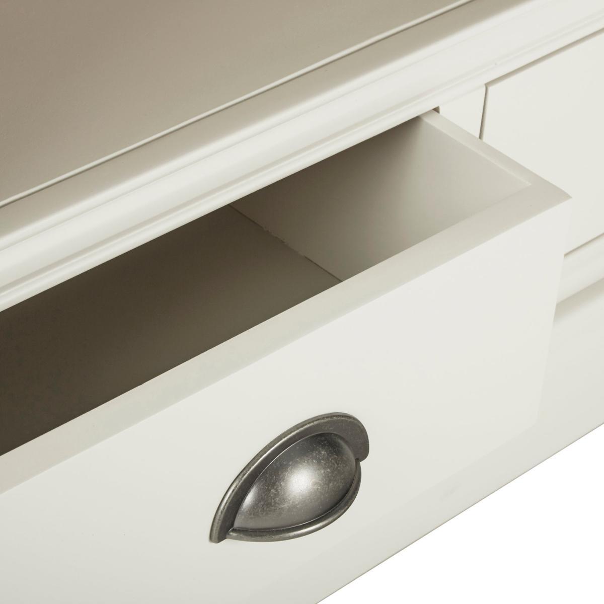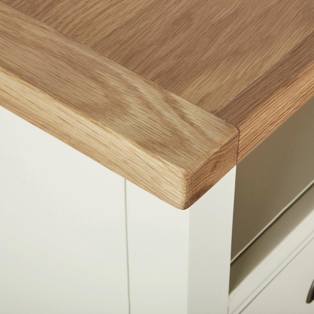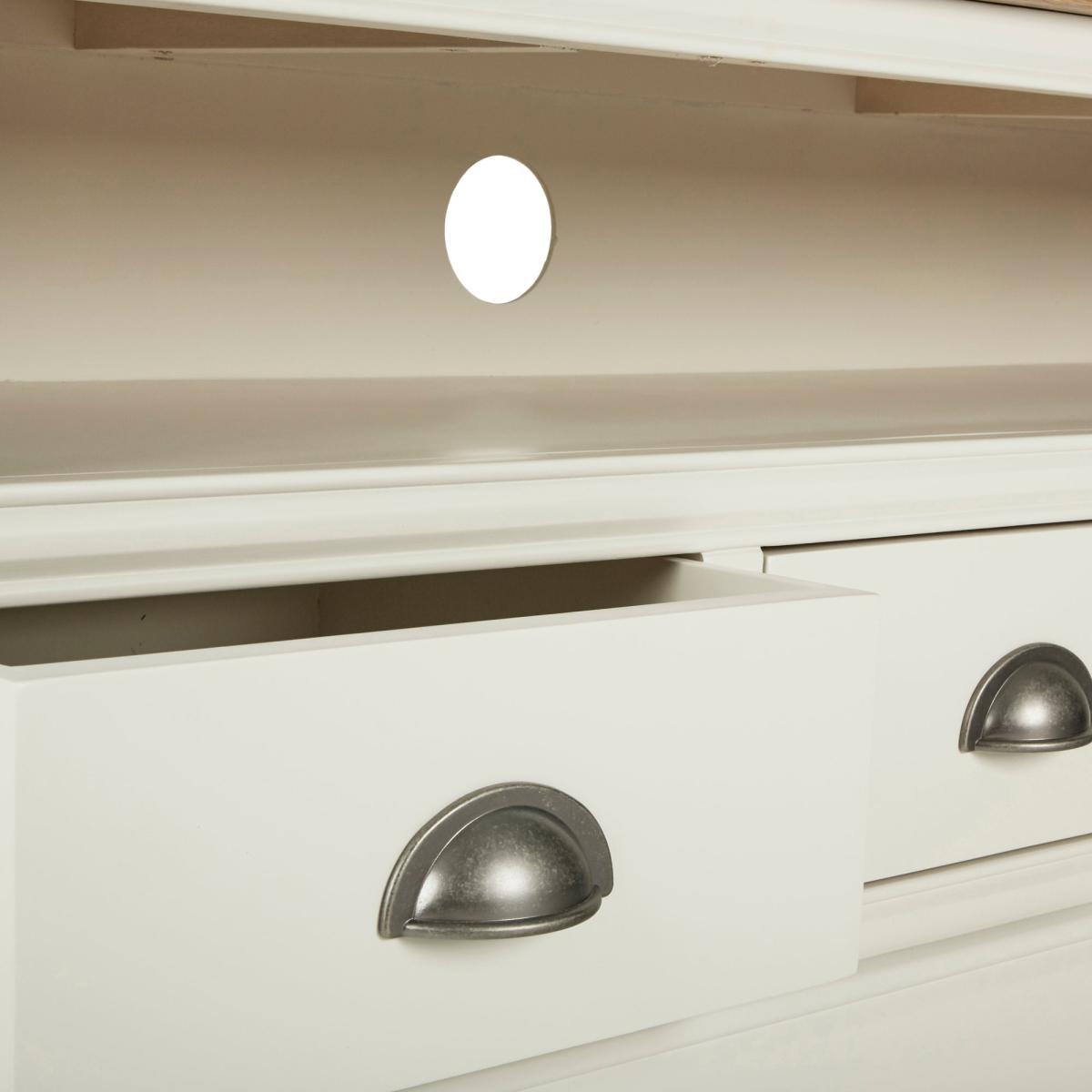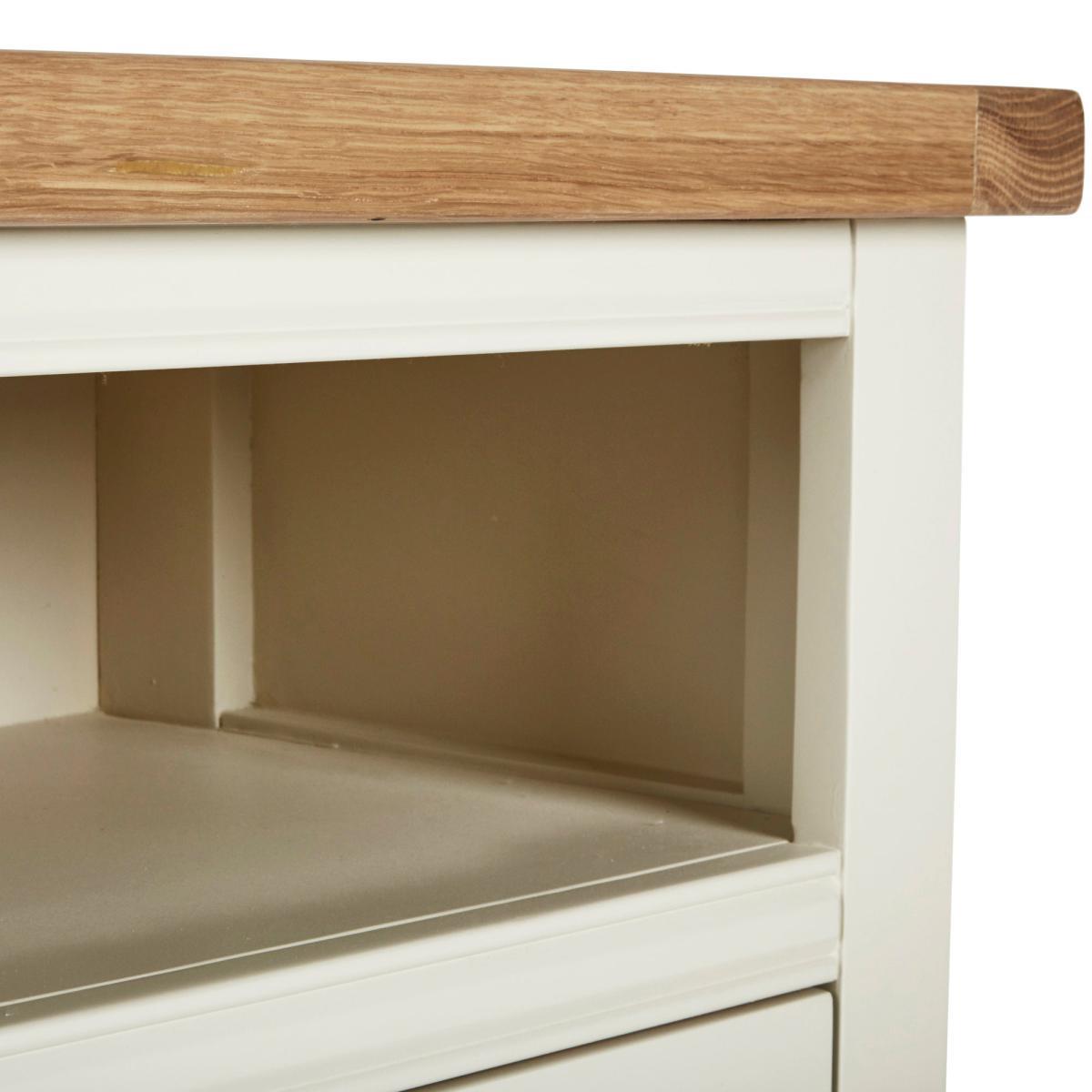 Dunelm Exclusive - Designed and Developed by Dunelm. Inspired by clean and simplistic styling with a natural look that will compliment a host of interiors, the charming Compton range features natural solid oak and thick oak veneer tops accompanied with an elegant ivory painted finish. Crafted with classic antique silver cup handles, this range is designed with solid pine wood legs. Offering ample storage space, this fully assembled large TV stand features a fixed open shelf with cable access and three spacious drawers. Shelf dimensions: H 16. 5cm x W 111cm x D 31cm. Drawer dimensions: H 11. 5cm x W 30. 5cm x D 27cm. Item fully assembled.
