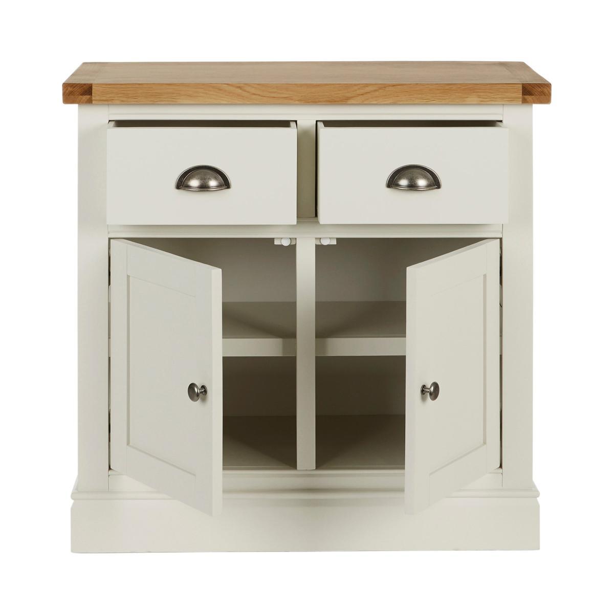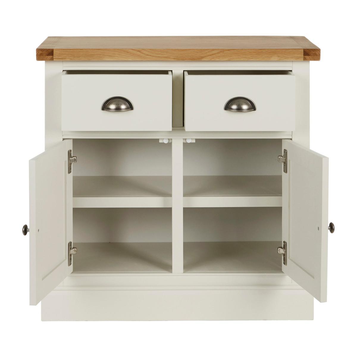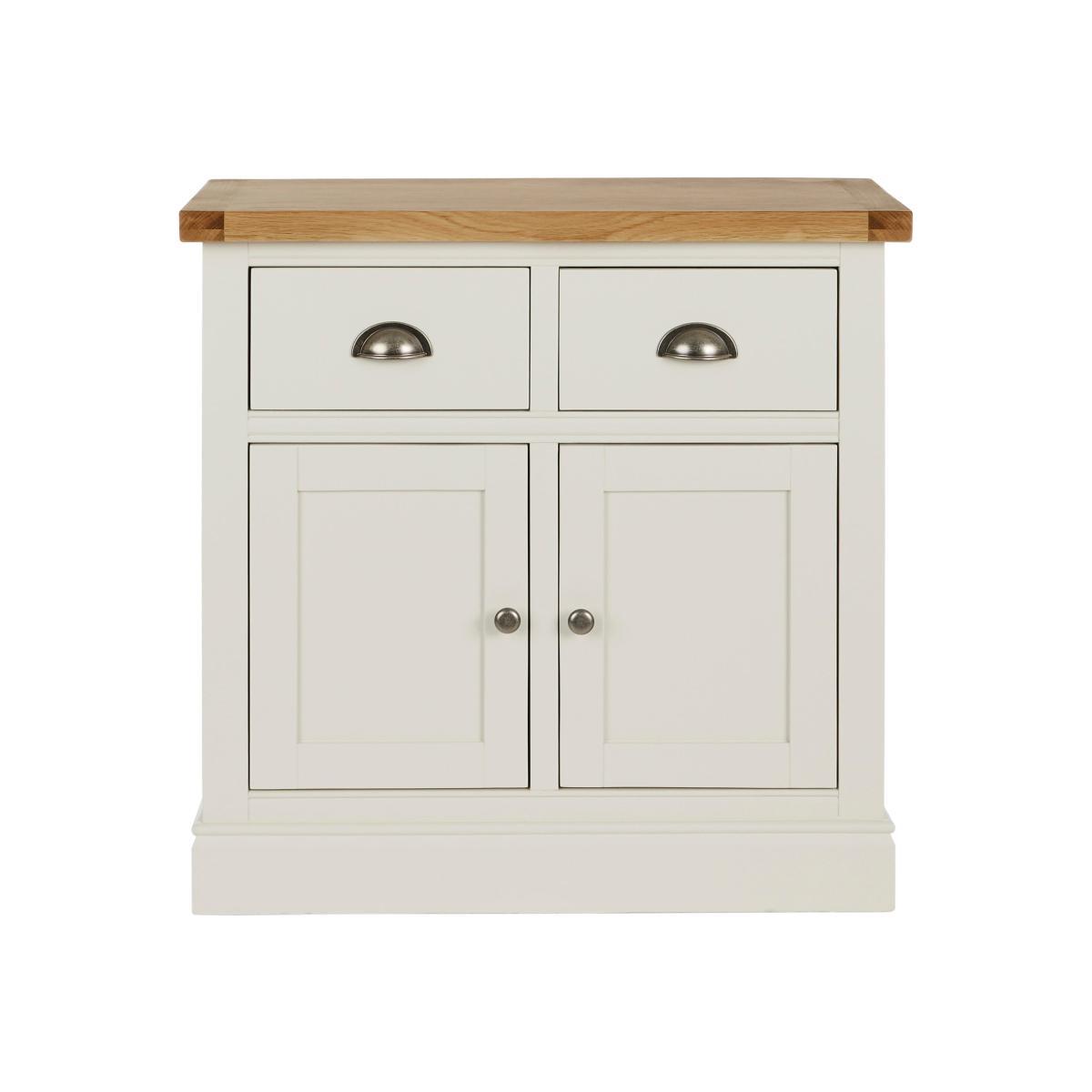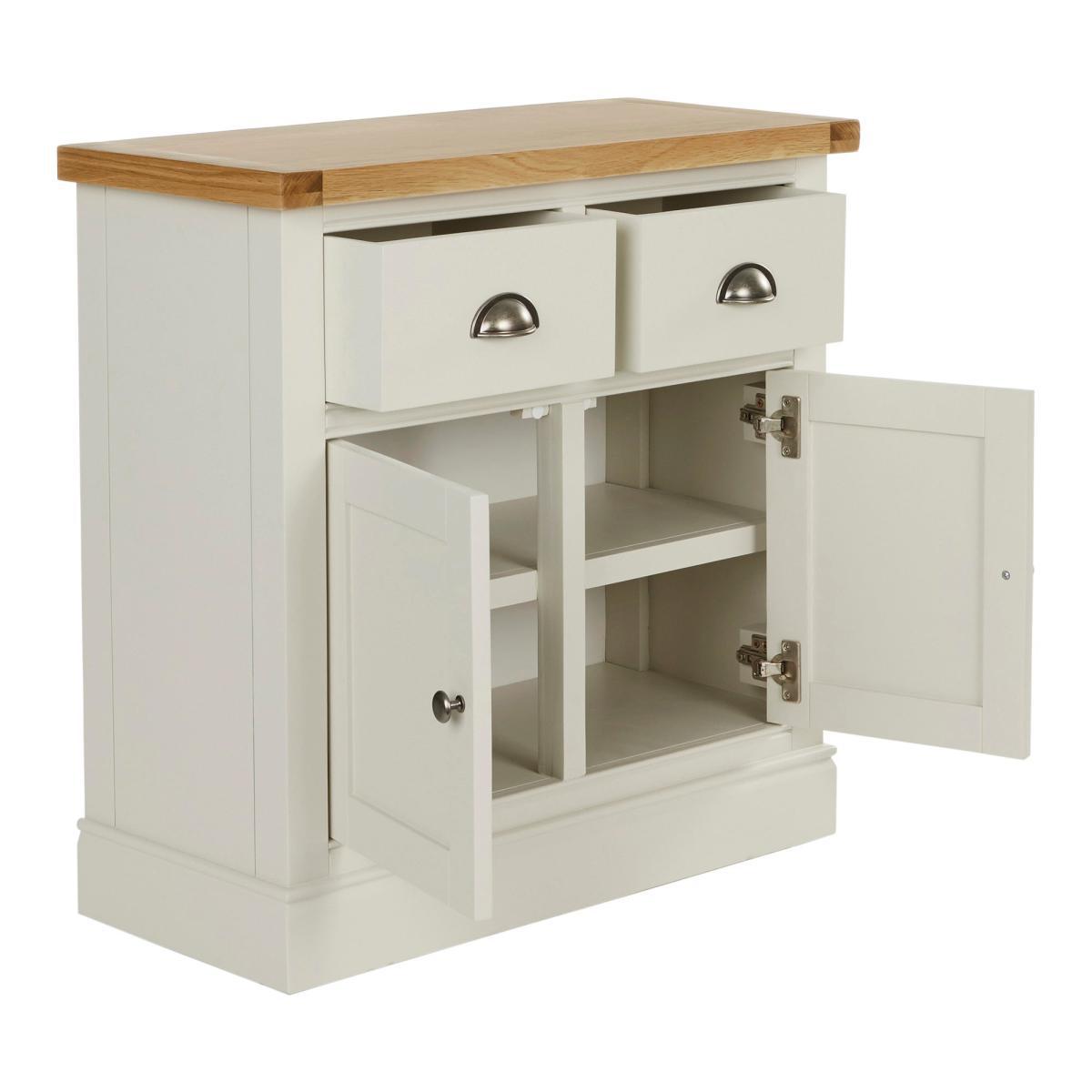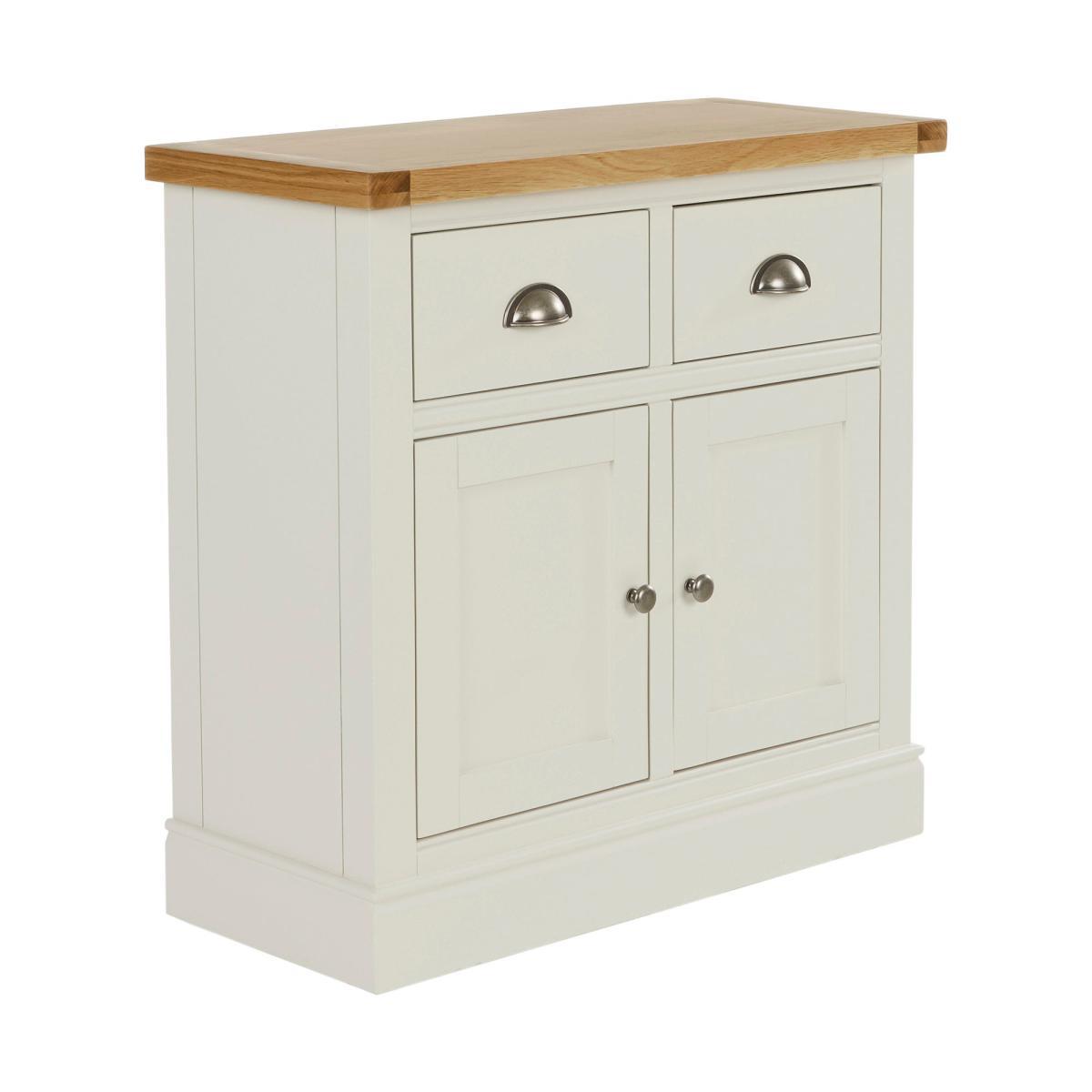 Dunelm Exclusive – Designed and Developed by Dunelm. Inspired by clean and simplistic styling with a natural look that will compliment a host of interiors, the charming Compton range features natural solid oak and thick oak veneer tops accompanied with an elegant ivory painted finish. Crafted with classic antique silver cup handles, this range is designed with solid pine wood legs. Crafted with two spacious drawers, this mini sideboard is supplied fully assembled and features a cupboard, complete with two doors and a fixed shelf.