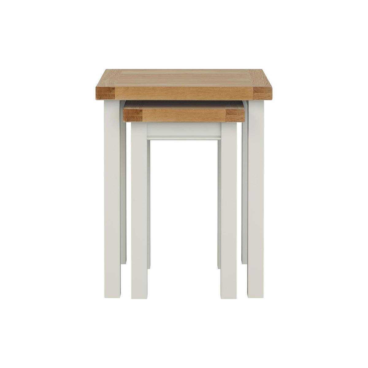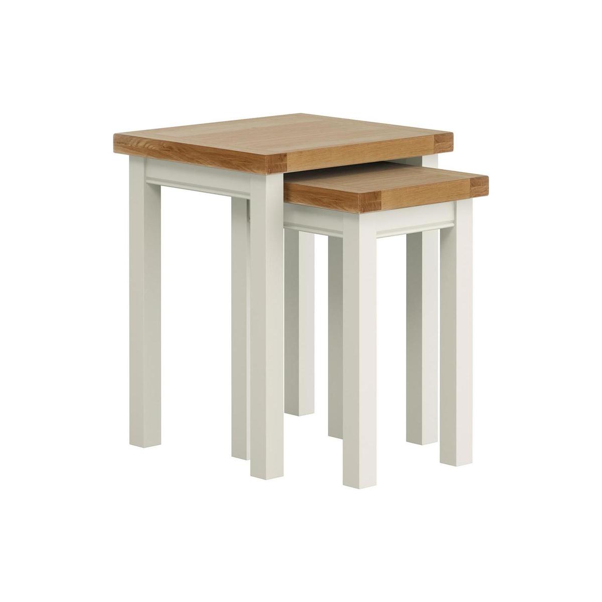 Dunelm Exclusive – Designed and Developed by Dunelm. Inspired by clean and simplistic styling with a natural look that will compliment a host of interiors, the charming Compton range features natural solid oak and thick oak veneer tops accompanied with an elegant ivory painted finish and solid pine wood legs. Featuring clean lines for a classic aesthetic, this fully assembled nest of tables offers an appealingly smooth finish and comes complete with two assorted size tables that fit together neatly for convenience.