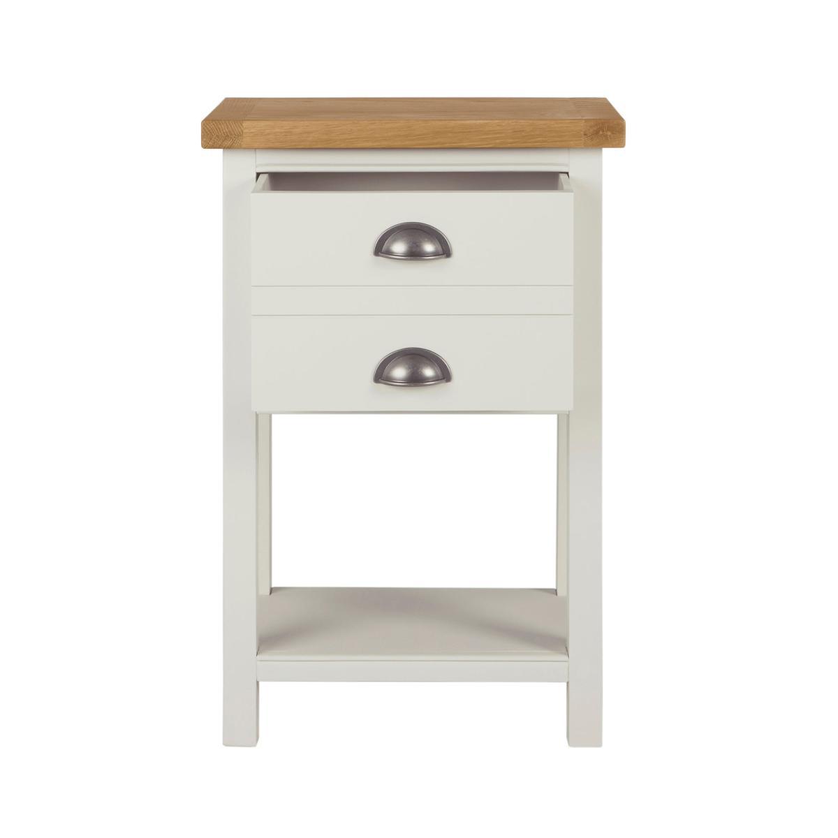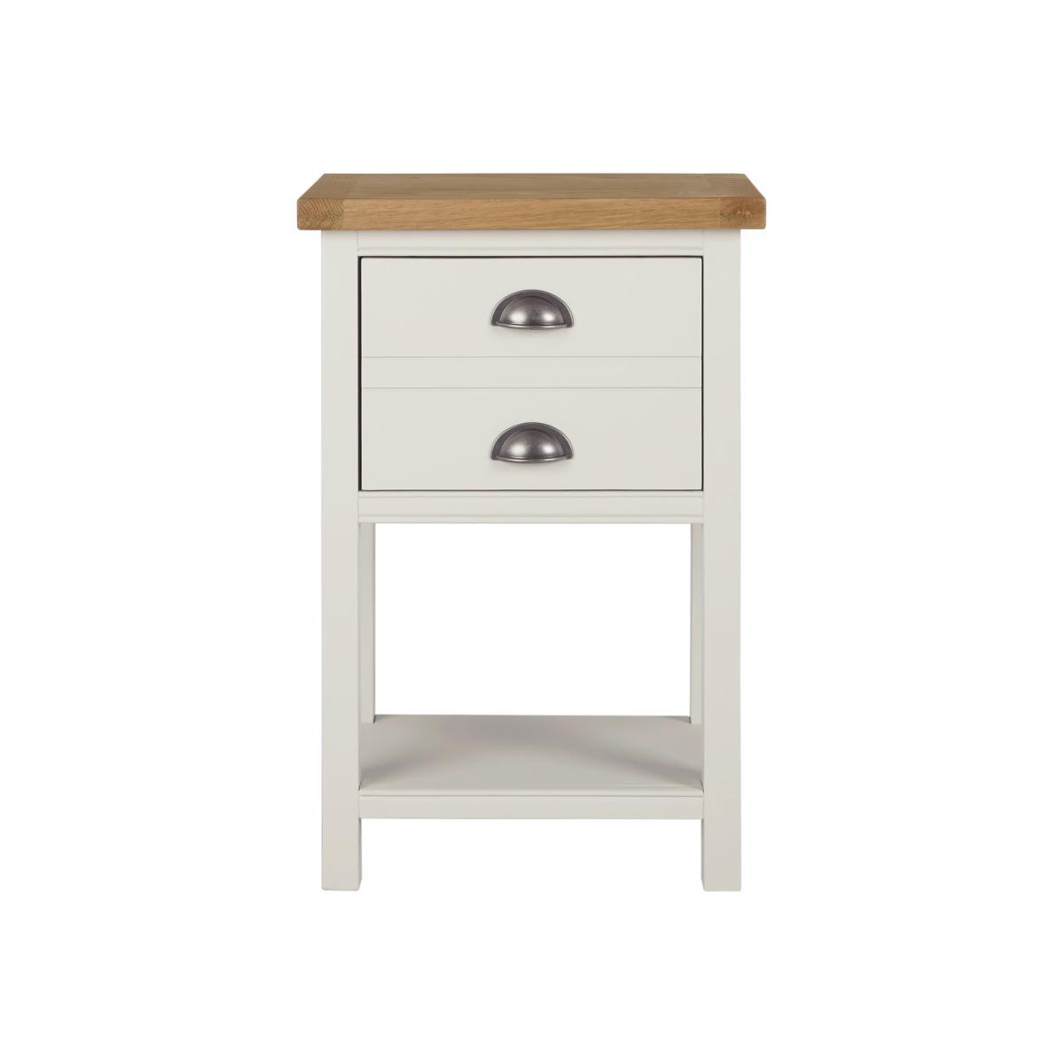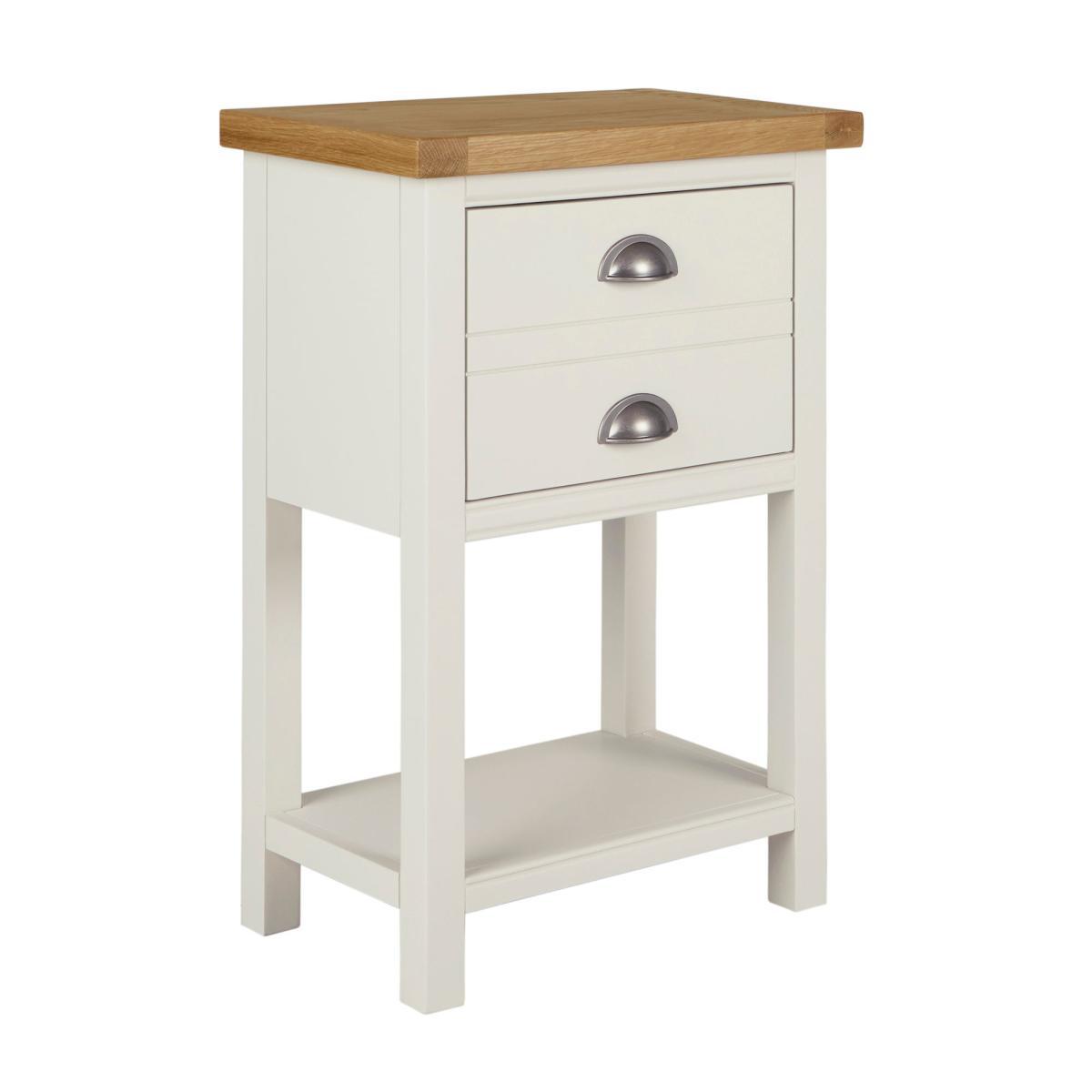 Dunelm Exclusive – Designed and Developed by Dunelm. Inspired by clean and simplistic styling with a natural look that will compliment a host of interiors, the charming Compton range features natural solid oak and thick oak veneer tops accompanied with an elegant ivory painted finish. Crafted with classic antique silver cup handles, this range is designed with solid pine wood legs. Designed with a low shelf and one large drawer, this tall side table is supplied fully assembled and provides additional storage space.
