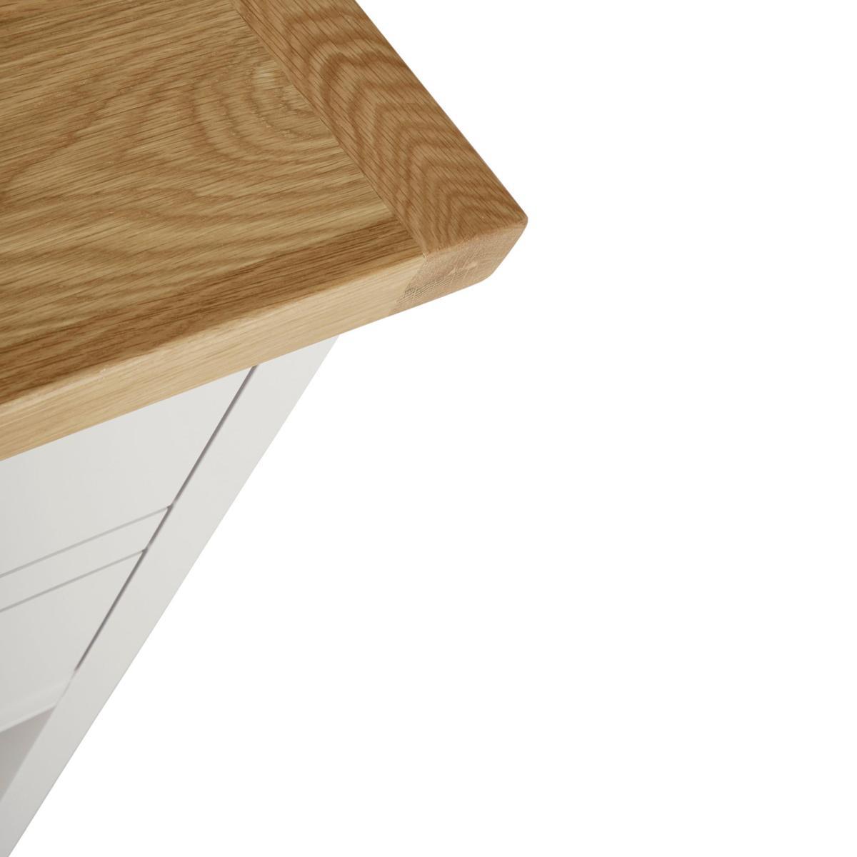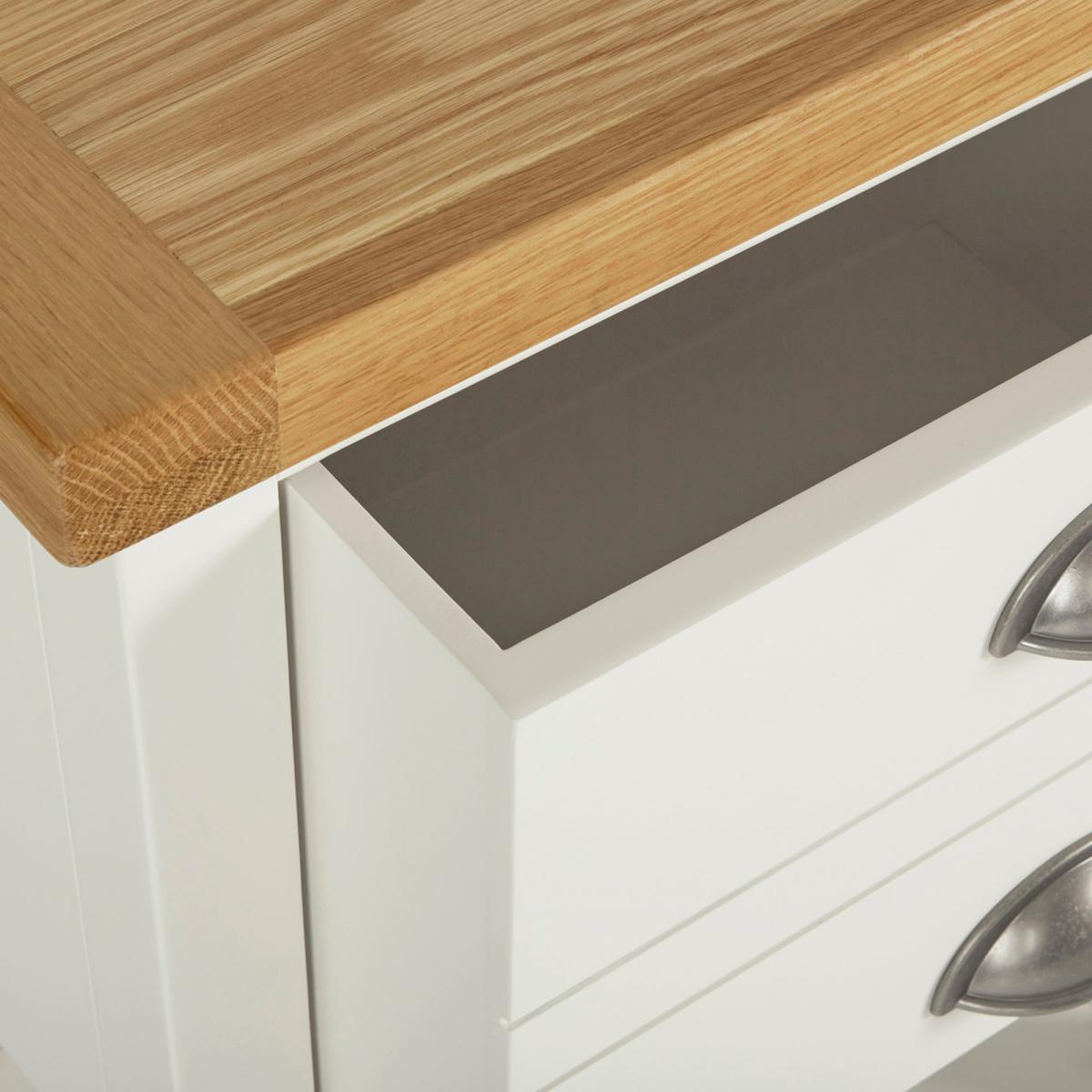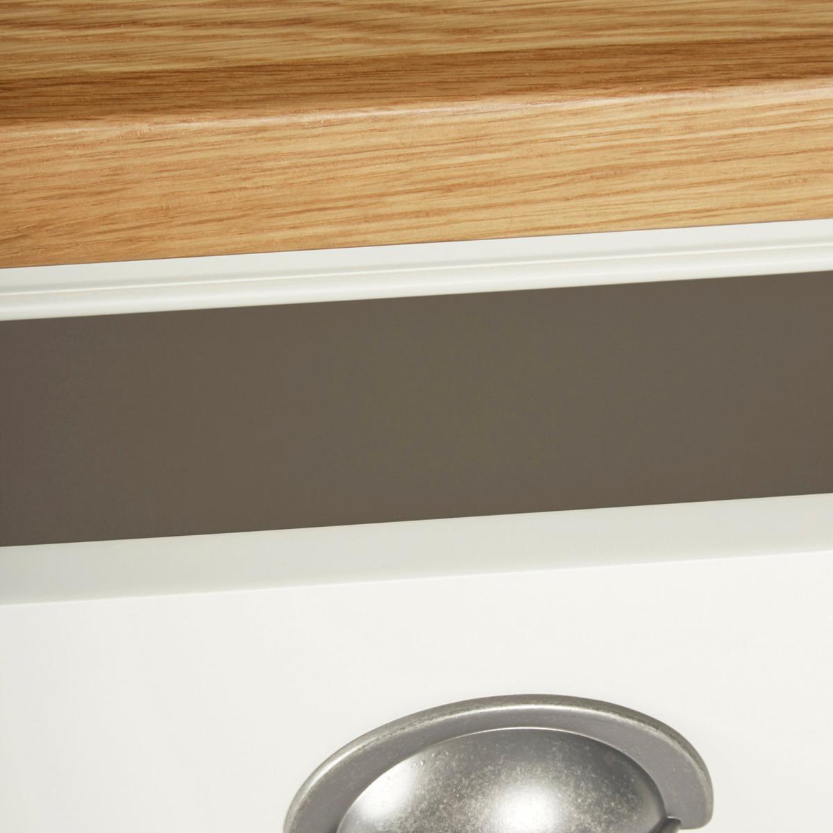 Dunelm Exclusive – Designed and Developed by Dunelm. Inspired by clean and simplistic styling with a natural look that will compliment a host of interiors, the charming Compton range features natural solid oak and thick oak veneer tops accompanied with an elegant ivory painted finish. Crafted with classic antique silver cup handles, this range is designed with solid pine wood legs. Designed with a low shelf and one large drawer, this tall side table is supplied fully assembled and provides additional storage space.