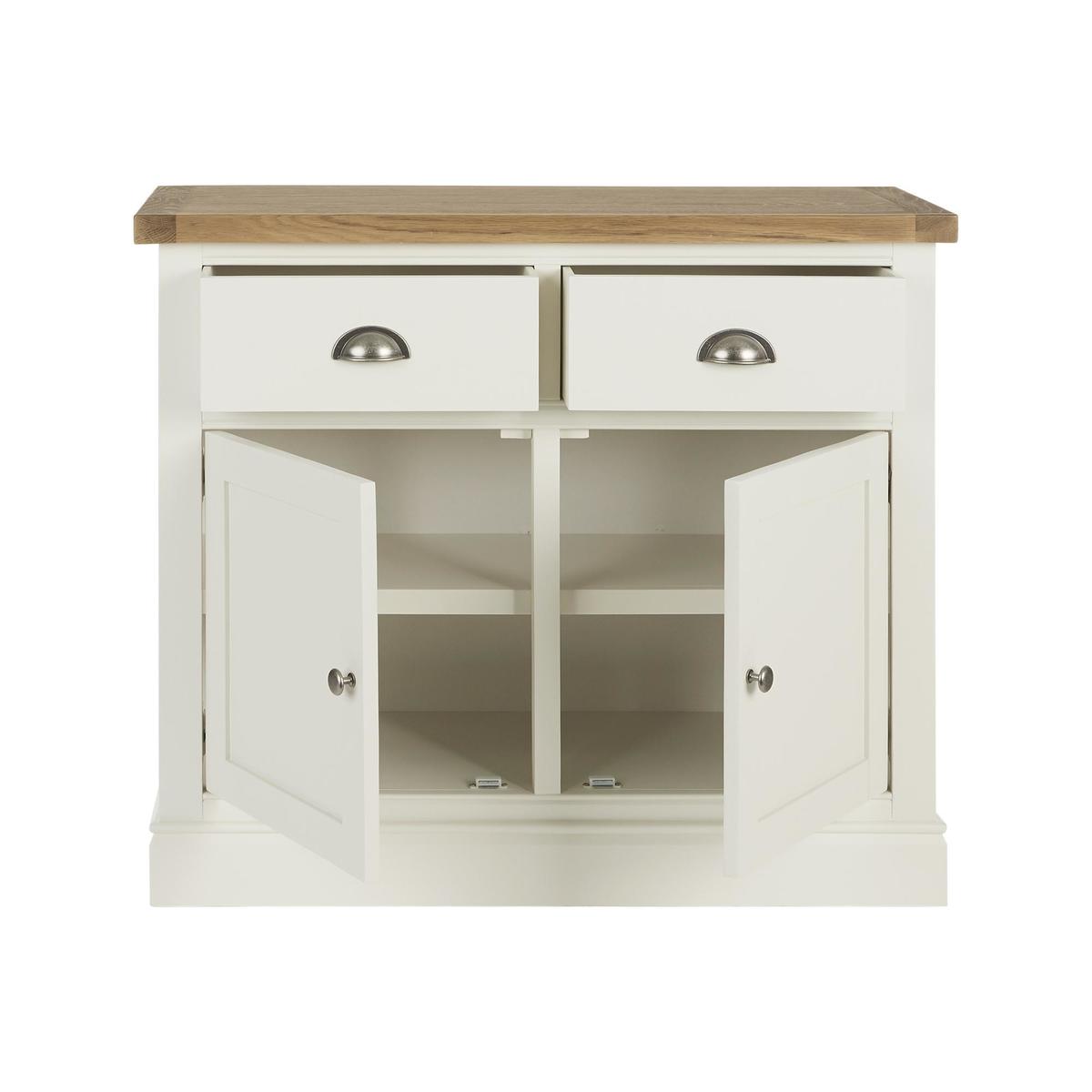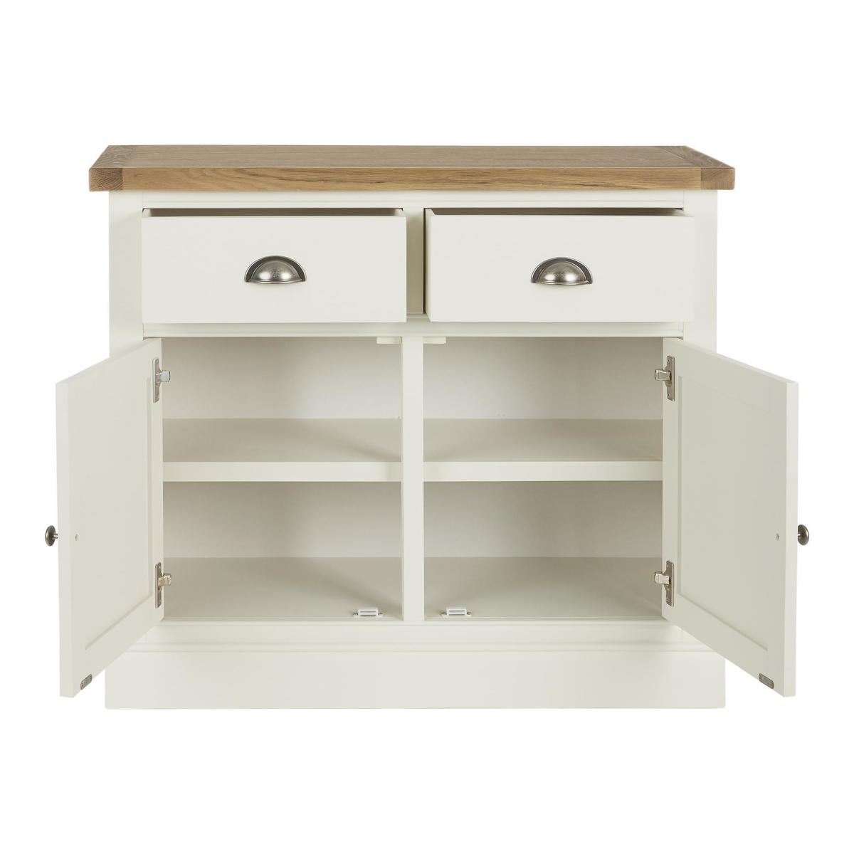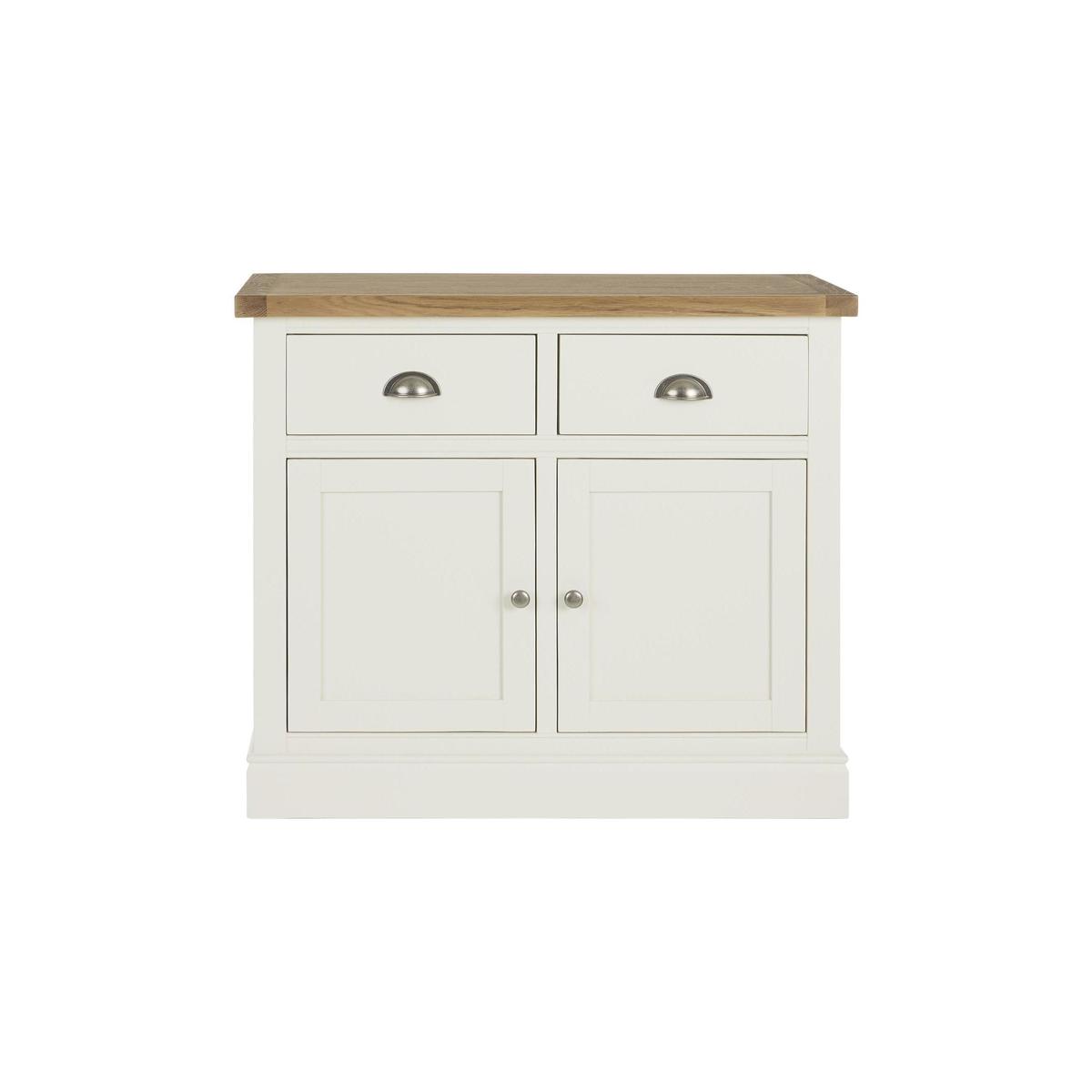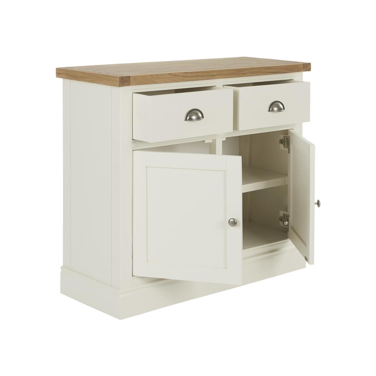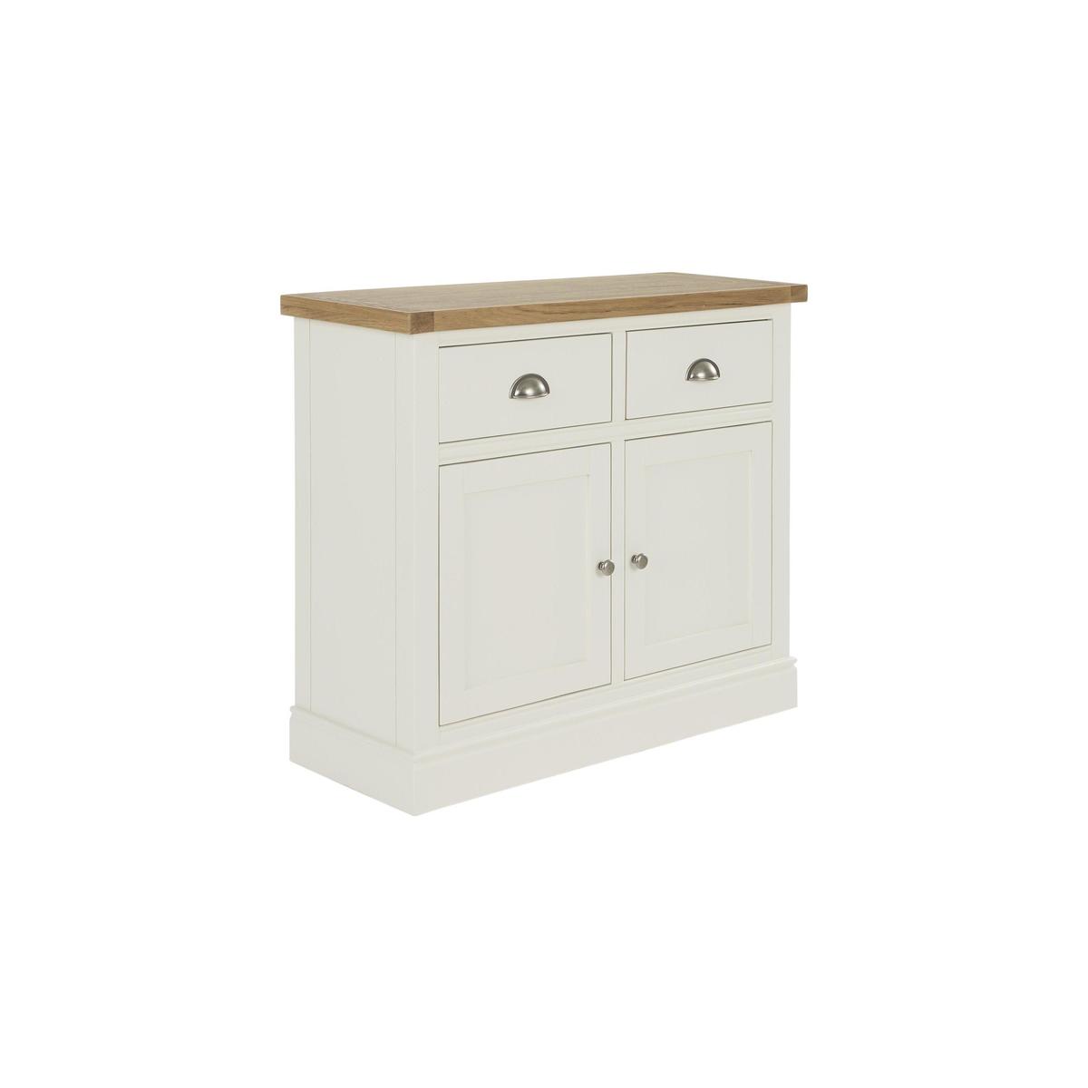 Dunelm Exclusive – Designed and Developed by Dunelm Inspired by clean and simplistic styling with a natural look that will compliment a host of interiors, the charming Compton range features natural solid oak and thick oak veneer tops accompanied with an elegant ivory painted finish. Crafted with classic antique brass cup handles, this range is designed with solid pine wood legs. Designed to maximise storage space, this fully assembled sideboard features two spacious drawers and a double door cupboard, complete with a fixed shelf.