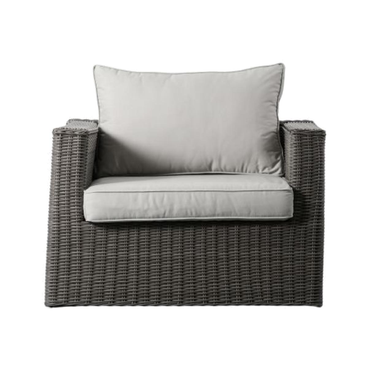 This armchair is crafted from all weather 5mm PE rattan with a hand woven mixed half round/full round weave in a washed grey finish to give a lovely subtle tone. It has a luxurious showerproof seat and back cushion for comfort, in a soft grey to complement the colour of the rattan. The frame is powder coated aluminium. The armchair is also available in a natural finish. It is part of a collection of outdoor furniture which offers a great range of pieces, so you can select the ones to suit your requirements.