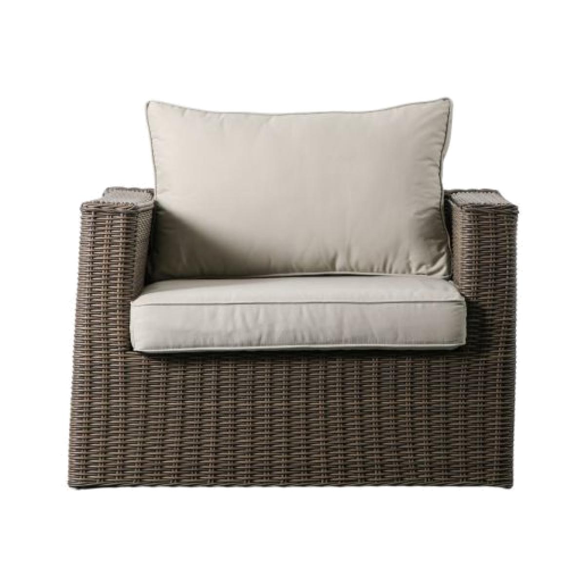 This armchair is crafted from all weather 5mm PE rattan with a hand woven mixed half round/full round weave in a natural finish to give a lovely subtle tone. It has a luxurious showerproof seat and back cushion for comfort, in a soft neutral fabric to complement the colour of the rattan. The frame is powder coated aluminium. The armchair is also available in a washed grey finish. It is part of a collection of outdoor furniture which offers a great range of pieces, so you can select the ones to suit your requirements.