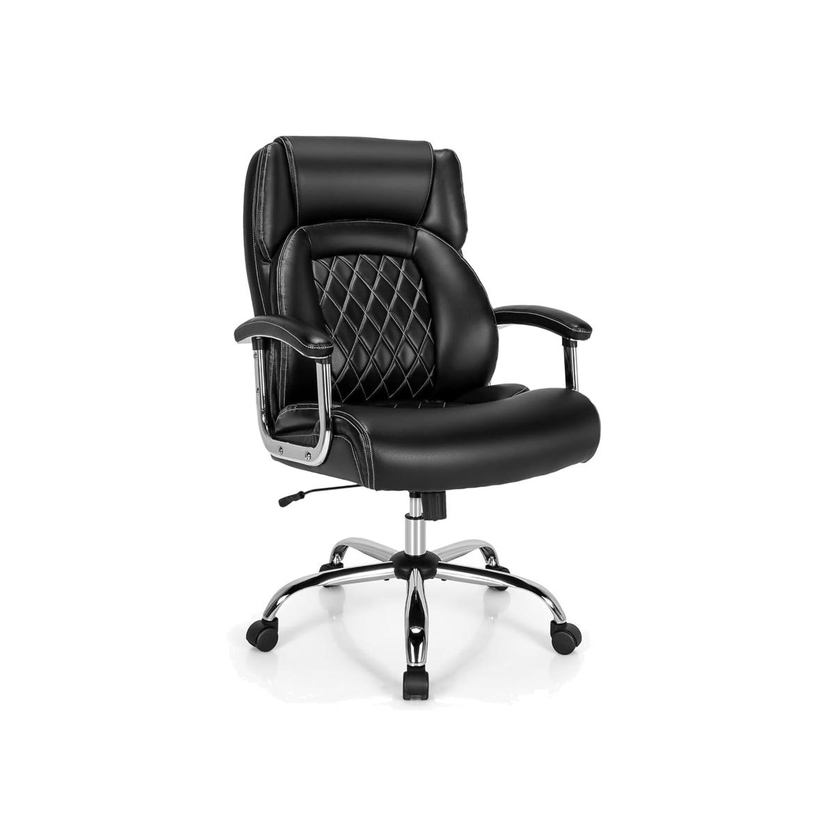 The leather office chair featuring a wide seat and strong bearing capacity of up to 227kg is specially designed for big and tall people. Compared with other previous armrests, our upgraded armrests can relax your arms at a cosy level without jamming the thighs. Ergonomic high backrest with integrated headrest extremely relieves back and neck fatigue. Besides, the rocking function and swivel function offer additional relaxation. And its seat height can be adjusted to meet the needs of people with different heights.