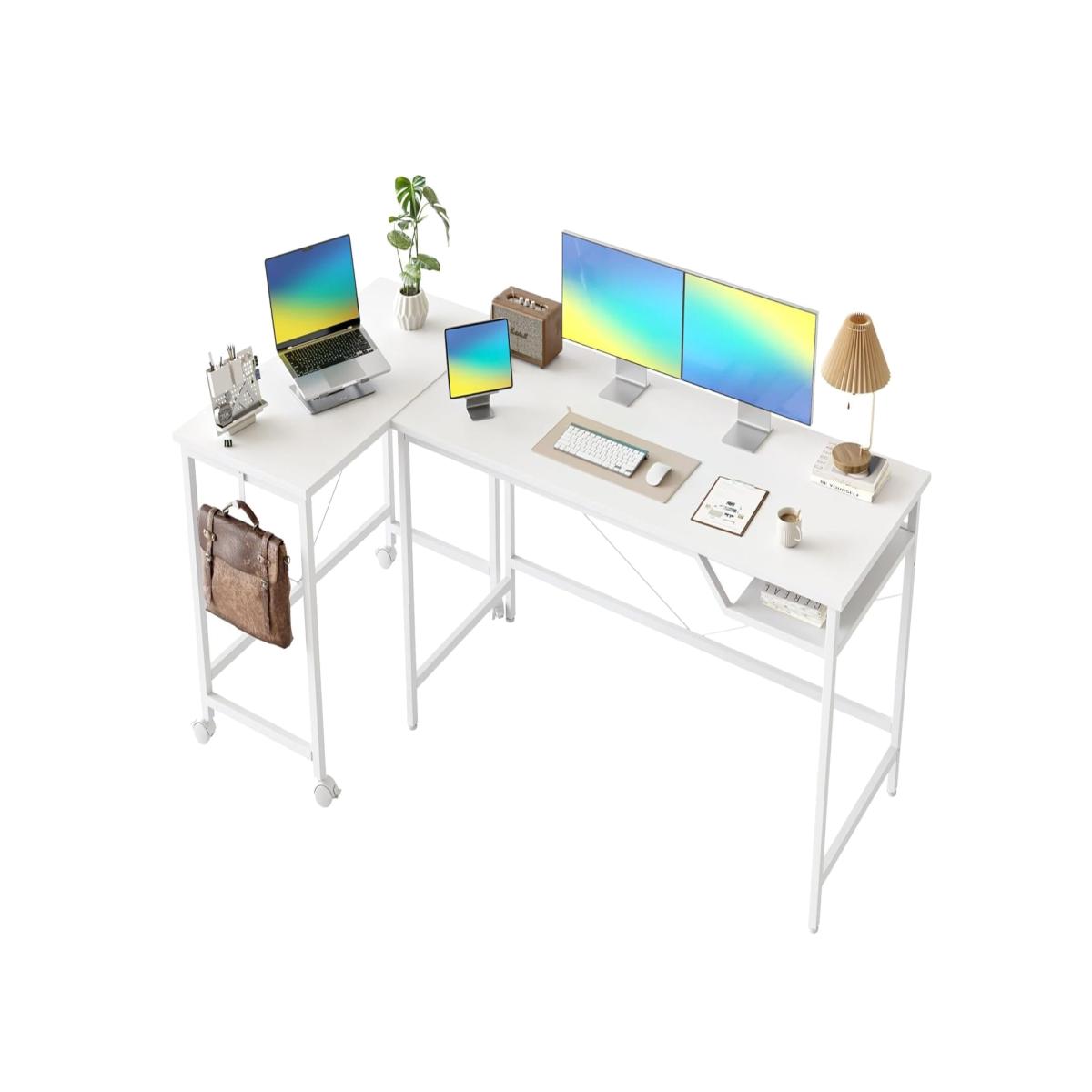 Upgrade your workspace with this versatile computer desk featuring a fixed main desk and a mobile desk with smooth-rolling wheels. Use together as an L shaped workstation or separately as two independent desks for flexible setups. Built with a sturdy metal frame and engineered wood top, this modern white desk ensures durability, easy assembly, and a stylish look for home office, study, or gaming.