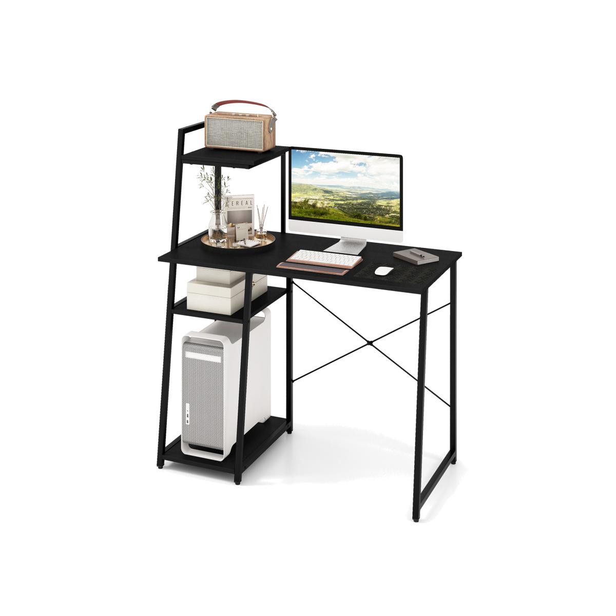 Compact yet efficient, the home office desk serves well as an all-in-one addition. Boasting a 98cm. L x 50cmW desktop, it offers ample work surface while featuring a side bookshelf and host stand for added storage. Crafted from quality metal and boards, the study writing desk supports up to 125kg with stability provided by its X-shaped frame and adjustable foot pads. Versatile in function, it adapts seamlessly to various settings from home offices to art studios.