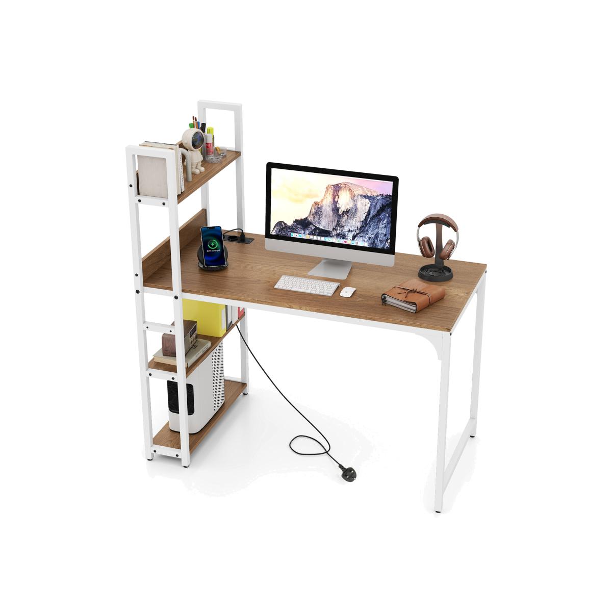 This versatile computer desk provides a built-in power strip for convenient charging, complete with AC outlets, a USB A port, and a USB C port. Additionally, it boasts a sturdy metal frame that comes with adjustable foot pads for stability and offers a high load capacity of 150 kg. With a practical bookshelf and anti-falling baffles for secure item storage, it maximizes space efficiency in any room. The spacious desktop caters to a range of activities like working or gaming.