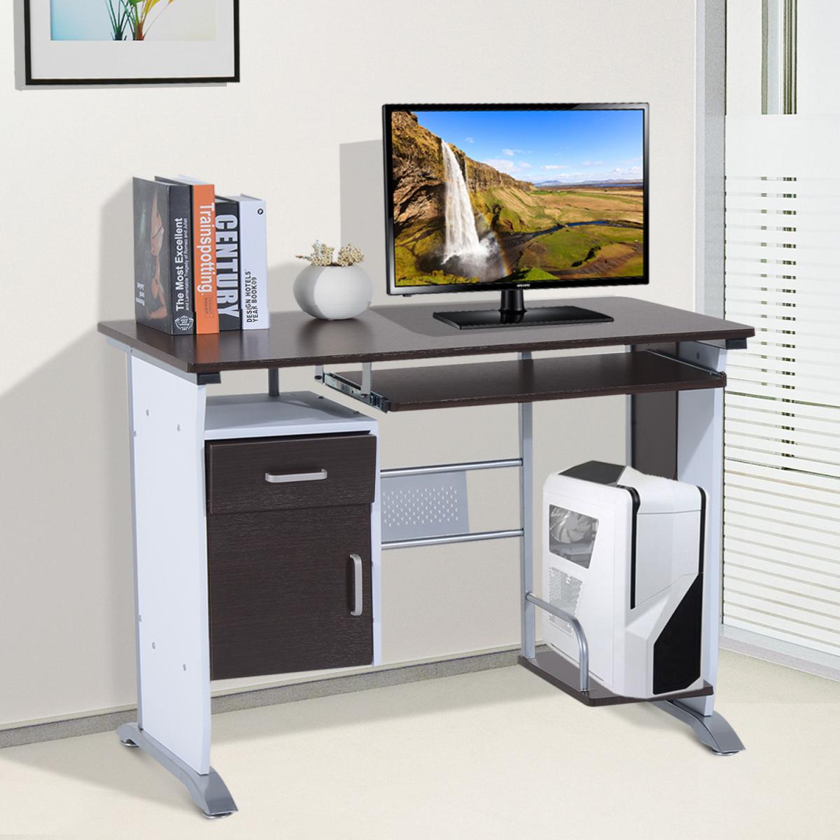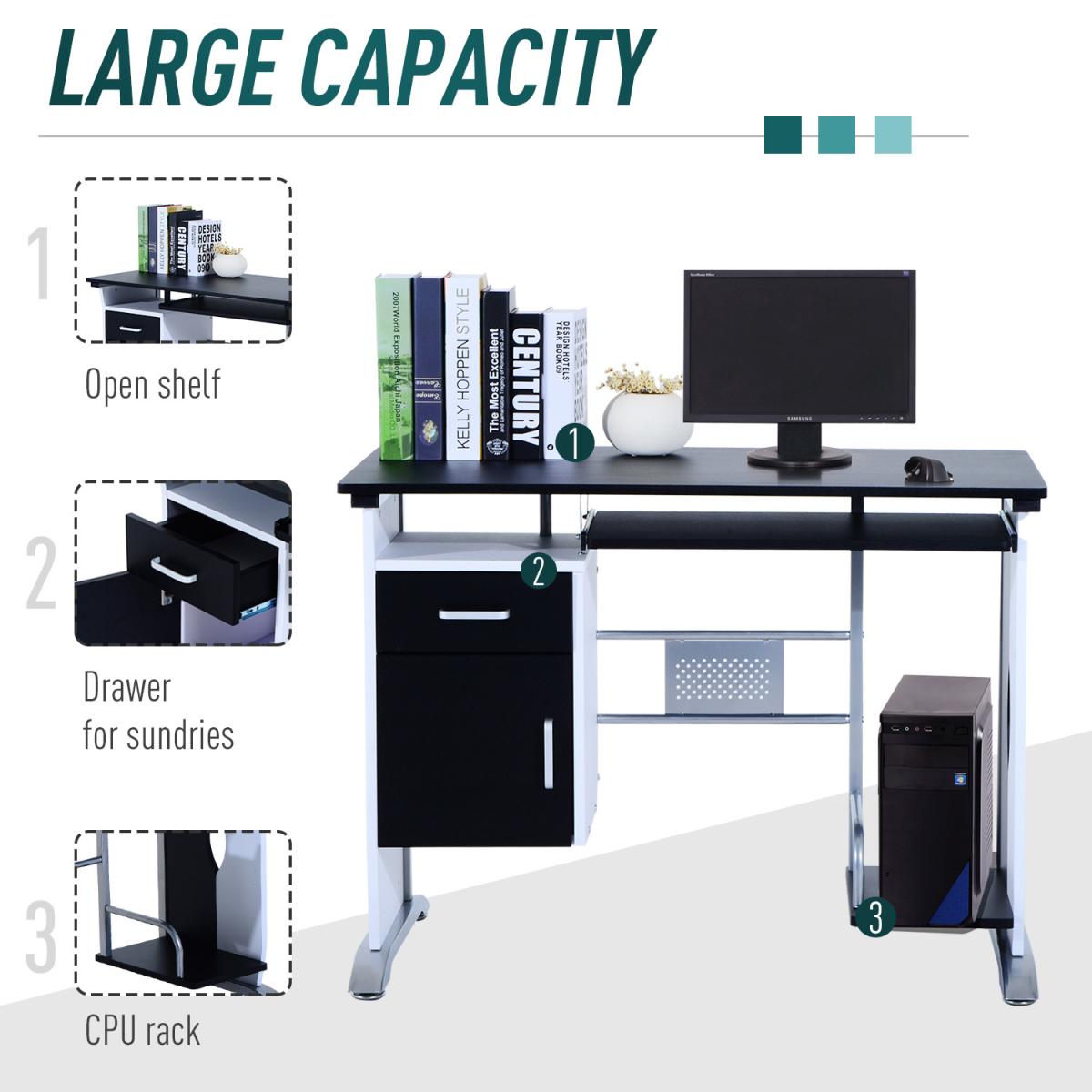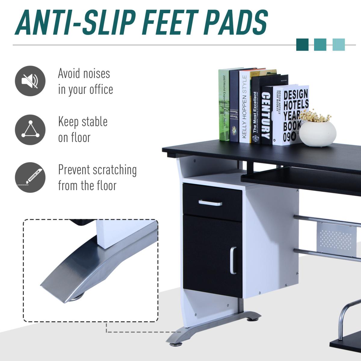 This stylish computer desk is constructed using high-quality steel and MDF. It has a compact design to use the smallest amount of space, so great for small rooms. Comes with a sliding tray for your keyboard and a large convenient workspace for your monitor and any other items for daily work. There is a small drawer and cabinet to keep your stationery or any personal belongings. Comes complete with anti-slip feet to make your desk more stable and secure. This desk can be used for both home and office environment.