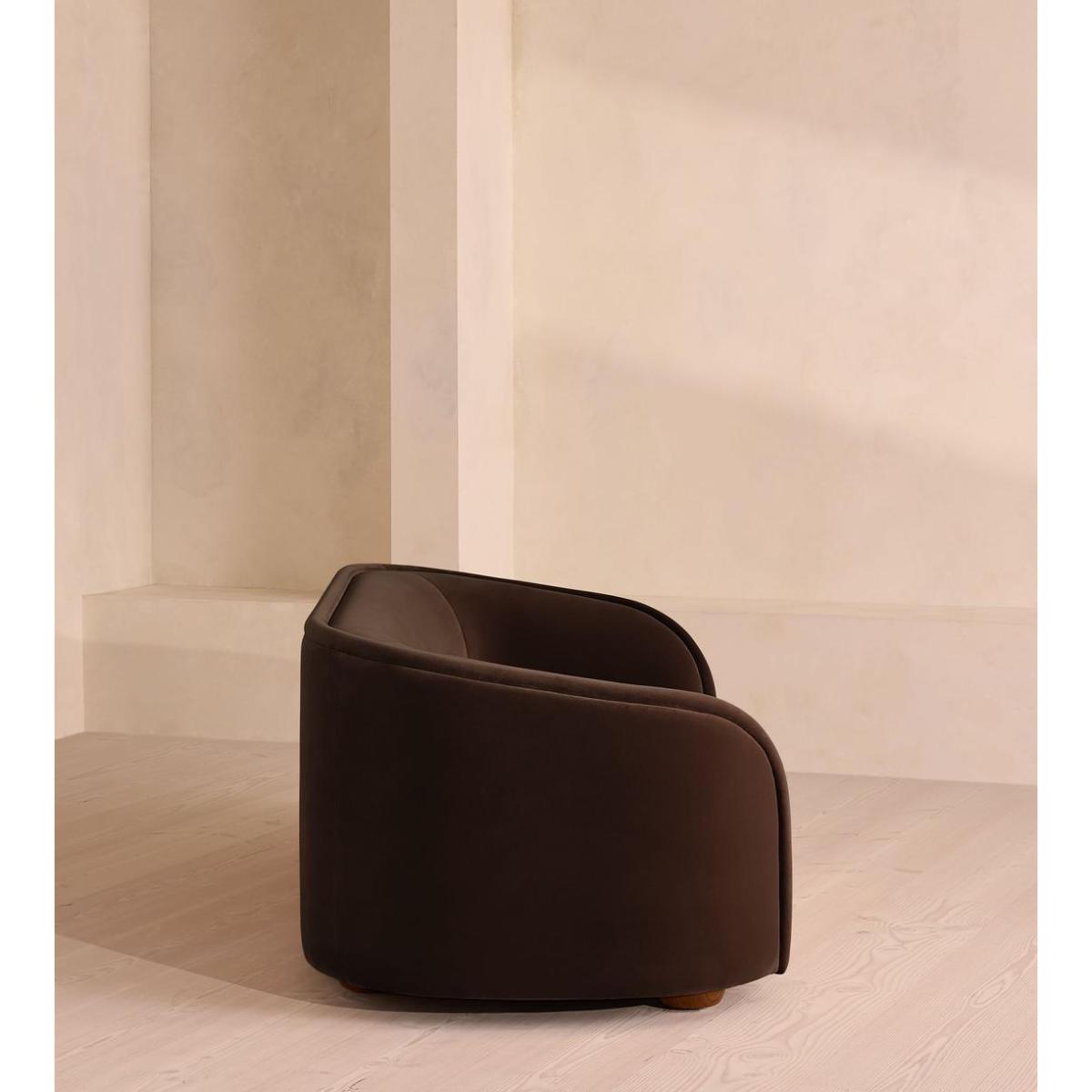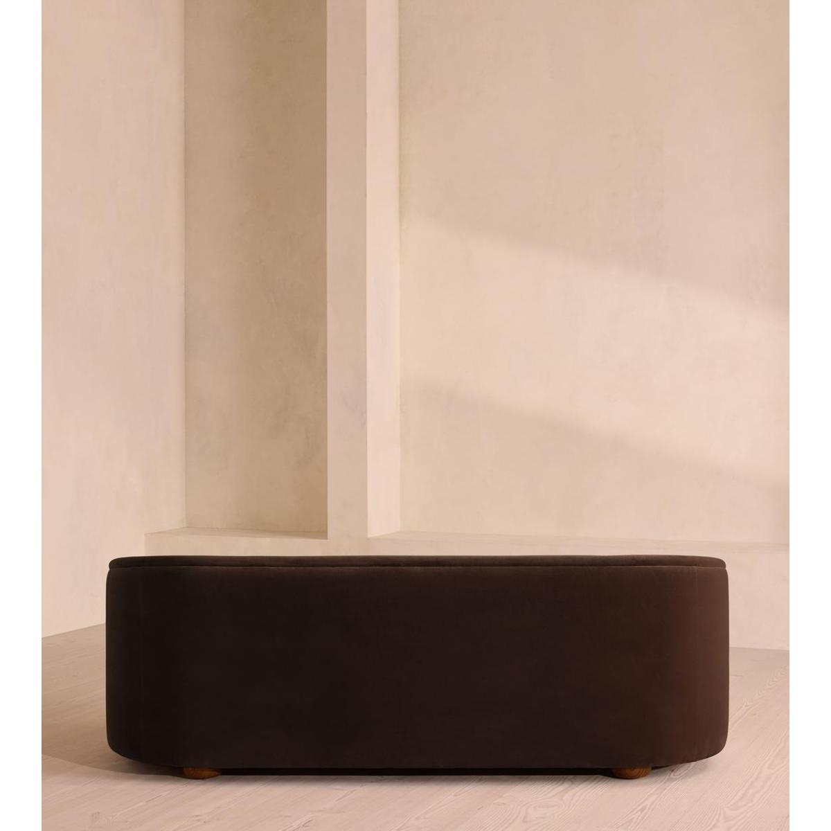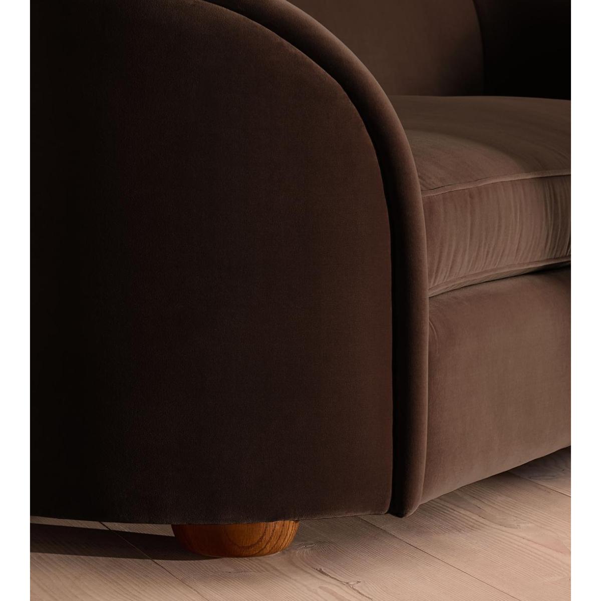 A curved backrest leads seamlessly into two arms to create a minimalist, cocooning shape. A seamless seat cushion alongside unified back and armrests give the Conall sofa a streamlined, minimalist silhouette, while the rounded sides keep it feeling cosy. It's fully upholstered in velvet, available in our full made-to-order palette, with bold, oversized piping following its curved lines.