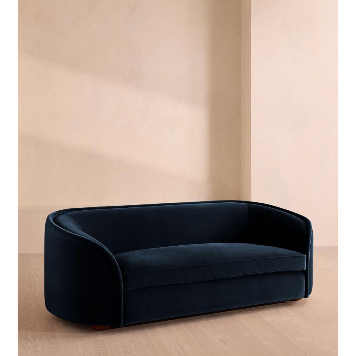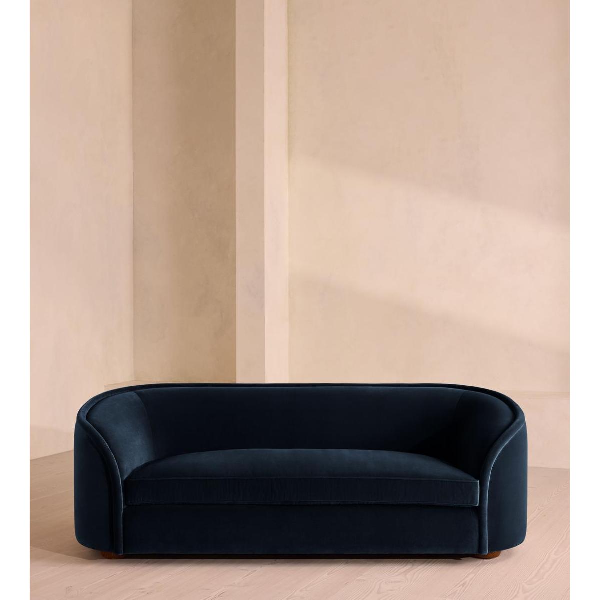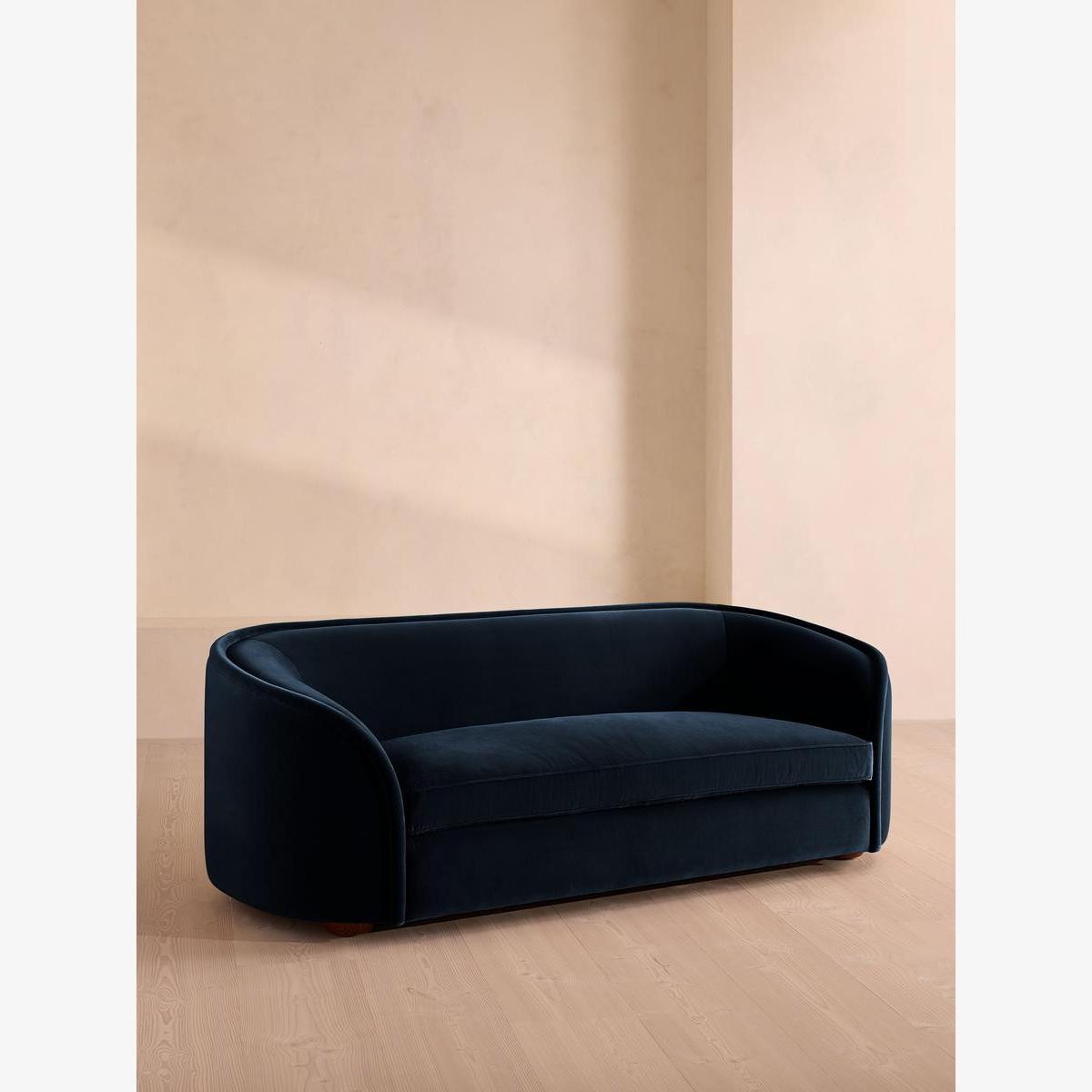 A curved backrest leads seamlessly into two arms to create a minimalist, cocooning shape. A seamless seat cushion alongside unified back and armrests give the Conall sofa a streamlined, minimalist silhouette, while the rounded sides keep it feeling cosy. It's fully upholstered in velvet, available in our full made-to-order palette, with bold, oversized piping following its curved lines.