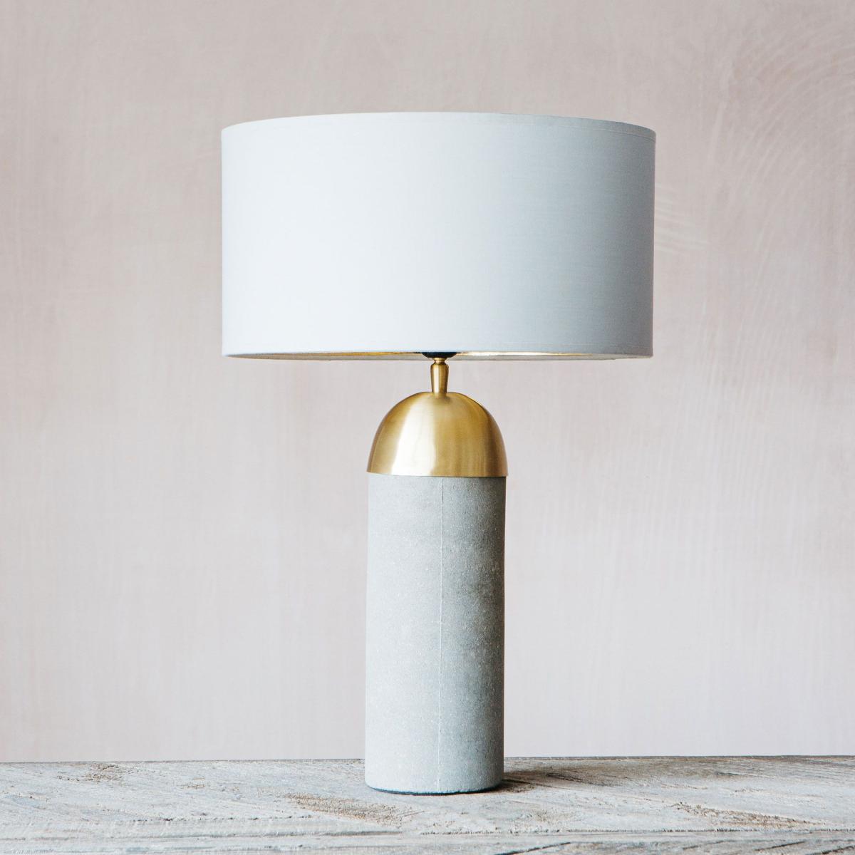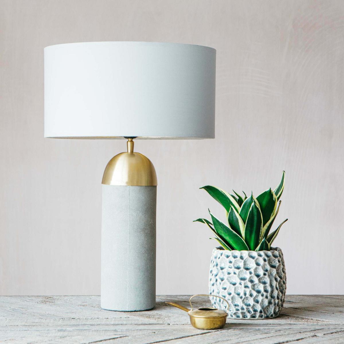 Cast from concrete into a satisfyingly smooth lamp base and finished with a sleek brass dome fixing. Top with a vibrant velvet lampshade for textural contrast.