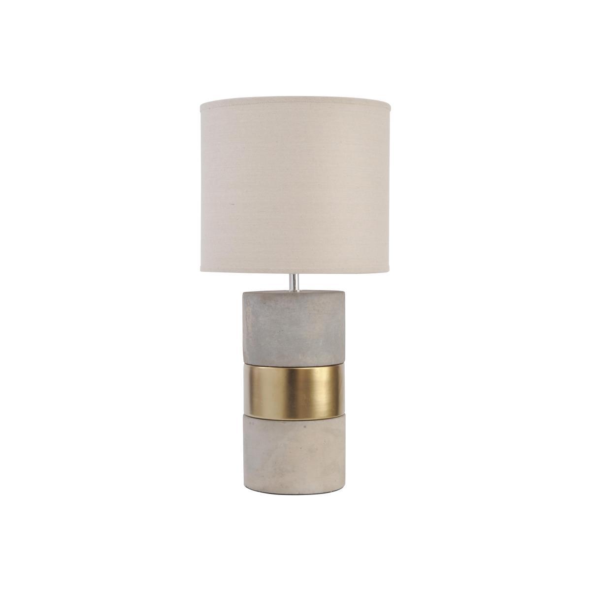 Industrial style meets contemporary glamour in this porcelain table lamp. Finished in the concrete look, with a band of gold reflecting the light. With a natural linen drum shade. Why you'll love it. Tall gold and concrete finish lamp table. Glamorous contemporary style with an industrial twist. Cylindrical base features a striking gold band. The porcelain base has a concrete look finish. Finished with a large, natural linen drum shade. What you need to know. Concrete look porcelain base. Gold metal detailing. Natural linen drum shade. Screw cap E27 60W bulb (not included). Dimensions. Width. 30 cm (11.8 inches). Depth. 30 cm (11.8 inches). Height. 63 cm (24.6 inches). Weight. 4 kg.