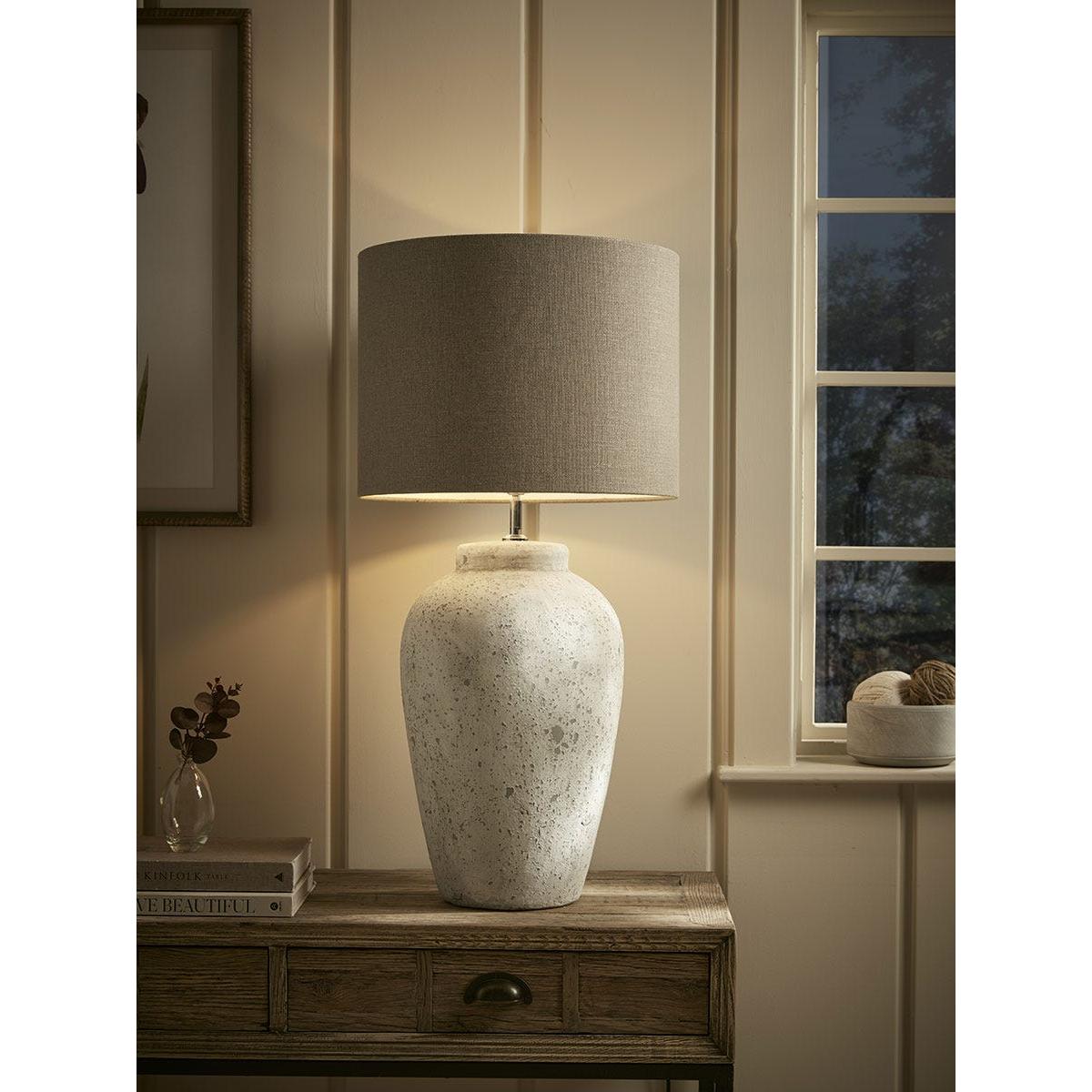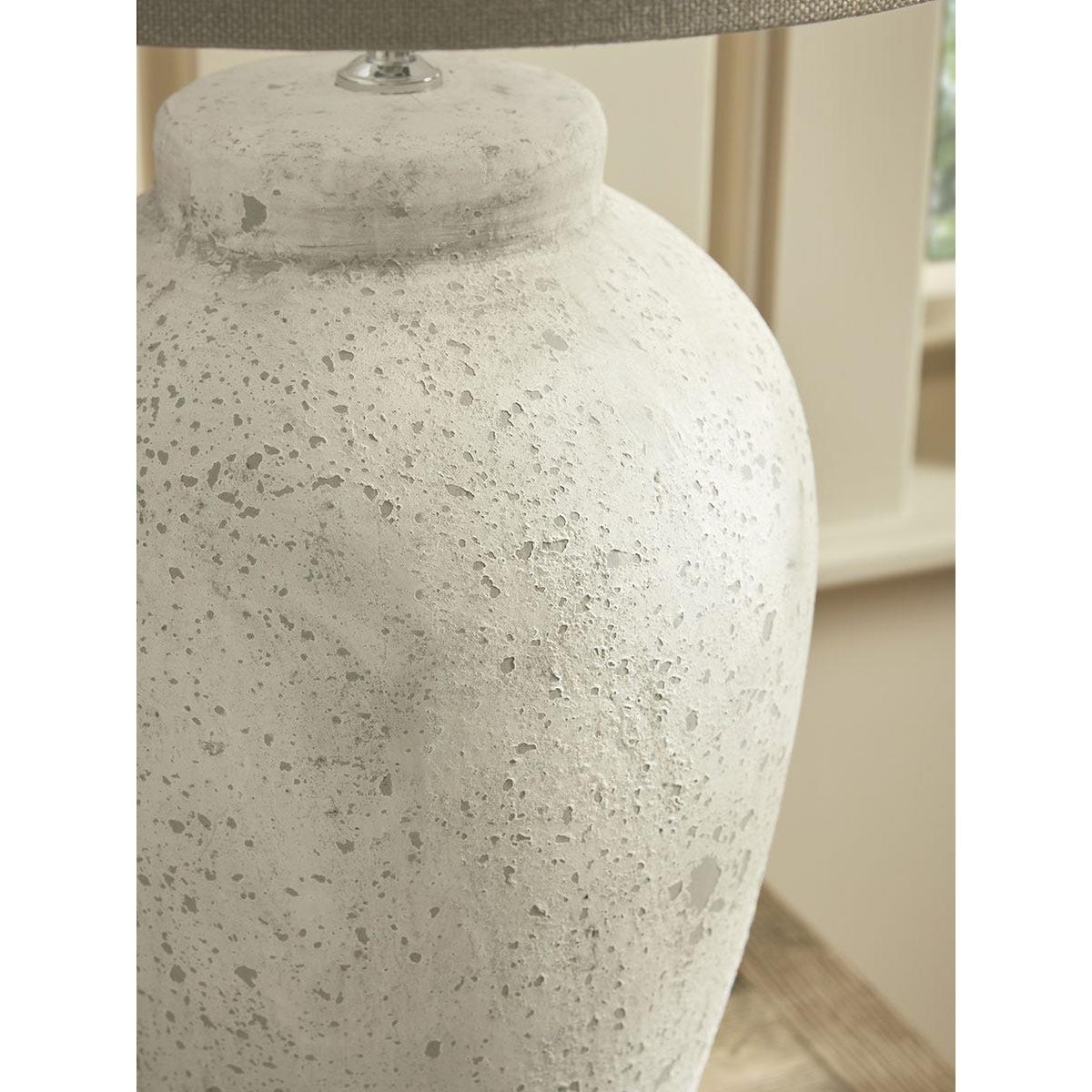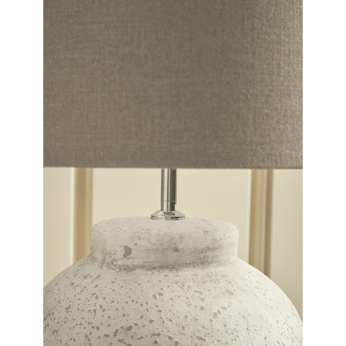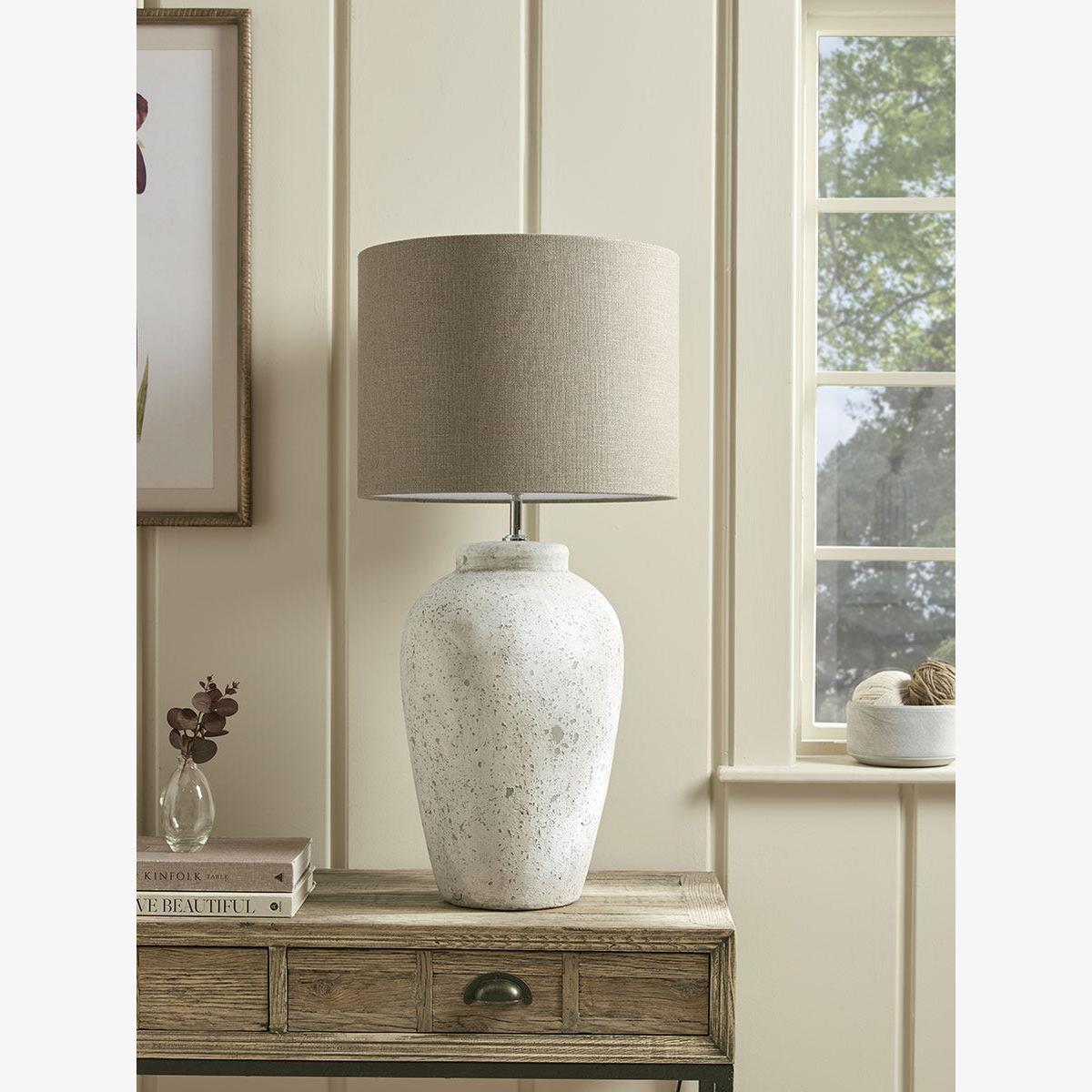 Light your home with the warming glow illuminated from our Concrete Effect Table Lamp. An urn shape base, crafted from ceramic, has a distressed finish creating the concrete effect and adding some individual character to your home, sitting wonderfully in our English Rural trend. Finished with a neutral shade, this lamp is ideal for a variety of homes.