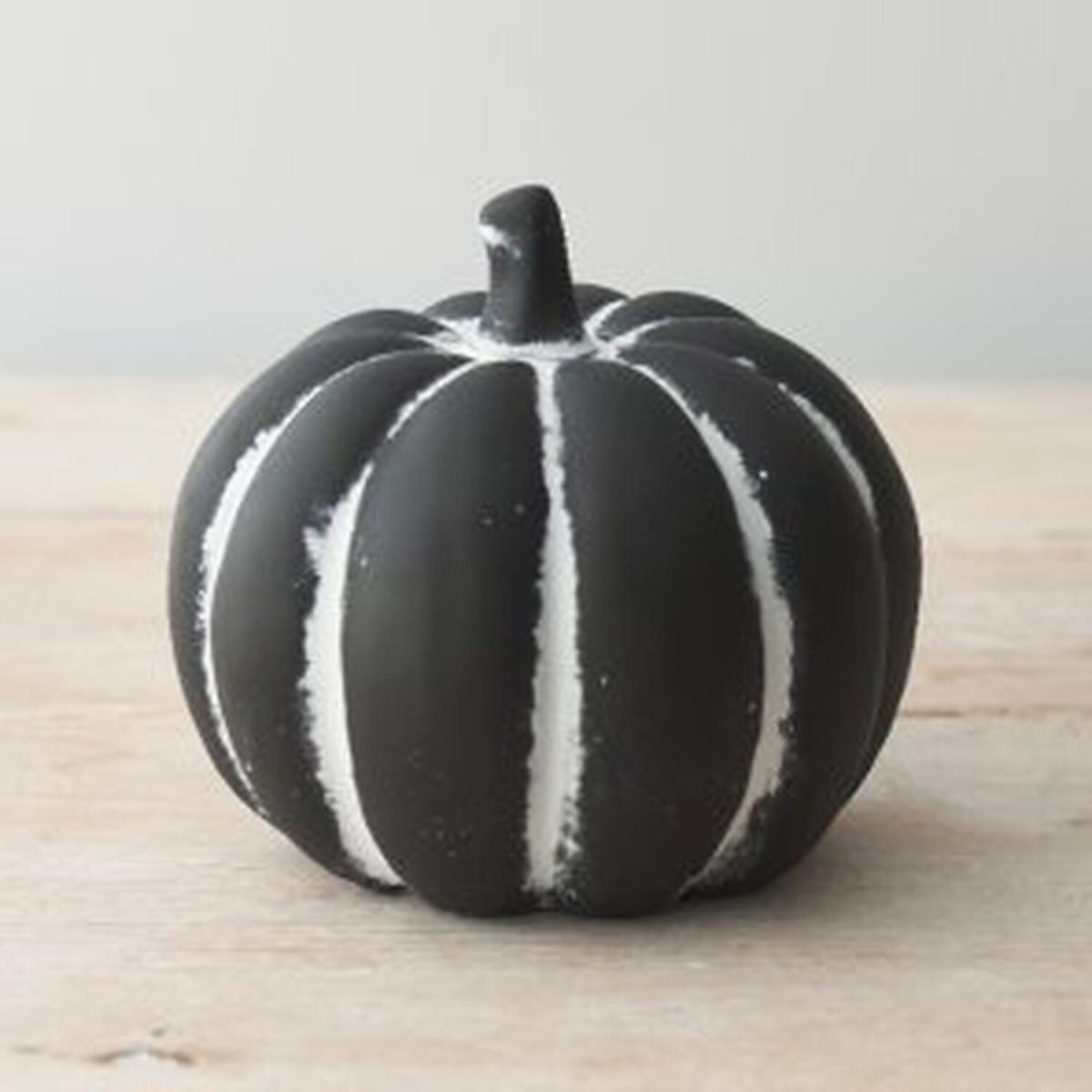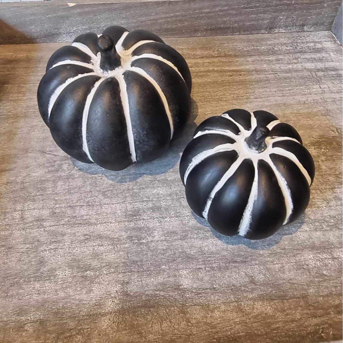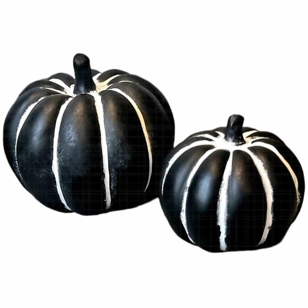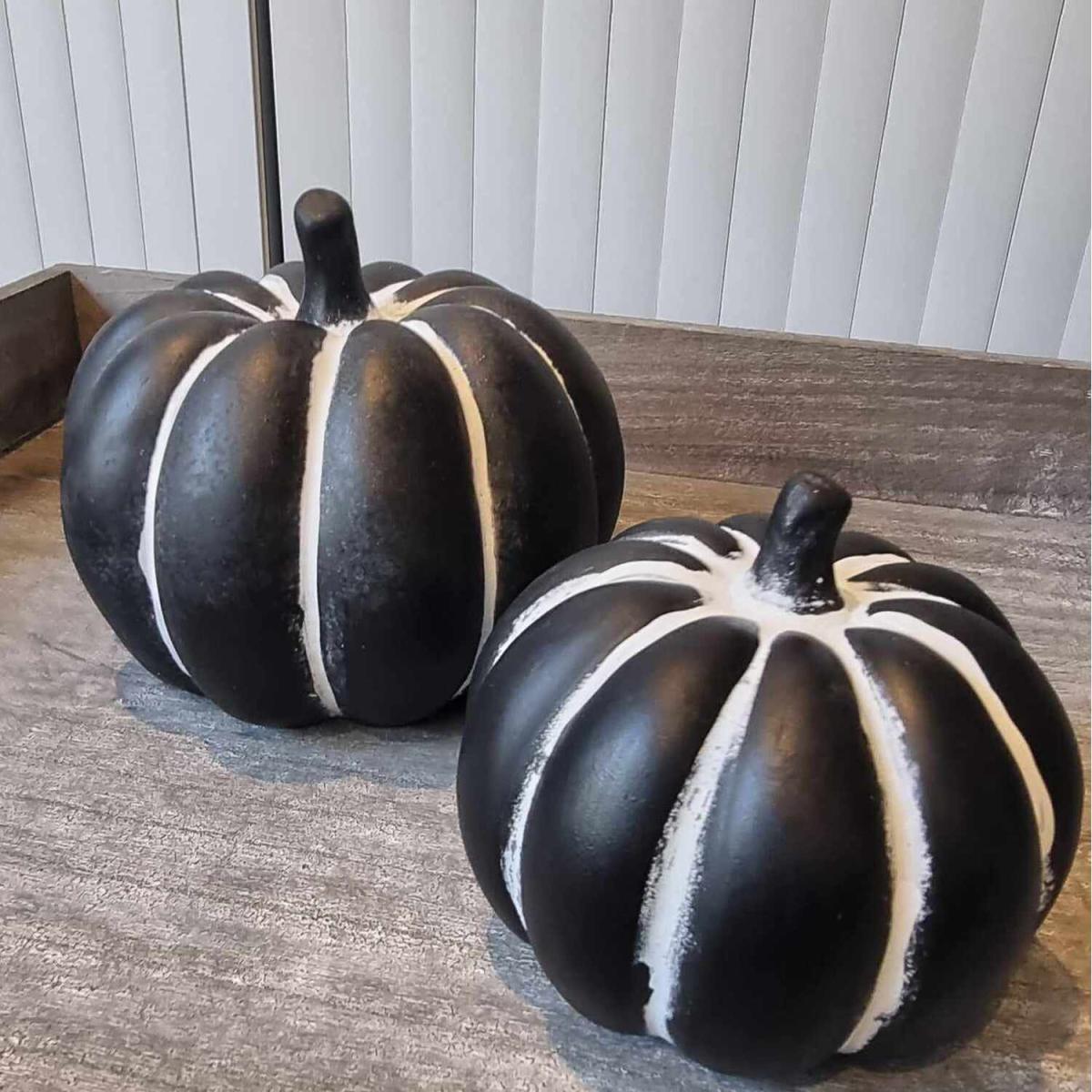 A stunning cement pumpkin, painted in black with white ridges. This is a rustic style ornament for the home and any imperfections are part of the painterly design and finish. The perfect decoration for your home this Autumn and Halloween season.