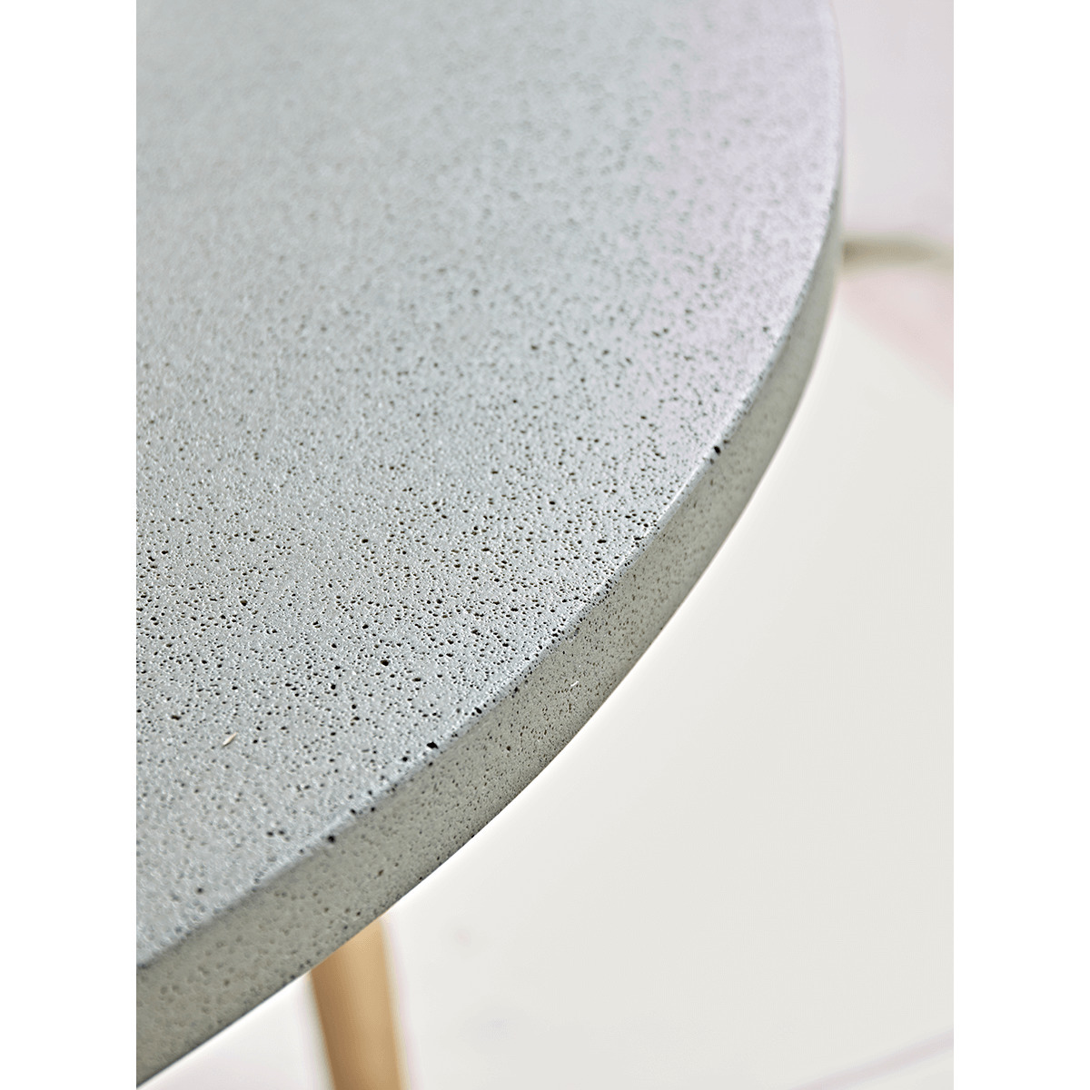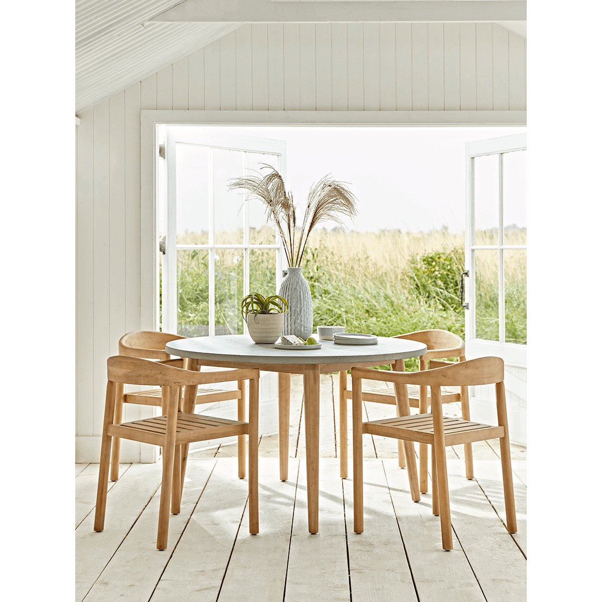 I love this round concrete topped dining table for its versatile, modern appeal and tactile contrast between the sleek surface and warm wooden legs. It works well in contemporary, industrial, or Scandi-inspired interiors, where its understated elegance can be dressed up or down. Practical styling tips include adding soft textiles like woven placemats or linen table runners to balance the hard surface, and pairing with a mix of wooden or upholstered chairs for a relaxed, eclectic look. Its neutral tone makes it adaptable to various colour schemes, from monochrome to muted pastels, making it a reliable centrepiece that brings a touch of raw, natural texture to the dining space.