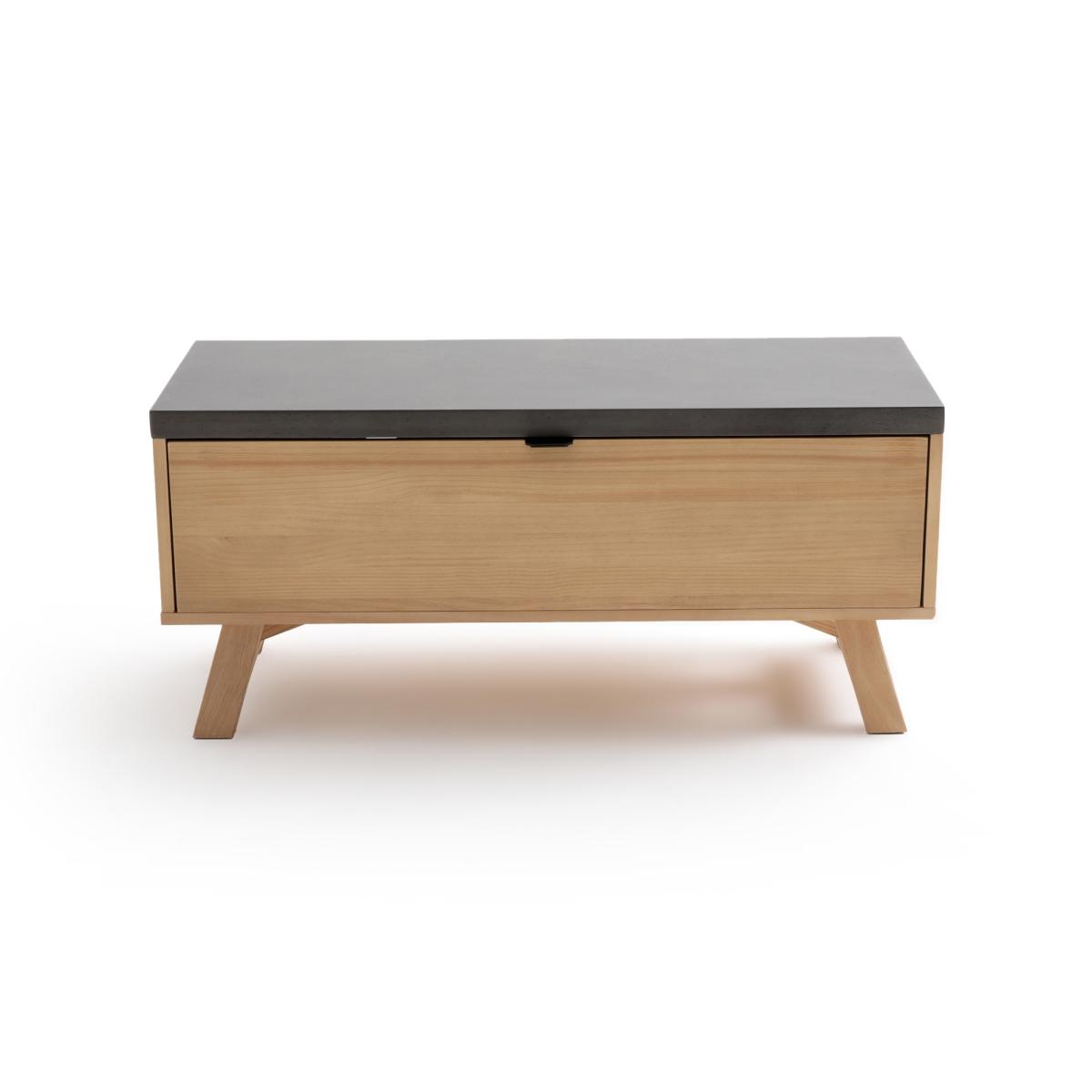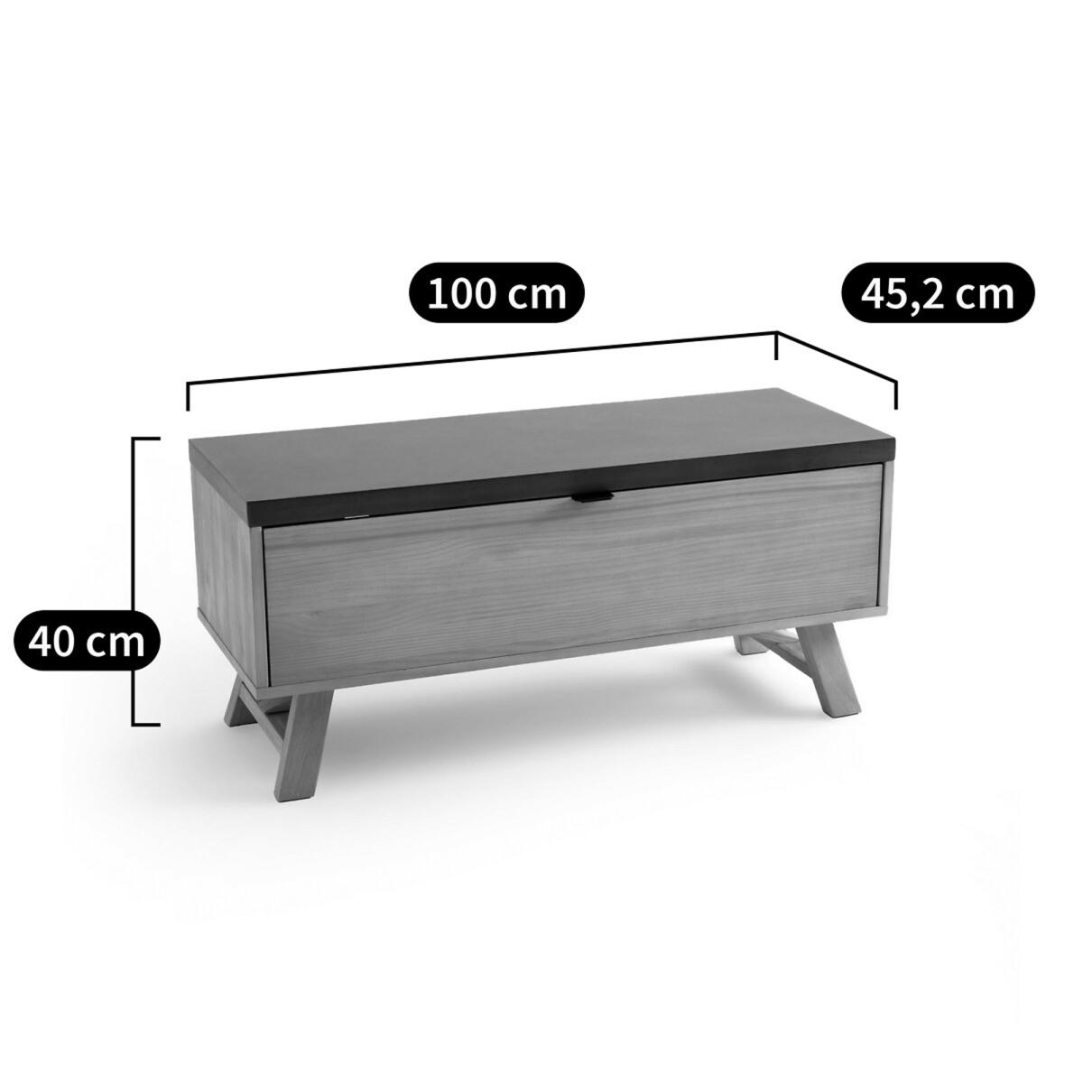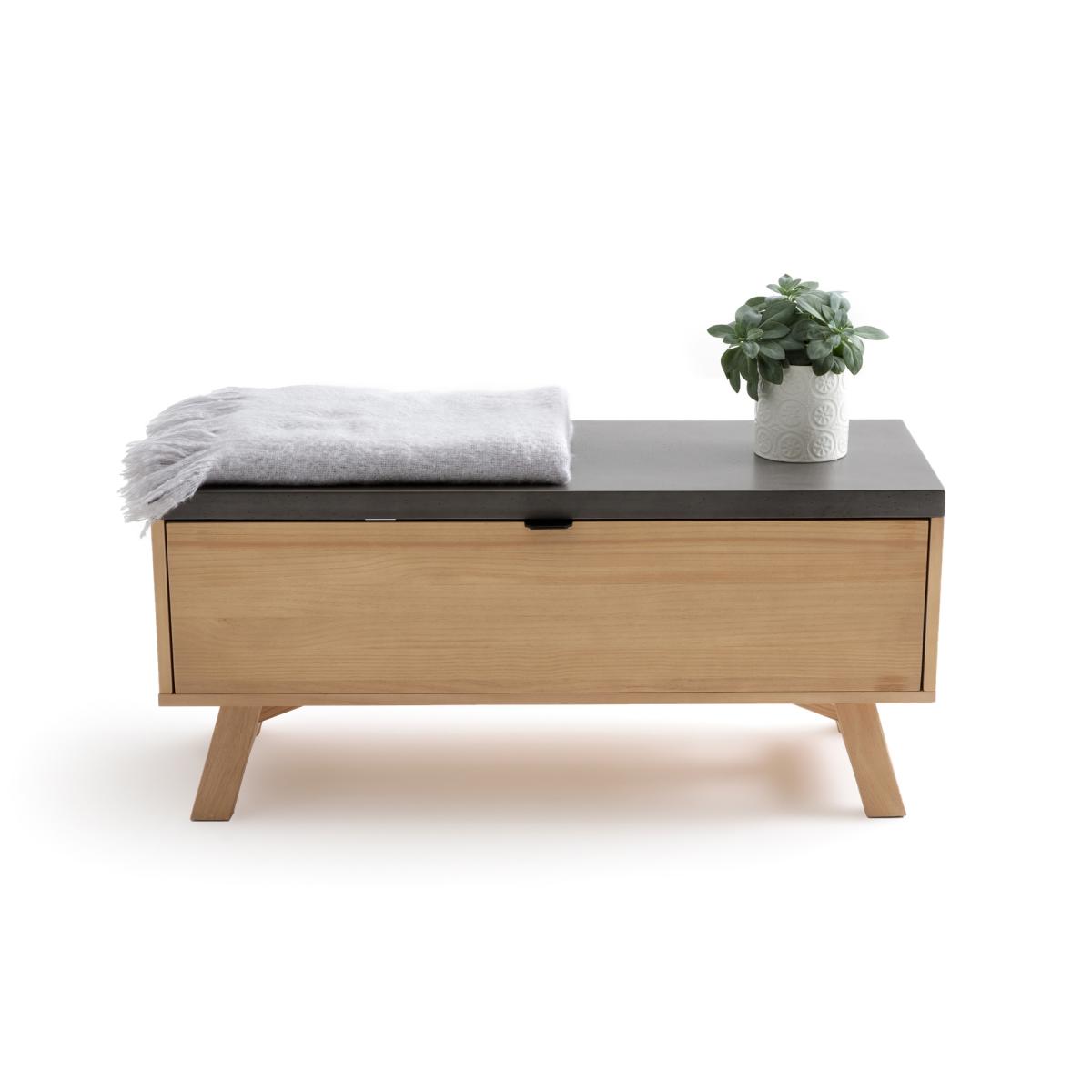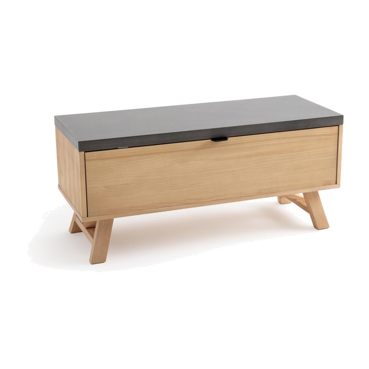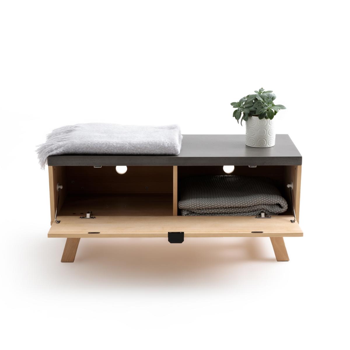 Our Concrite storage bench will be a welcome addition to any busy home. A style classic revisited, this solid chest is the perfect shape for keeping clutter at bay. We especially love the trompe l'oeil effect on the lid, which creates the illusion of concrete with its speckled pattern and metallic-style finish. Product details:. 1 Flap door. 2 compartments. Structure and frame in lightly brushed solid pine with stained oak and nitrocellulose varnish finish. Upper panel in MDF with concrete paint effect, nitrocellulose varnish finish. Handles in black metal epoxy finish. Dimensions. Width: 100cm. Height: 40cm. Depth: 45.2 cm. Dimensions of compartments: L47.2 x D36.1 x H23.1 cm. Dimensions and weight of package. 1 box. L110 x H16 x D52 cm. 20.6 kg. See the full Concrite collection online. Home delivery:Your Concrite bench is supplied for self-assembly. It will be delivered to your door by appointment. Note! Please check that all access points (doors, stairslifts) are wide enough to accommodate your delivery.