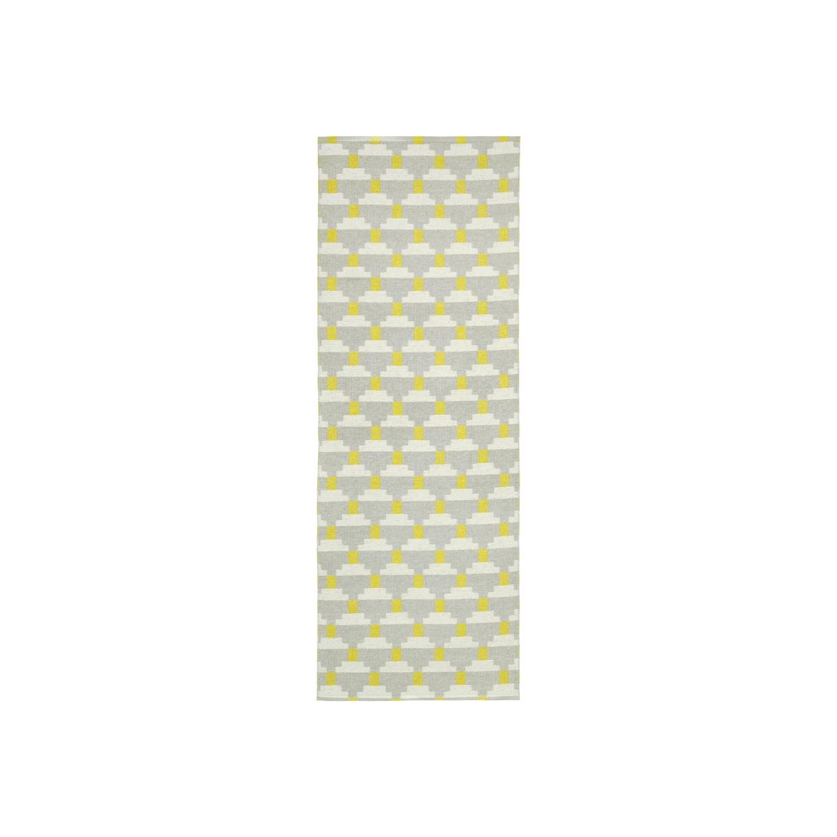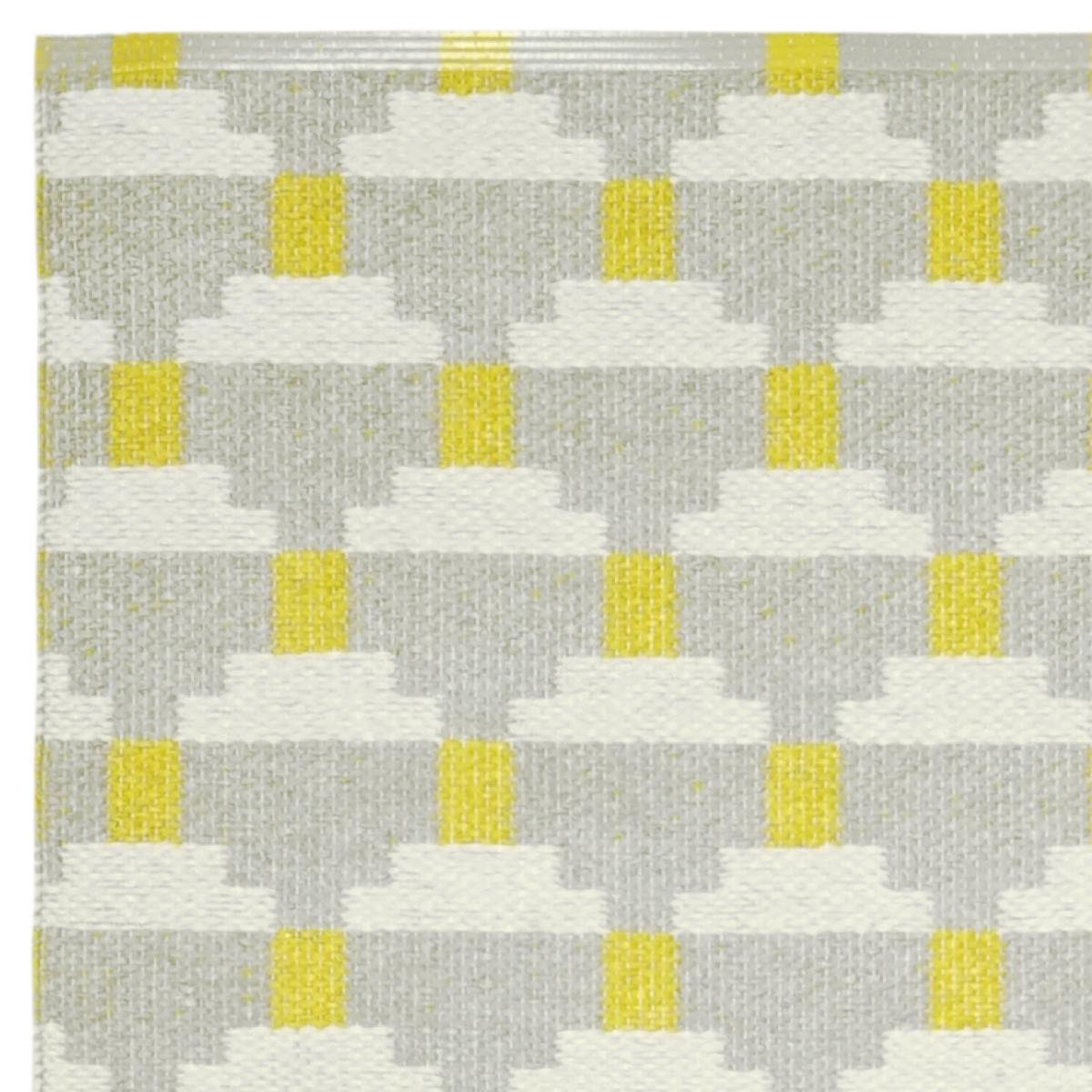 The trendy Confect rug in the color fog from Brita Sweden is woven in soft plastic foil with a reversible pattern in grey and yellow. The rug is available in different sizes and is both durable and easy to clean. Place it in the hallway or kitchen and combine it with other high quality products from Brita Sweden!.