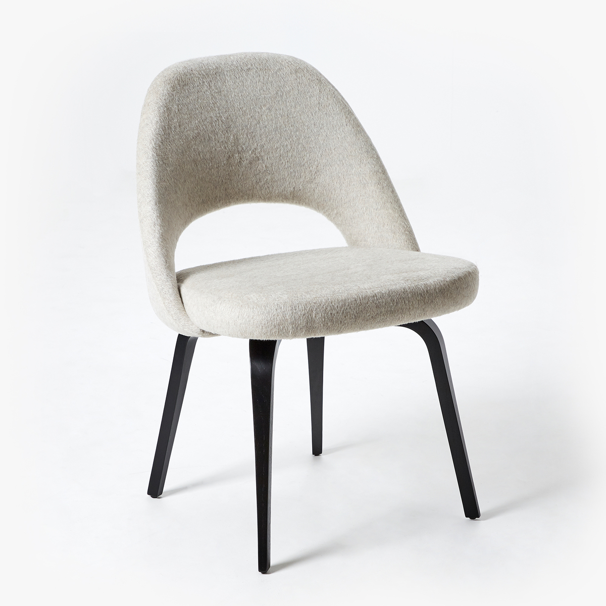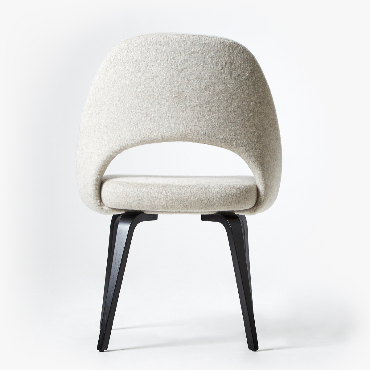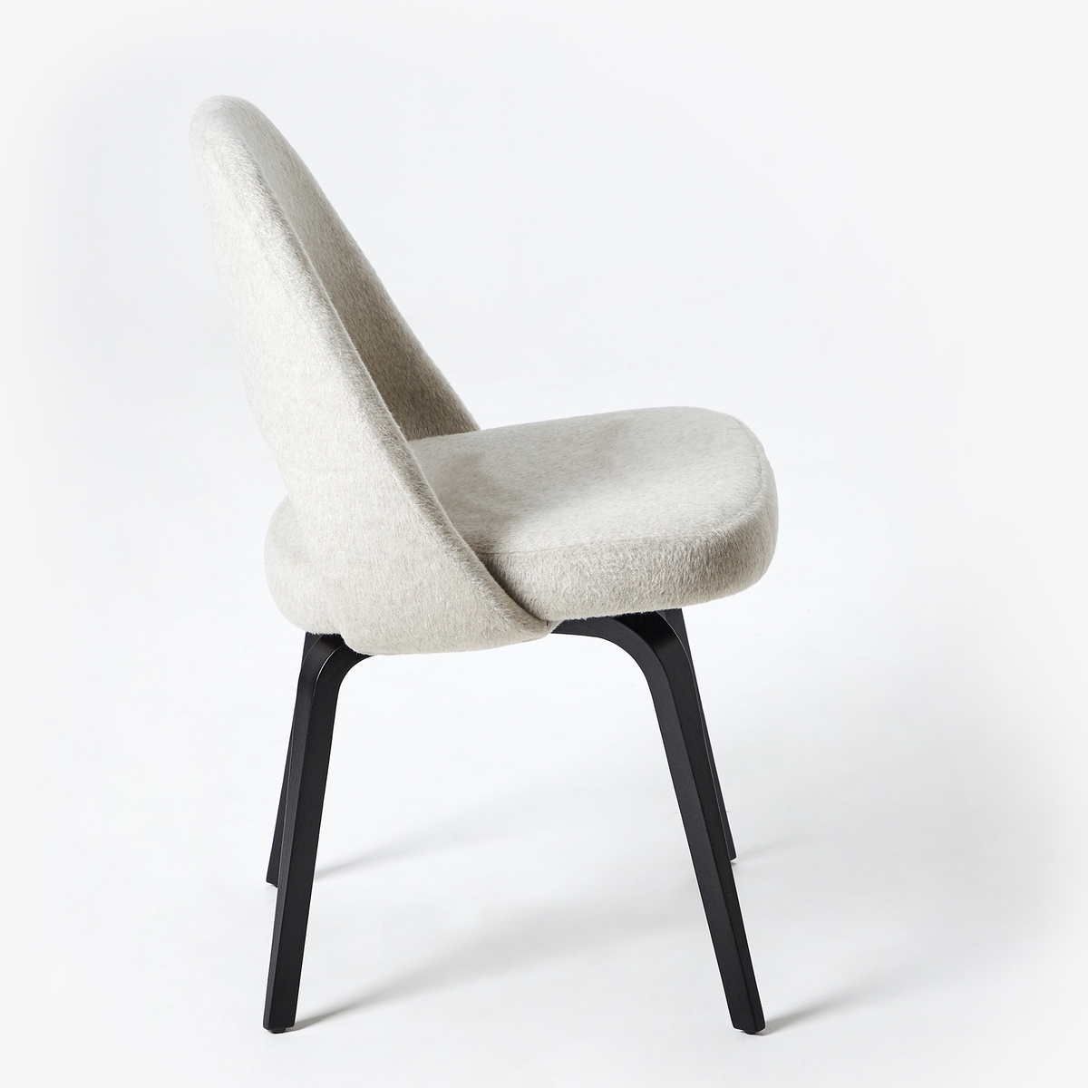 An iconic design by Eero Saarinen, this take on the Conference Chair awards it Knoll's luxe Colorado Sand upholstery and elegant ebonised walnut venner legs. Introduced in the 1950s and revolutionising the notion of what executive seating could be, the chair's simple, semi-circular shaping and a streamlined silhouette provided uncomplicated comfort. Its contemporary style is accented by the tactile Colorado Sand upholstery; a delightful wool-mohair-polyamide blend. Eero Saarinen was born into the design world, with his father Eliel working as the Director of the Cranbrook Academy of Art and his mother Loja a world-famous textile designer, but Eero is best known today for his neo-futuristic style and working closely with Knoll, which still exclusively produces his pieces.