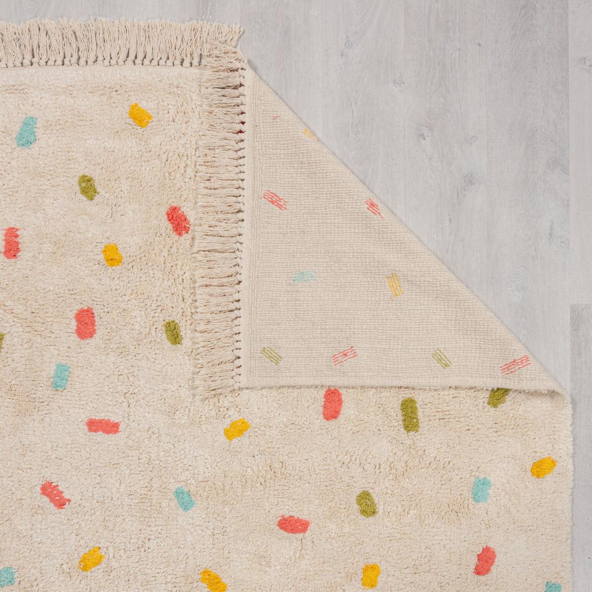 * 100% Cotton* Berber Style Design* Durable The Confetti Berber Rug adds a fun pop of colour to bedrooms, playrooms or nurseries. Made from supersoft 100% cotton, this rug is designed to last throughout the rough and tumble of playtime. The vibrant colour palette compliments the hand-crafted feel of this rug, with an easy to style palette bursting with confetti in bright colours that will compliment any décor changes throughout a child’s life. The rug pictured is 133cm x 230cm. Care Instructions: Unroll your rug and leave for 24 hours during first use. Maintain your rug by vacuuming regularly with a nozzle attachment. Cut any loose fibres with scissors, do not pull. For accidental spills blot immediately and spot clean with a damp white cloth and leave to dry. Add anti-slip underneath your rug to prevent slipping. Rotate every few months to prolong the life of your rug.