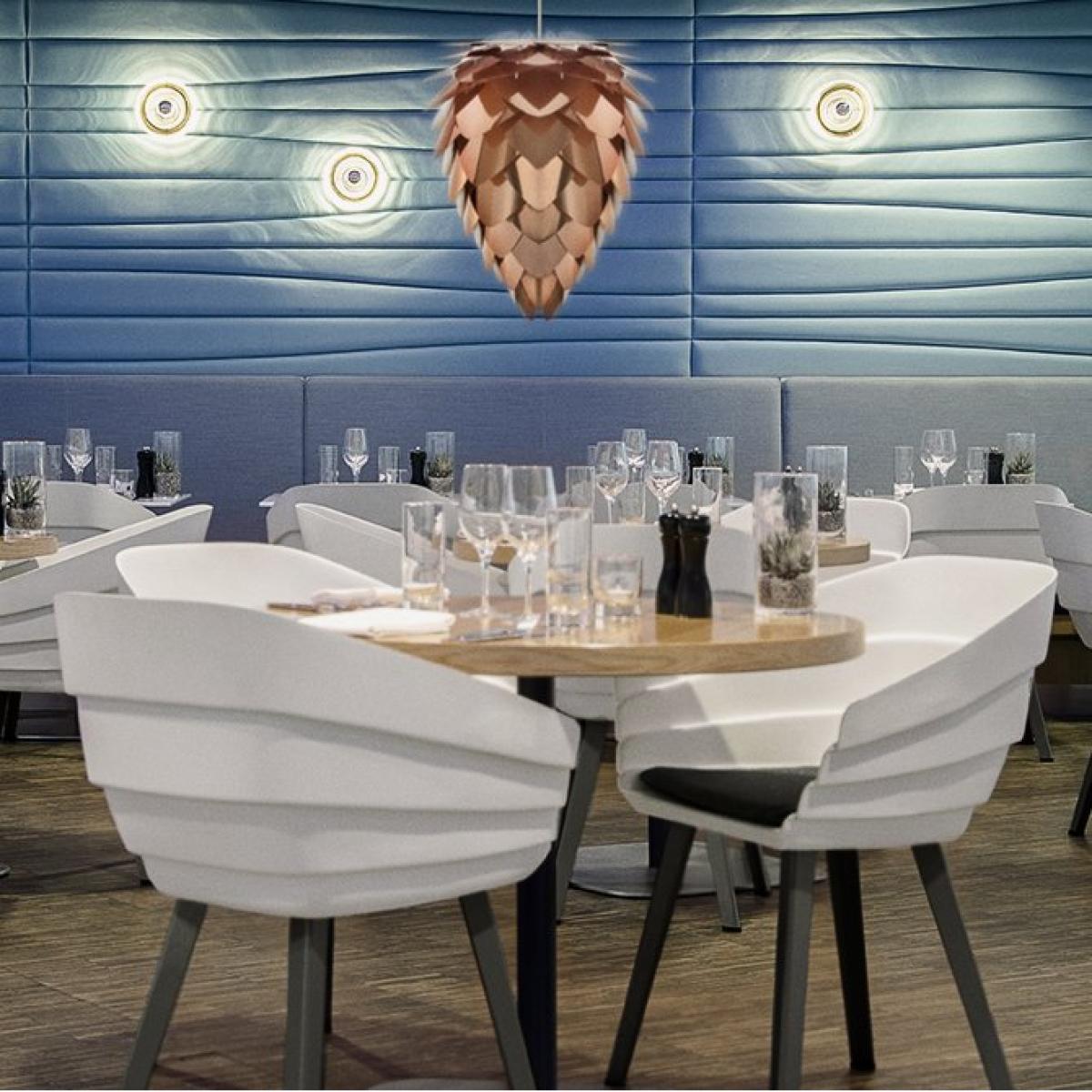 Create a glamorous look in your home with the modern Conia lamp in the color copper from Umage / Vita designed by Soren Ravn Christensen. Conia is a lamp shade made of polypropylene and plastic and comes unassembled in a flat box with easy mounting instructions. The lamp shade can be used both as a pendant lamp or a table lamp depending what you mount it on and spreads a warm and glowing light when lit! Choose between different sizes.