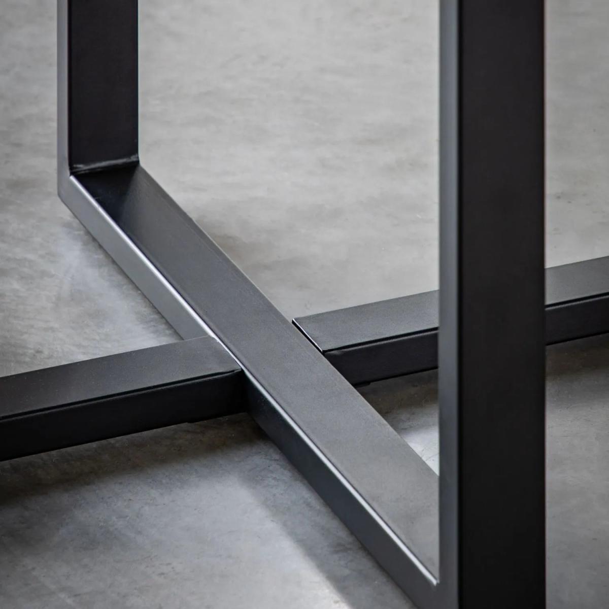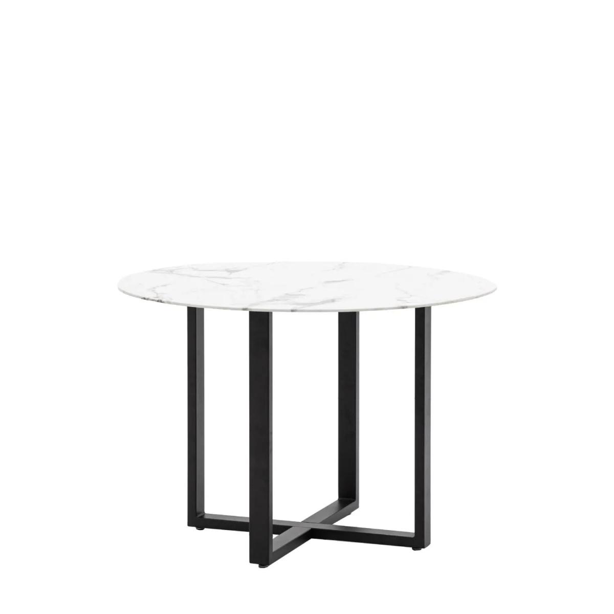 Add a touch of dramatic modern luxury to your dining space. With an eye catching faux white marble glass top and bold black crossover legs, this dining table will make a statement. Perfect for a smaller spaces where you still want to make a impact, this table seats 4.