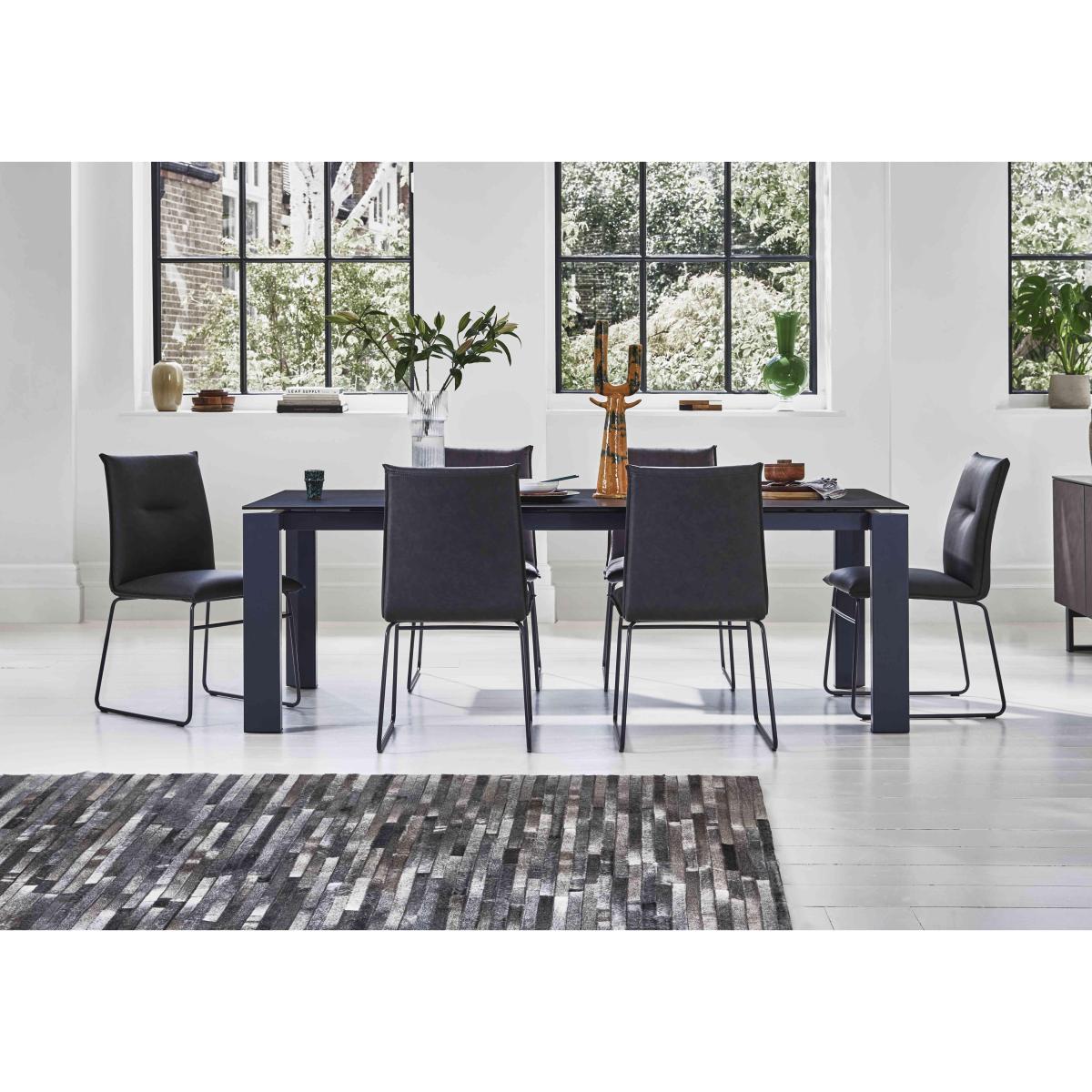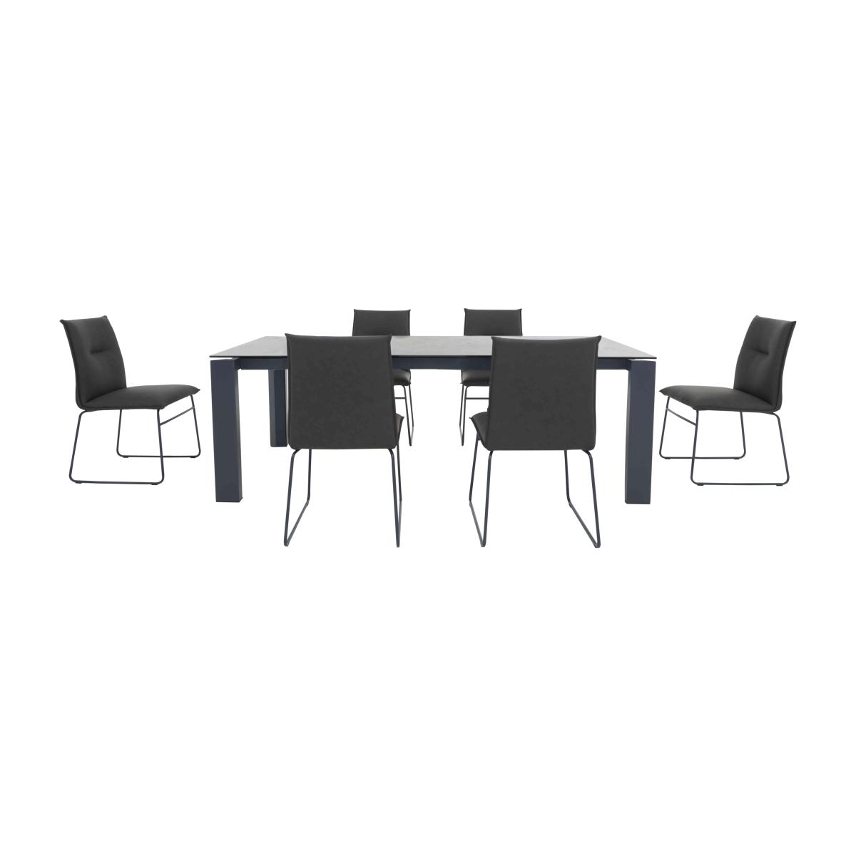The essence of Italian cool, the contemporary Calligaris Gate collection features strong lines, gorgeous finishes and useful functionality. The range centres on a stunning Italian-made dining table that extends to seat ten with a high-precision rotating mechanism. The ceramic top, available in a choice of colours including Furniture Village-exclusive bronze, and black metal frame strike the perfect balance between style and practicality. Pair it with the stunning Calligaris Maya dining chair with ski-style legs or choose one of our ready-made dining sets. Part of the Connubia by Calligaris collection. You won’t find this Connubia by Calligaris dining set anywhere else. Created just for us, the table features a Furniture Village-exclusive grey metal frame and legs paired with a beautiful ceramic top. Why you'll love it. Statement Italian dining set stylishly combines ceramic and metal. Bold contemporary design. Extending dining table has a hardwearing ceramic top in lead grey. Furniture Village-exclusive matt grey metal frame and legs. High-precision rotating extension mechanism reveals pattern-matched leaf. For dining comfort, legs remain at the table corners when extended. Set includes 6 Maya dining chairs with black metal ski-style legs. Faux leather upholstery has a lightly distressed vintage texture. Made in Italy. This dining set is part of the Connubia by Calligaris Gate range. What you need to know. Table top is made of ceramic coupled to glass. Table has metal frame and legs. Chair seat cushioning is made of foam. Chair frame is made of metal. Extra-large 220 cm dining table seats 10, and 12 when extended. Ceramic finish is highly resistant to scratches, impact, heat and chemical substances. Not 100% heatproof. Please use coasters and placemats at all times. Easy to care for. Simply wipe with a clean damp cloth.