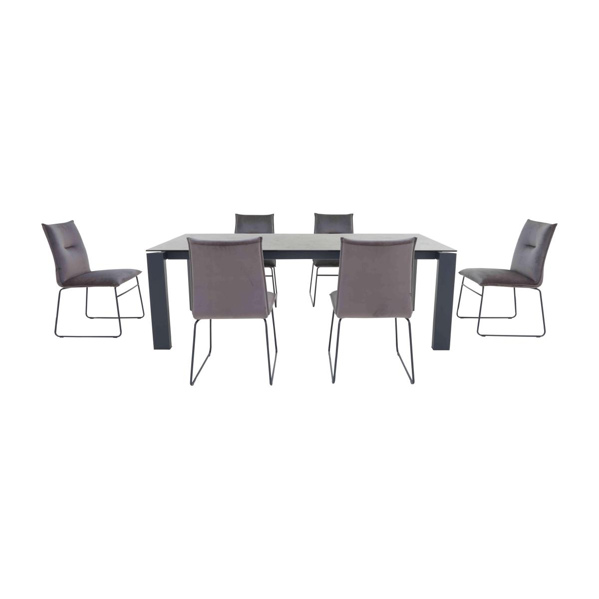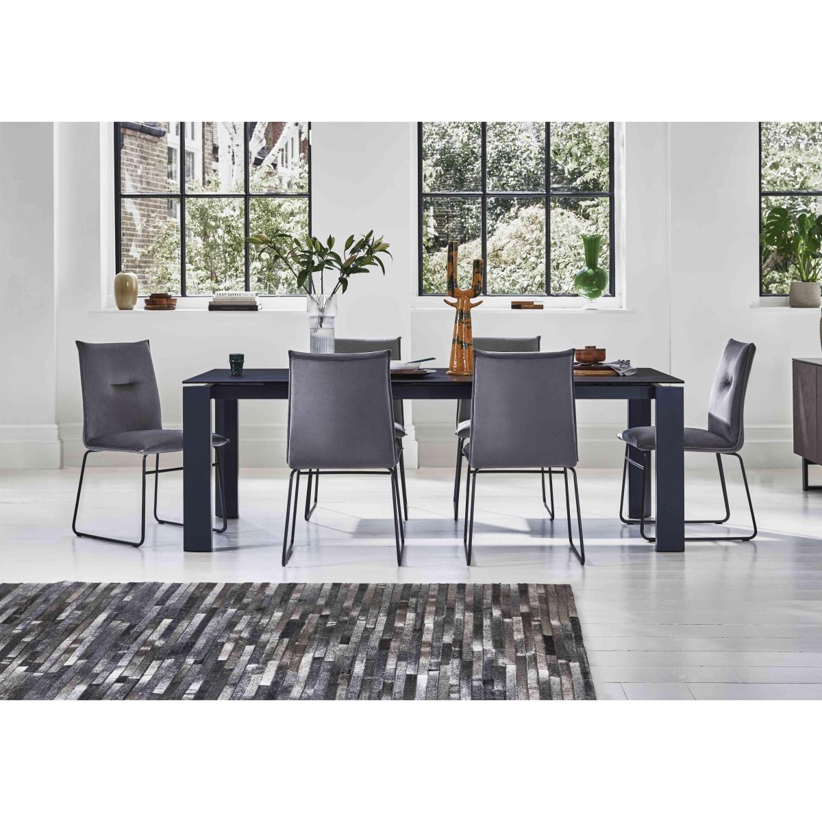 The essence of Italian cool, the contemporary Calligaris Gate collection features strong lines, gorgeous finishes and useful functionality. The range centres on a stunning Italian-made dining table that extends to seat ten with a high-precision rotating mechanism. The ceramic top, available in a choice of colours including Furniture Village-exclusive bronze, and black metal frame strike the perfect balance between style and practicality. Pair it with the stunning Calligaris Maya dining chair with ski-style legs or choose one of our ready-made dining sets. Part of the Connubia by Calligaris collection. We love the on-trend combination of the industrial-look ceramic and metal dining table with the soft velvet-upholstered dining chairs. Made in Italy. Why you'll love it. This ceramic and metal dining set showcases cool Italian style. Bold contemporary design. Extending dining table has a hardwearing ceramic top in lead grey. Furniture Village-exclusive matt grey metal frame and legs. High-precision rotating extension mechanism reveals pattern-matched leaf. For dining comfort, legs remain at the table corners when extended. Set includes 6 Maya dining chairs with black metal ski-style legs. Upholstered in soft luxurious velvet. Made in Italy. This dining set is part of the Connubia by Calligaris Gate range. What you need to know. Table top is made of ceramic coupled to glass. Table has metal frame and legs. Chair seat cushioning is made of foam. Chair frame is made of metal. Extra-large 220 cm dining table seats 10, and 12 when extended. Ceramic finish is highly resistant to scratches, impact, heat and chemical substances. Not 100% heatproof. Please use coasters and placemats at all times. Easy to care for. Simply wipe with a clean damp cloth. Flattening and shading of heavy wear areas on velvet is unavoidable. Pile fabrics may be vacuumed lightly using the curtain attachment. Brush regularly in the direction of the pile with a soft brush.