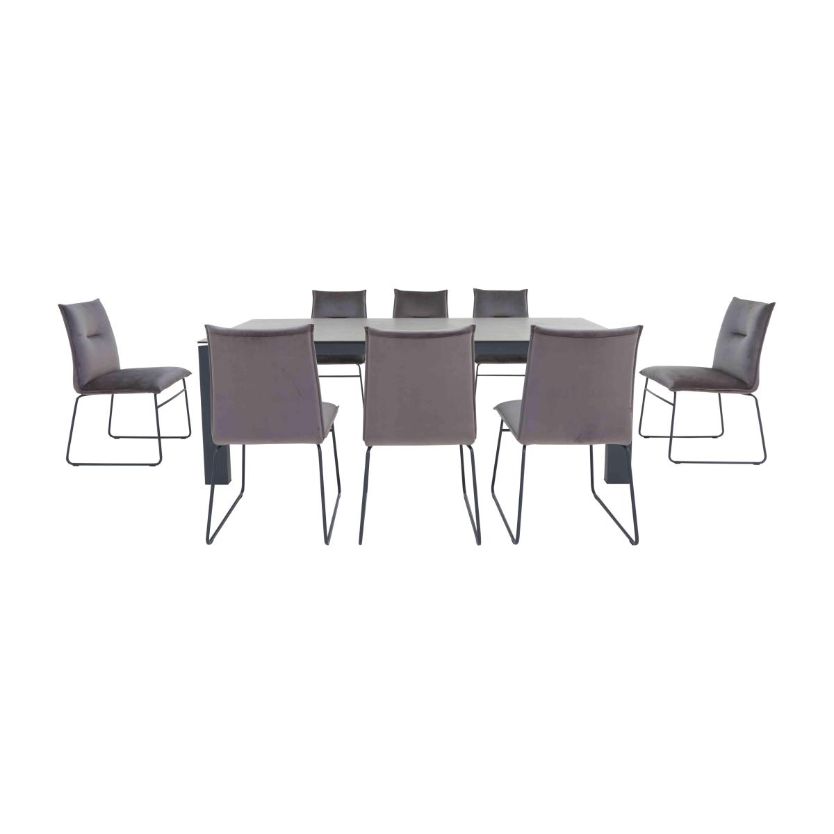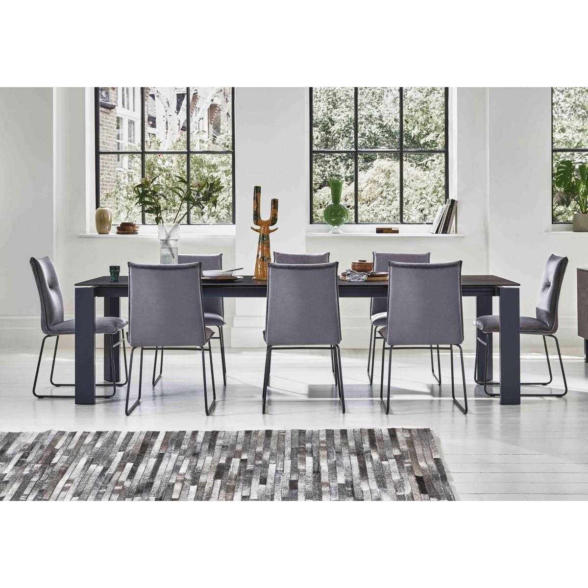 The essence of Italian cool, the contemporary Calligaris Gate collection features strong lines, gorgeous finishes and useful functionality. The range centres on a stunning Italian-made dining table that extends to seat ten with a high-precision rotating mechanism. The ceramic top, available in a choice of colours including Furniture Village-exclusive bronze, and black metal frame strike the perfect balance between style and practicality. Pair it with the stunning Calligaris Maya dining chair with ski-style legs or choose one of our ready-made dining sets. Part of the Connubia by Calligaris collection. This Italian-made dining set delivers plenty of cool modern style thanks to the ceramic and metal finish and beautiful velvet dining chairs. Why you'll love it. This very cool Italian dining set balances industrial finishes with velvet dining chairs. Bold contemporary design. Extending dining table has a hardwearing ceramic top in lead grey. Furniture Village-exclusive matt grey metal frame and legs. High-precision rotating extension mechanism reveals pattern-matched leaf. For dining comfort, legs remain at the table corners when extended. Set includes 8 Maya dining chairs with black metal ski-style legs. Upholstered in soft luxurious velvet. Made in Italy. This dining set is part of the Connubia by Calligaris Gate range. What you need to know. Table top is made of ceramic coupled to glass. Table has metal frame and legs. Chair seat cushioning is made of foam. Chair frame is made of metal. Extra-large 220 cm dining table seats 10, and 12 when extended. Ceramic finish is highly resistant to scratches, impact, heat and chemical substances. Not 100% heatproof. Please use coasters and placemats at all times. Easy to care for. Simply wipe with a clean damp cloth. Flattening and shading of heavy wear areas on velvet is unavoidable. Pile fabrics may be vacuumed lightly using the curtain attachment. Brush regularly in the direction of the pile with a soft brush.