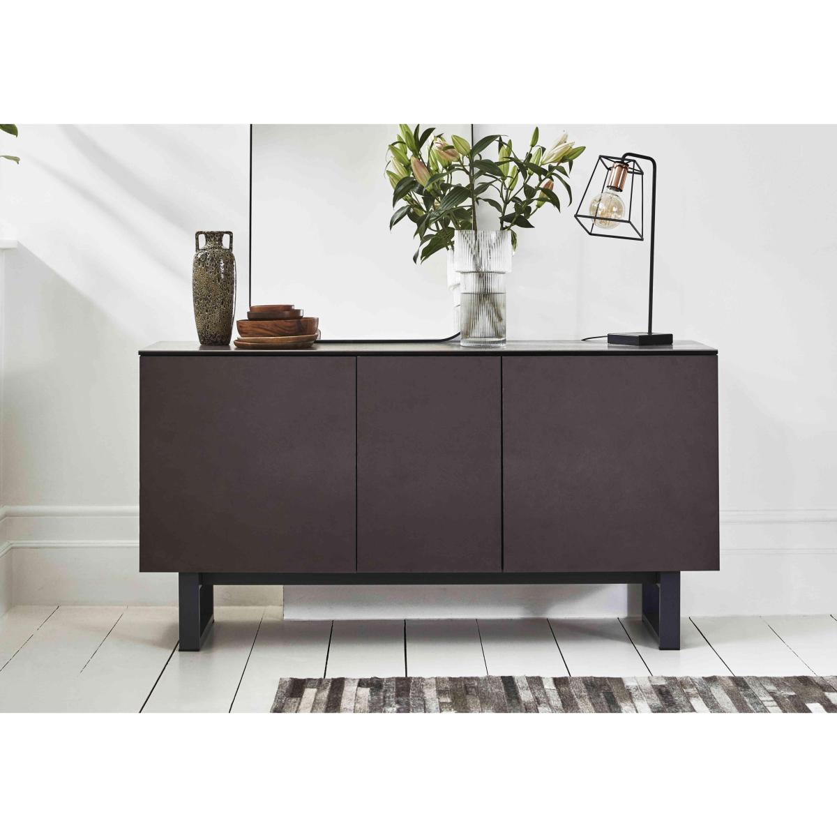 The essence of Italian cool, the contemporary Calligaris Gate collection features strong lines, gorgeous finishes and useful functionality. The range centres on a stunning Italian-made dining table that extends to seat ten with a high-precision rotating mechanism. The ceramic top, available in a choice of colours including Furniture Village-exclusive bronze, and black metal frame strike the perfect balance between style and practicality. Pair it with the stunning Calligaris Maya dining chair with ski-style legs or choose one of our ready-made dining sets. Part of the Connubia by Calligaris collection. In a dark cement cabinet finish created just for us, this contemporary ceramic sideboard delivers plenty of on-trend style as well as roomy dining room storage. Why you'll love it. A special Furniture Village edition of this very cool ceramic sideboard. Bold contemporary design. Hardwearing ceramic lead grey top and frame in Furniture Village-exclusive dark cement. Furniture Village-exclusive matt grey metal legs. Sleek handleless design. Soft close cupboard doors have a push-pull opening mechanism. Made in Italy. This sideboard is part of the Connubia by Calligaris Gate range. What you need to know. Top and frame are finished with ceramic coupled to glass. Metal base. 3 cupboards, 2 large and 1 small. 1 adjustable tempered glass shelf in each cupboard. Ceramic finish is highly resistant to scratches, impact, heat and chemical substances. Not 100% heatproof. Please use coasters and placemats at all times. Easy to care for. Simply wipe with a clean damp cloth. Tighten the leg bolts every three to four months. WARNING!. Furniture can tip over unexpectedly and cause injury. This item must be fixed to a wall using the anti-tip kit provided. Be sure to use the correct wall fixings suitable for the walls in your home. Furniture Village is not able to fix anti-tip devices for you. Seek professional advice if you are unsure.