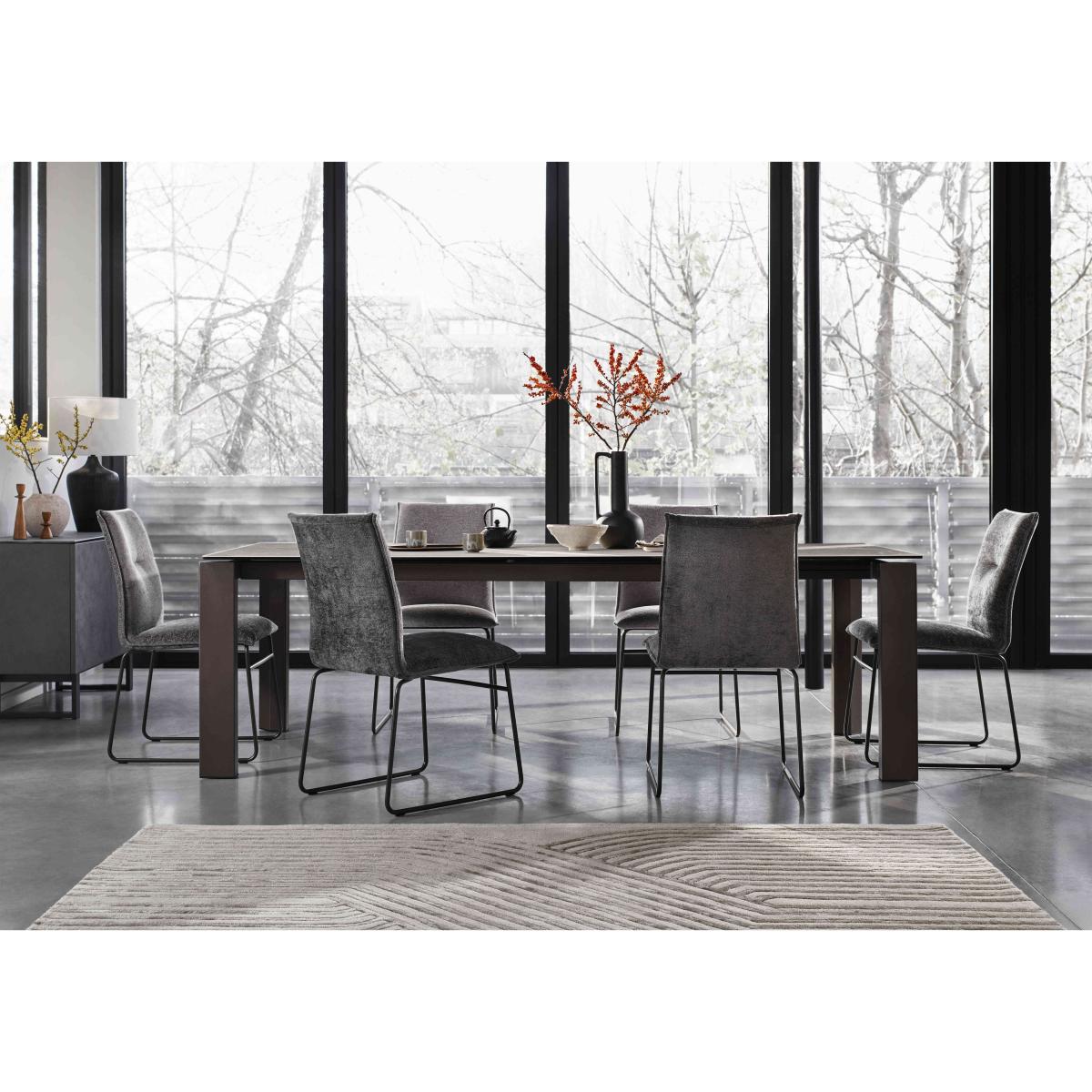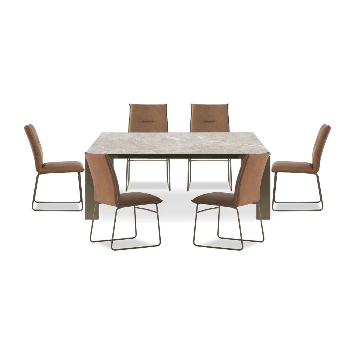 Dine in contemporary Italian style with this dining set from Connubia. The extending dining table has a grey ceramic top and metal legs. Set includes six dining chairs. Why you'll love it Contemporary design, high performance, seamless finish. By Connubia, mastercrafters of modern Italian furniture. Beautifully crafted dining set brings together striking finishes and on-trend tones. Dining table has a gorgeous grey marble-effect ceramic top and metal legs. High-precision rotating extension mechanism produces an extra leaf from the table. Seats up to 10. Extended or closed, table legs stay at the corners for the comfort of your guests. Designed to be enjoyed every day – ceramic is exceptionally hardwearing. This dining set includes 6 dining chairs with on-trend ski-style legs. Chairs are upholstered in lightly distressed faux leather in a choice of colour. Made in Italy. This dining set is part of the Connubia Viola range. What you need to know Chairs are cushioned with foam and have metal legs. Table top is made of ceramic coupled to glass. Metal frame and legs. Large 180 cm dining table seats 8, and 10 when extended. When this table is extended, there will be a very small gap between the extra leaf and the table top. Ceramic finish is highly resistant to scratches, impact, heat and chemical substances. Not 100% heatproof. Please use coasters and placemats at all times. Easy to care for. Simply wipe with a clean damp cloth.