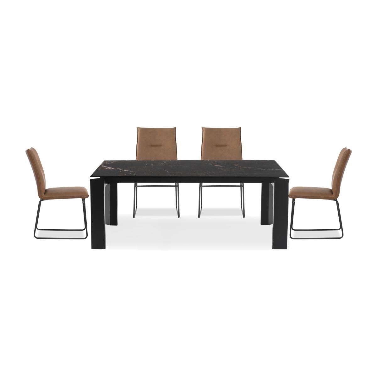 This contemporary dining set from Connubia strikes the perfect balance between striking and elegant. The dramatic black marbled ceramic dining table extends to seat 12. Made in Italy. Why you'll love it Contemporary design, high performance, seamless finish. By Connubia, mastercrafters of modern Italian furniture. Beautifully crafted dining set brings together striking finishes and on-trend tones. Dining table has a dramatic black and gold marble-effect ceramic top and wooden legs. High-precision rotating extension mechanism produces an extra leaf from the table. Seats up to 12. Extended or closed, table legs stay at the corners for the comfort of your guests. Designed to be enjoyed every day – ceramic is exceptionally hardwearing. This dining set includes 4 dining chairs with on-trend ski-style legs. Chairs are upholstered in lightly distressed faux leather in a choice of colour. Made in Italy. This dining set is part of the Connubia Viola range. What you need to know Chairs are cushioned with foam and have metal legs. Table top is made of ceramic coupled to glass. Wooden frame and legs. Extra large 220 cm dining table seats 10, and 12 when extended. When this table is extended, there will be a very small gap between the extra leaf and the table top. Ceramic finish is highly resistant to scratches, impact, heat and chemical substances. Not 100% heatproof. Please use coasters and placemats at all times. Easy to care for. Simply wipe with a clean damp cloth.