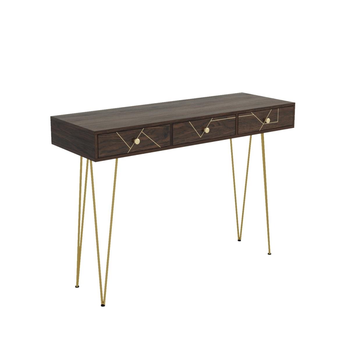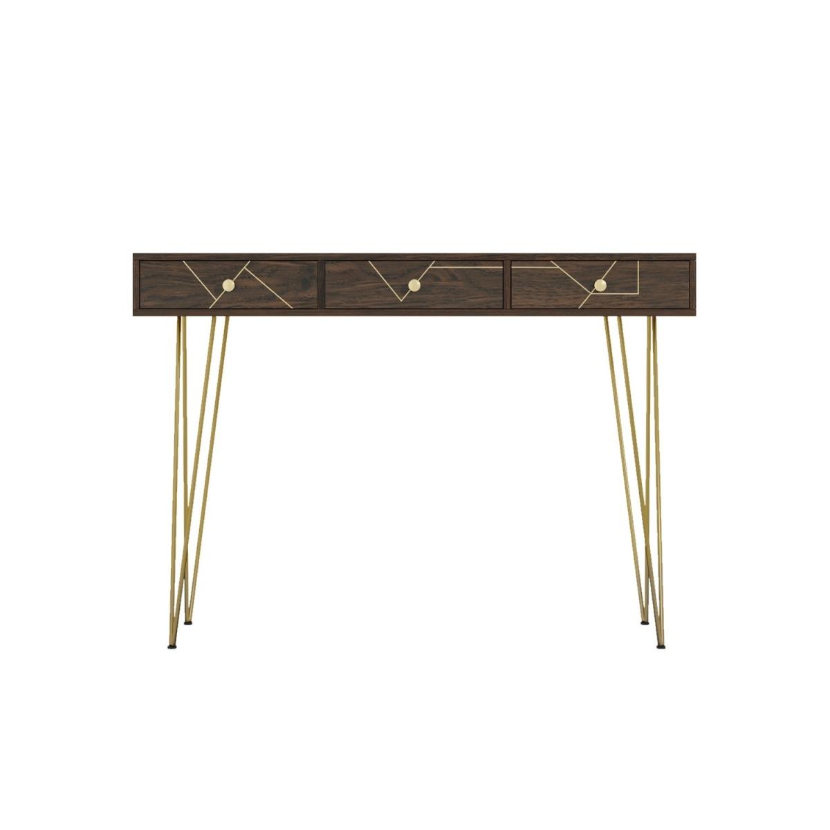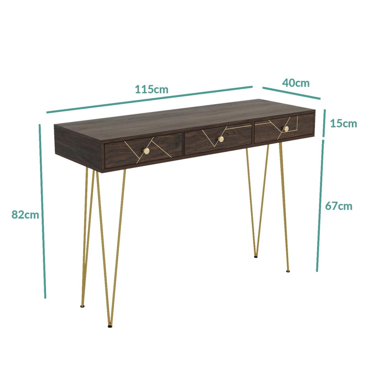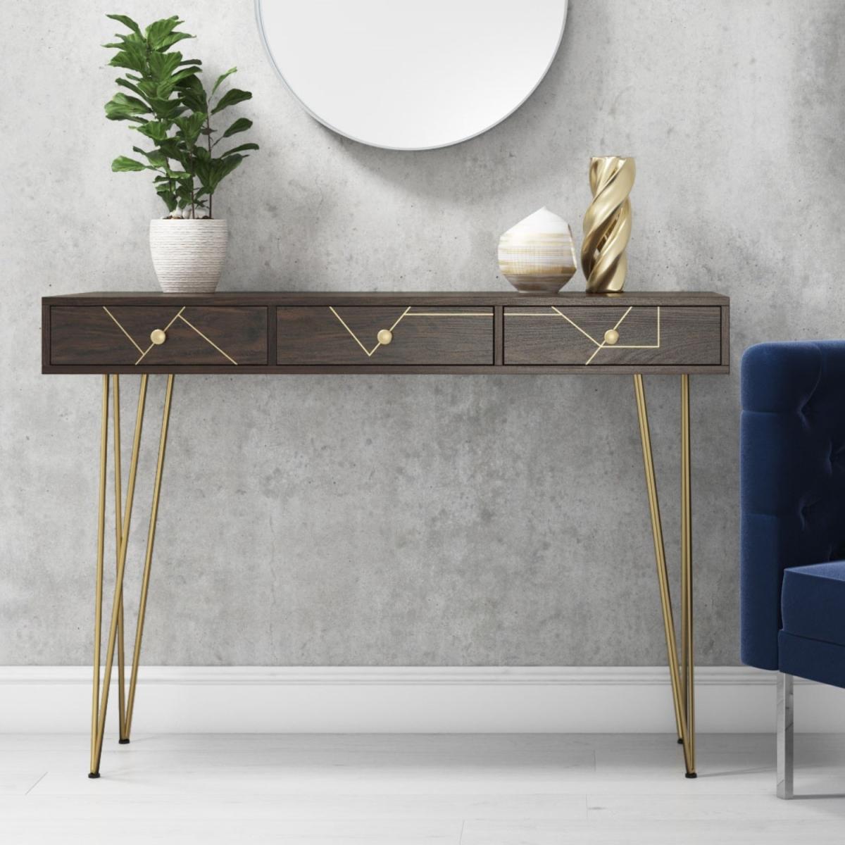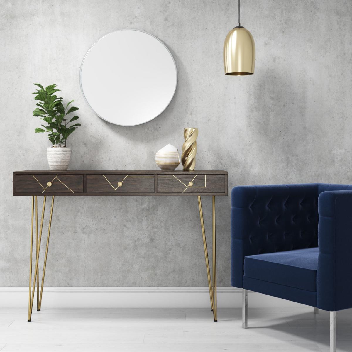 Handcrafted by Skilled Artisans Using time-honoured techniques, our skilled artisans spend hours expertly hand crafting each and every piece of this range. Meticulous craftsmanship goes into the production process, ensuring premium quality whilst giving each piece its own unique charm and character. Features we love Harmonious combination of metal and wood gives a modern industrial look Hand-finished, geometric design creates an instant focal point for any room It's right on trend with its stylish angled hairpin legs Brass inlay on the drawer fronts gives it an elegant and luxurious touch The solid mango wood has a beautiful woodgrain and its highly durable There's minimal assembly required, it's just a case of fixing the legs in place All about me This Tahlia console table demands attention with its trend-setting design, it's basically modern art. There's no doubt that this luxurious, hand finished piece will create an instant feature in any room of the home. It's a harmonious combination of metal and solid wood, achieving a contemporary yet elegant industrial look. It features stunning geometric detailing across the front, created by brass inlay cutting through the solid wood to create these visually pleasing angles. These beautiful metallic lines enthuse the piece with a sense of luxury. The hand finished design has been crafted from solid mango wood, ensuring longevity whilst introducing a natural look to your space with its multiple warm tones of wood and beautiful woodgrain. It stands strong upon trend-setting iron hairpin legs, which are also finished superbly in brass and continue the geometric perfection. It doesn't just bring style, it's also highly practical with three drawers to tuck away essentials. At a depth of just 40cm, it's perfect for adding some storage and surface space to tighter spots in the home, just what you need to create a grand entrance way. If you're looking to modernise your home with an envious designer look, then the Tahlia range is for you. Need to know Dimensions: H82 x W115 x D40 cm Drawer dimensions: H8.25 x W35.5 cm Material: Solid mango wood & Iron Finish: Solid Walnut finish mango wood, brass and gold painted Iron legs Drawers: 3 Assembly required: Yes