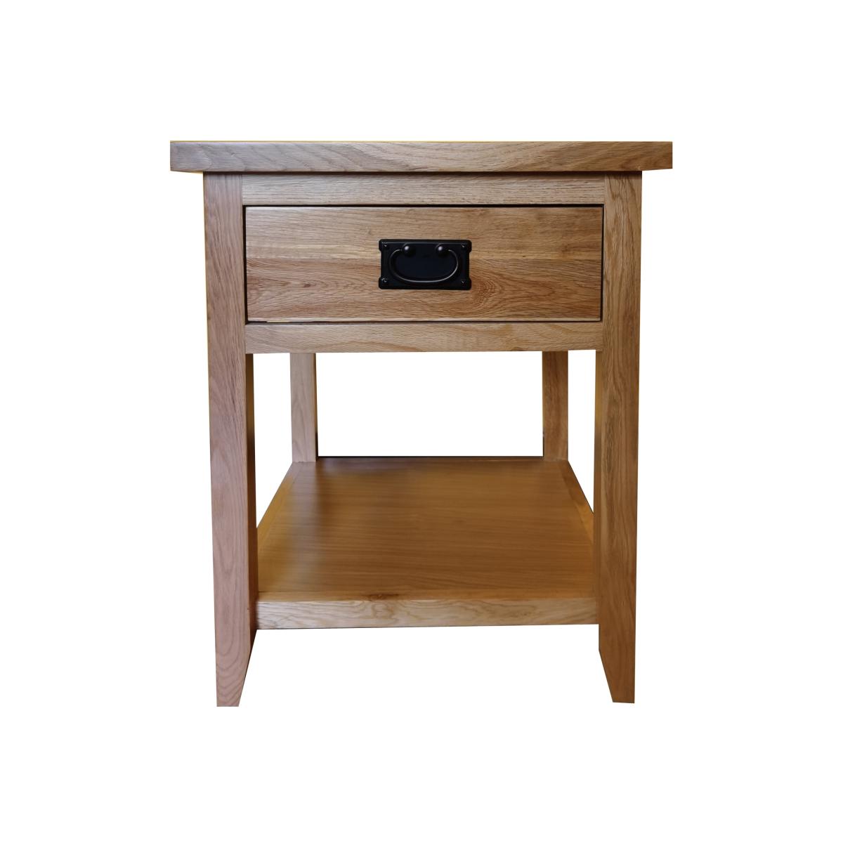 This oak lamp table works well in almost any room, lending an additional surface for supporting a lamp, decorative sculpture or even as a telephone table. With its small dimensions, this lamp table will fit easily into any space, whilst the handy drawer and shelf offer additional storage solutions for spare batteries, personal items, or handy notepads and pens. The small drawer features an antique styled iron handle, to add to the genuine antique effect of the piece.