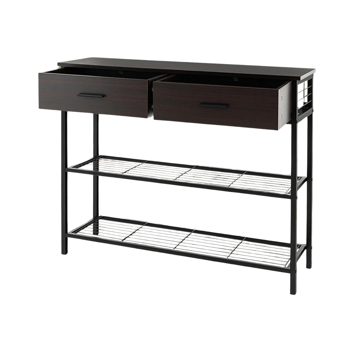 Our console table provides ample storage space with a wide tabletop, two large drawers, and two metal shelves. Measuring 100 x 30 x 81 cm (L x W x H), it offers plenty of room for displaying decor and organizing essentials. Built with a heavy-duty metal frame, this console table ensures high stability and durability. The plastic-sprayed surface prevents rusting, and each component has a weight capacity 40 kg for the tabletop, 15 kg for each shelf, and 5 kg for each drawer. Featuring handles on each drawer for easy opening and closing, this console table also boasts a smooth surface that's simple to maintain. Keep it looking clean and polished with minimal effort. For added safety, our console table comes equipped with an anti-toppling device, providing peace of mind, especially in households with children or pets. With clear instructions included, assembly is a breeze. You'll have your new console table set up and ready to use in no time, enhancing both the functionality and aesthetic appeal of your space.