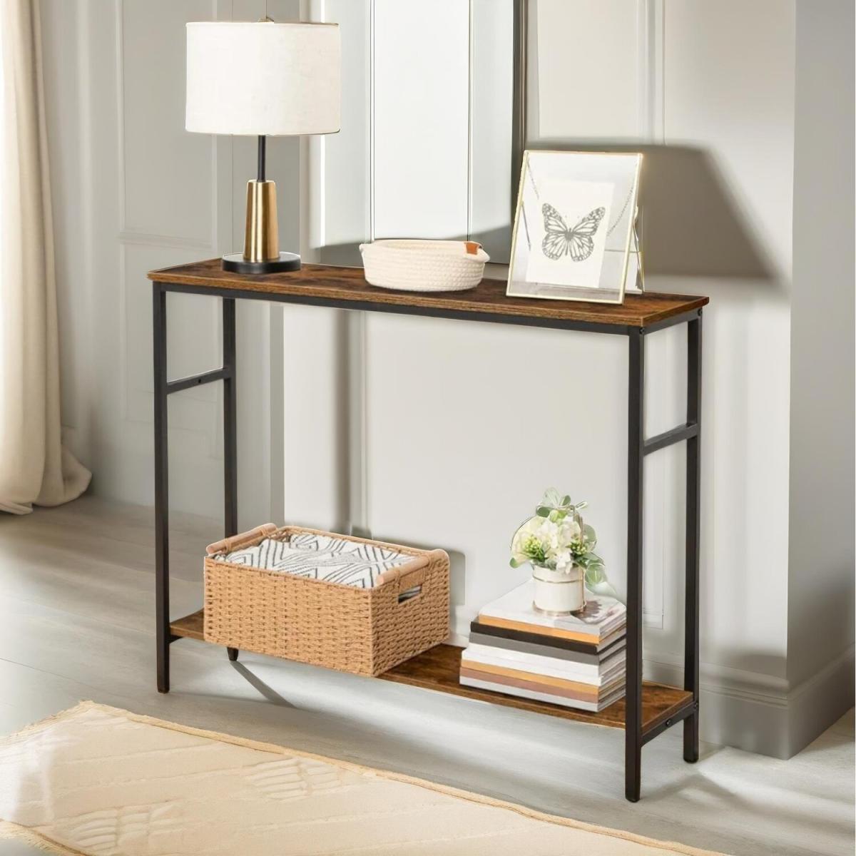 Our console table features a versatile double-layer design. The bottom shelf can be customized to your preferences, serving as a spot for storing magazines, keys, and miscellaneous items in the upper position or transforming into a practical shoe rack when placed lower. Enjoy the DIY experience with two installation options. Crafted from high-quality particle board and a metal frame, our entryway table ensures stability and durability. Easy to clean and with each shelf supporting up to 20kg, you can confidently place your items without worrying about tipping or spilling. This sleek sofa table is ideal for hallway or behind-sofa placement. Despite its compact size, it offers ample room for your books and plants, enhancing your home decor. Our side table excels at accommodating books, keys, bags, indoor plants, and more, eliminating storage concerns. Its compact and stylish design suits various settings, from the entrance and corners to the kitchen, bedroom, and hallway. Setting up the console table is a straightforward task. With detailed instructions and numbered components, you'll have it assembled in no time.