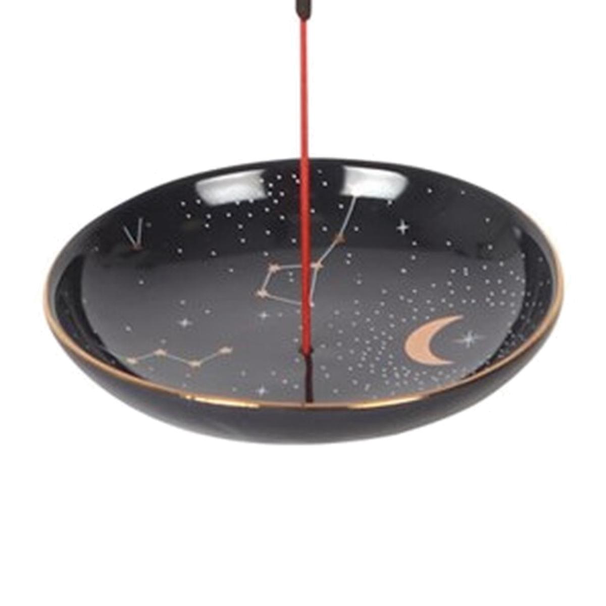 This modern incense stick holder features a celestial constellation design accented by gold foil details. Simply place a smoking incense stick in the centre of the holder or use to store small trinkets on a vanity or bedside table.