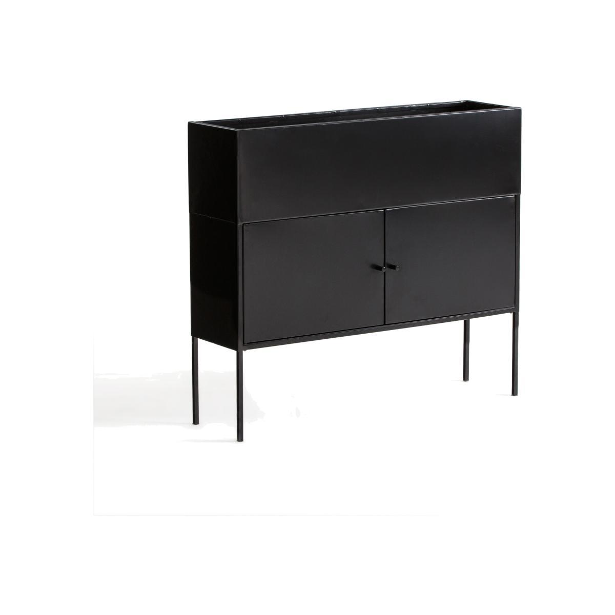 I love this black metal planter console for its sleek, contemporary look and versatile design. It works particularly well in minimalist, industrial, or modern interiors, adding functionality without compromising style. A great practical tip is to use the top surface for displaying small potted plants or decorative objects, while the cabinet offers discreet storage for garden tools, outdoor essentials, or less attractive garden accessories. Its slim profile makes it ideal for narrow patios, balconies, or as a statement piece in indoor sunrooms or conservatories. Pair it with tall, sculptural planters or trailing plants to add height and interest, and consider mixing textures-like concrete, ceramics, or woven baskets-to keep things lively while maintaining a cohesive aesthetic.