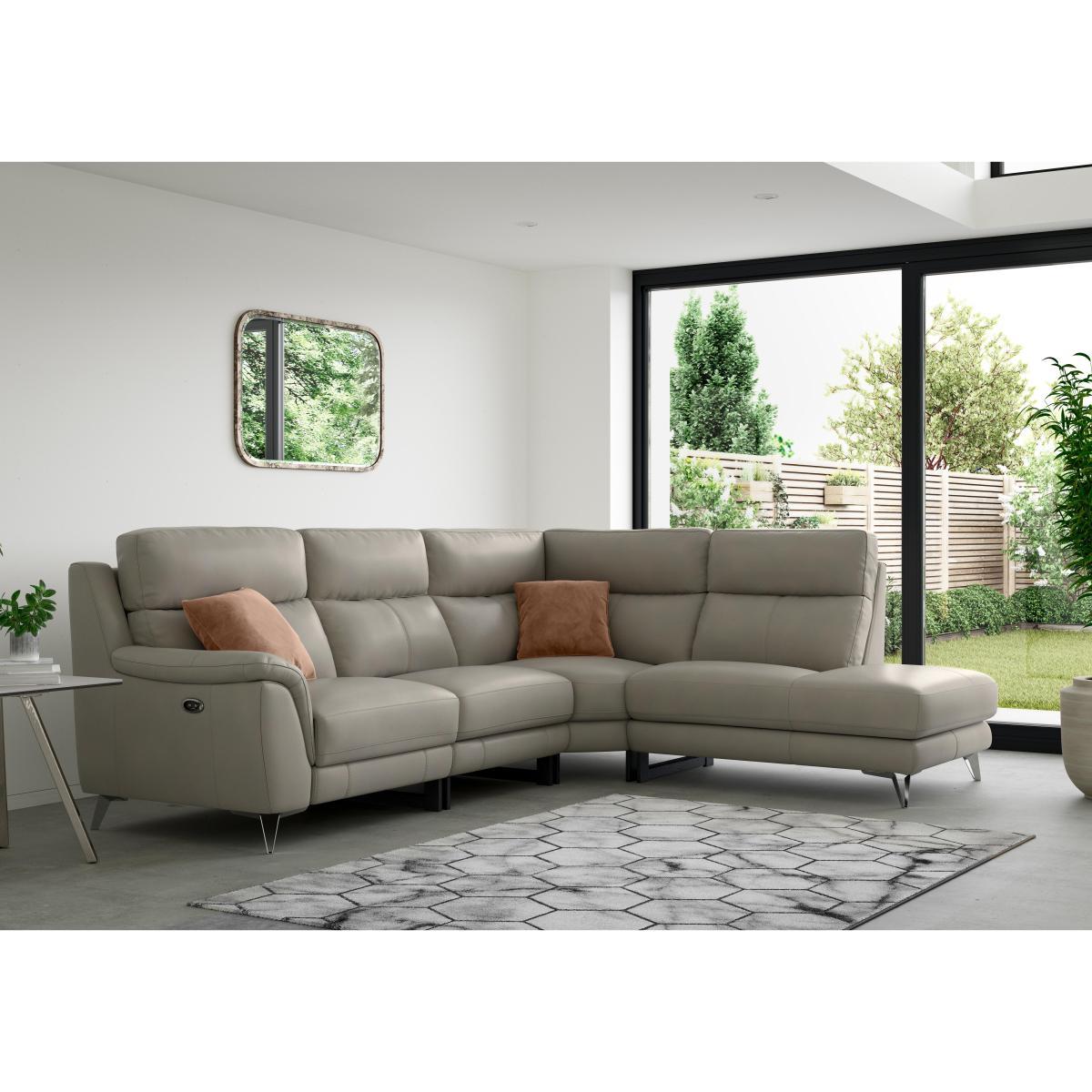 With its high supportive backs and clean contemporary lines, the Contempo range of power recliner sofas and chairs is the smoothest way to ease into comfort. The pocket sprung seats and foam and fibre cushioning ensure that these generously-proportioned sofas and chairs with integrated headrests and padded armrests are wonderfully supportive. They’re also wonderfully stylish, thanks to the modern open-base recliners and sleek metal feet. Select from a wide range of colours for the soft-touch fabric. Its modular design means you can mix and match with pieces from across the range. Exclusive to Furniture Village, the classic back sofas and chairs in the Contempo range are also available without recliners. Beautiful contemporary style with high backed comfort is a winning combination. This large leather corner sofa with supportive pocket sprung seats pampers you from head to toe. Why you’ll love it. Wonderfully roomy, with an open base and modern metal legs. Choose with smooth ‘wall away’ power recliners or no recliners. Super comfy pocket sprung seats. Contemporary, modular design. High backs for comfort from top to toe. Beautiful, 100% premium leather upholstery. Luxury fibre-filled back cushions. Sumptuous padded headrests and arm cushions. Exclusive to Furniture Village at a fantastic value price. What you need to know. Firm, supportive comfort level. Pocket sprung seat interiors, foam wrapped and topped with luxury fibre. Strong solid hardwood frame, removable metal legs with a black finish. Natural leather has unique marks and characteristics with variance in colour and texture, and softens with use. Smoothing seat cushions prevents ‘puddling’. Please read our upholstery care guide for more advice. Allow time for recliners to settle. Minor gaps for motion vary by floor type. Part of the fully modular Contempo range.