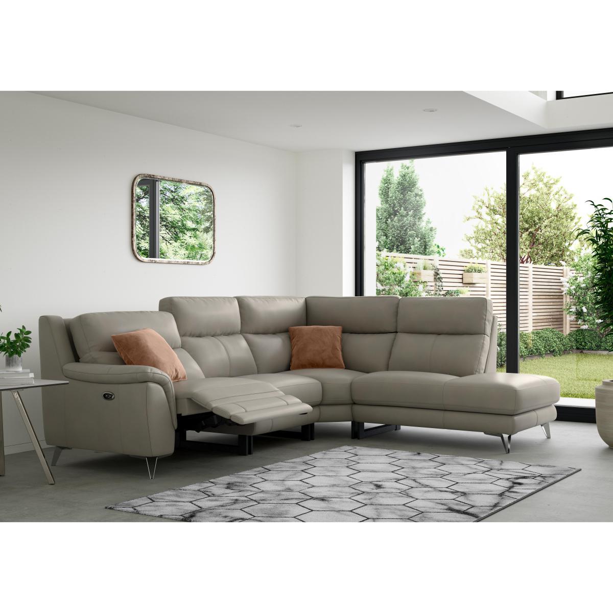 With its high supportive backs and clean contemporary lines, the Contempo range of power recliner sofas and chairs is the smoothest way to ease into comfort. The pocket sprung seats and foam and fibre cushioning ensure that these generously-proportioned sofas and chairs with integrated headrests and padded armrests are wonderfully supportive. They’re also wonderfully stylish, thanks to the modern open-base recliners and sleek metal feet. Select from a wide range of colours for the soft-touch fabric. Its modular design means you can mix and match with pieces from across the range. Exclusive to Furniture Village, the classic back sofas and chairs in the Contempo range are also available without recliners. Beautiful contemporary style with high backed comfort is a winning combination. This large leather corner sofa with supportive pocket sprung seats pampers you from head to toe. Why you’ll love it. Wonderfully roomy, with an open base and modern metal legs. Choose with smooth ‘wall away’ power recliners or no recliners. Super comfy pocket sprung seats. Contemporary, modular design. High backs for comfort from top to toe. Beautiful, 100% premium leather upholstery. Luxury fibre-filled back cushions. Sumptuous padded headrests and arm cushions. Exclusive to Furniture Village at a fantastic value price. What you need to know. Firm, supportive comfort level. Pocket sprung seat interiors, foam wrapped and topped with luxury fibre. Strong solid hardwood frame, removable metal legs with a black finish. Natural leather has unique marks and characteristics with variance in colour and texture, and softens with use. Smoothing seat cushions prevents ‘puddling’. Please read our upholstery care guide for more advice. Allow time for recliners to settle. Minor gaps for motion vary by floor type. Part of the fully modular Contempo range.