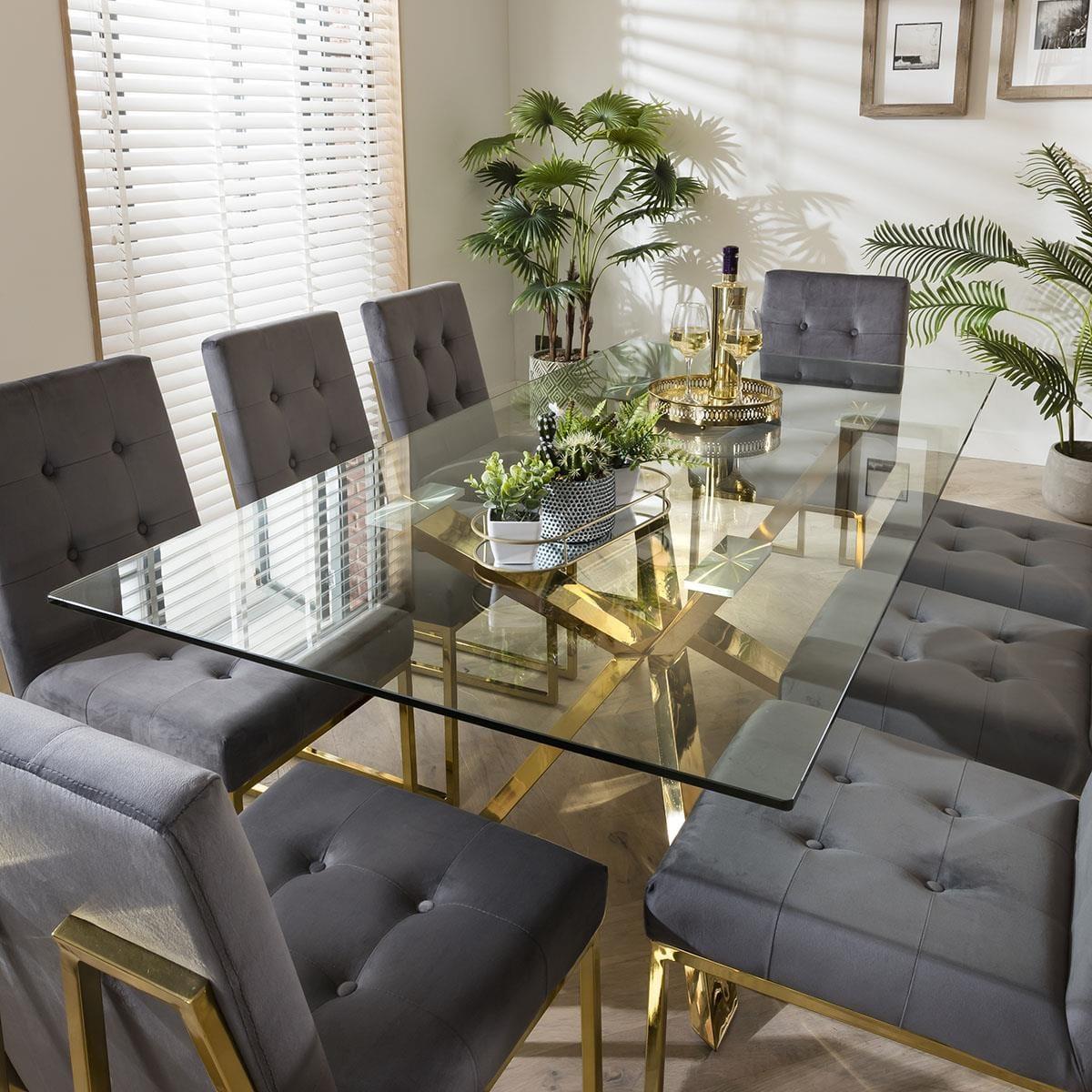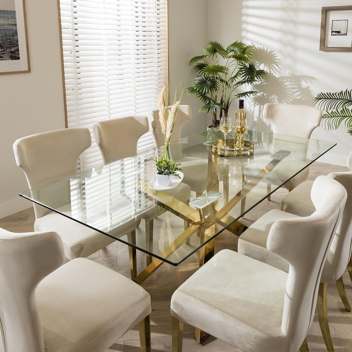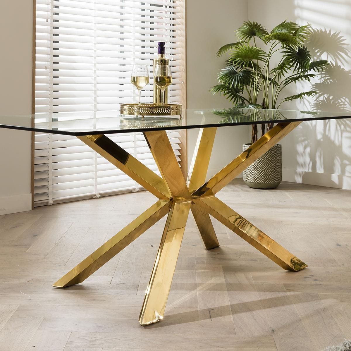 Elevate your dining space with the Zoe 2-metre long 8 seater dining table. With dimensions of 198cm x 99cm, this table comfortably accommodates up to 8 guests. Crafted with a keen eye for design and functionality, this glamorous dining table has a large tempered glass tabletop and a showpiece gold metal pedestal base. The clear tempered glass tabletop is not only visually stunning but also incredibly durable, ensuring long-lasting beauty and easy maintenance. Its sleek surface allows the intricate details of your culinary creations to shine through, adding an elegant touch to every meal. The showpiece of this dining table lies in its gold metal star feature pedestal base. This unique and glamorous design element adds a touch of opulence and sophistication, making a bold statement in any dining room. Whether you're hosting a formal dinner party or enjoying a casual brunch with loved ones, our 2-metre dining table promises to redefine your dining experience. With its generous seating capacity, striking clear glass top, and captivating gold metal star pedestal base, this table effortlessly combines practicality and luxury to create a truly unforgettable ambiance. Elevate your dining space with a touch of elegance. W198cm D99cm H77cm A modern 2-metre 8 seater dining table Clear Tempered Glass Top