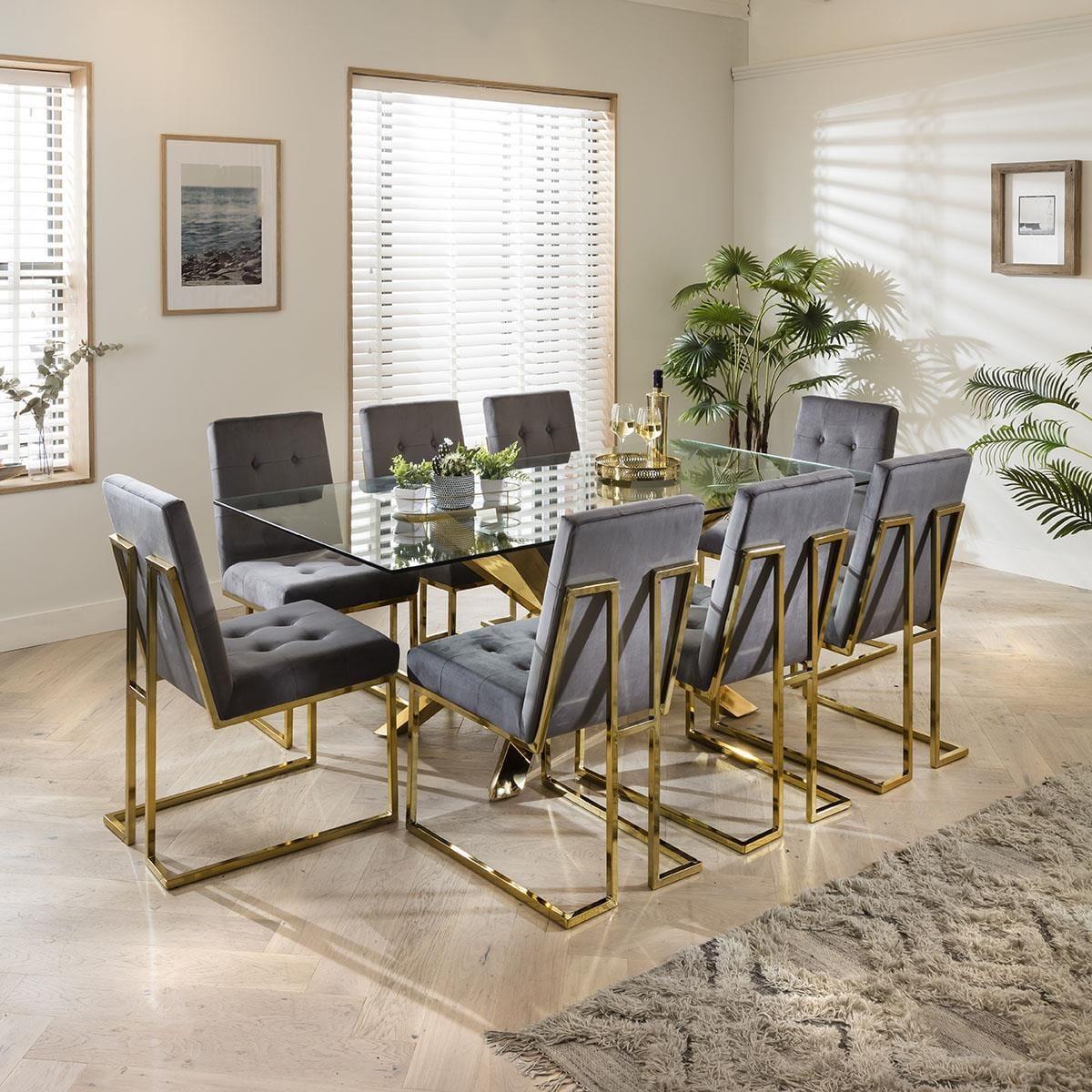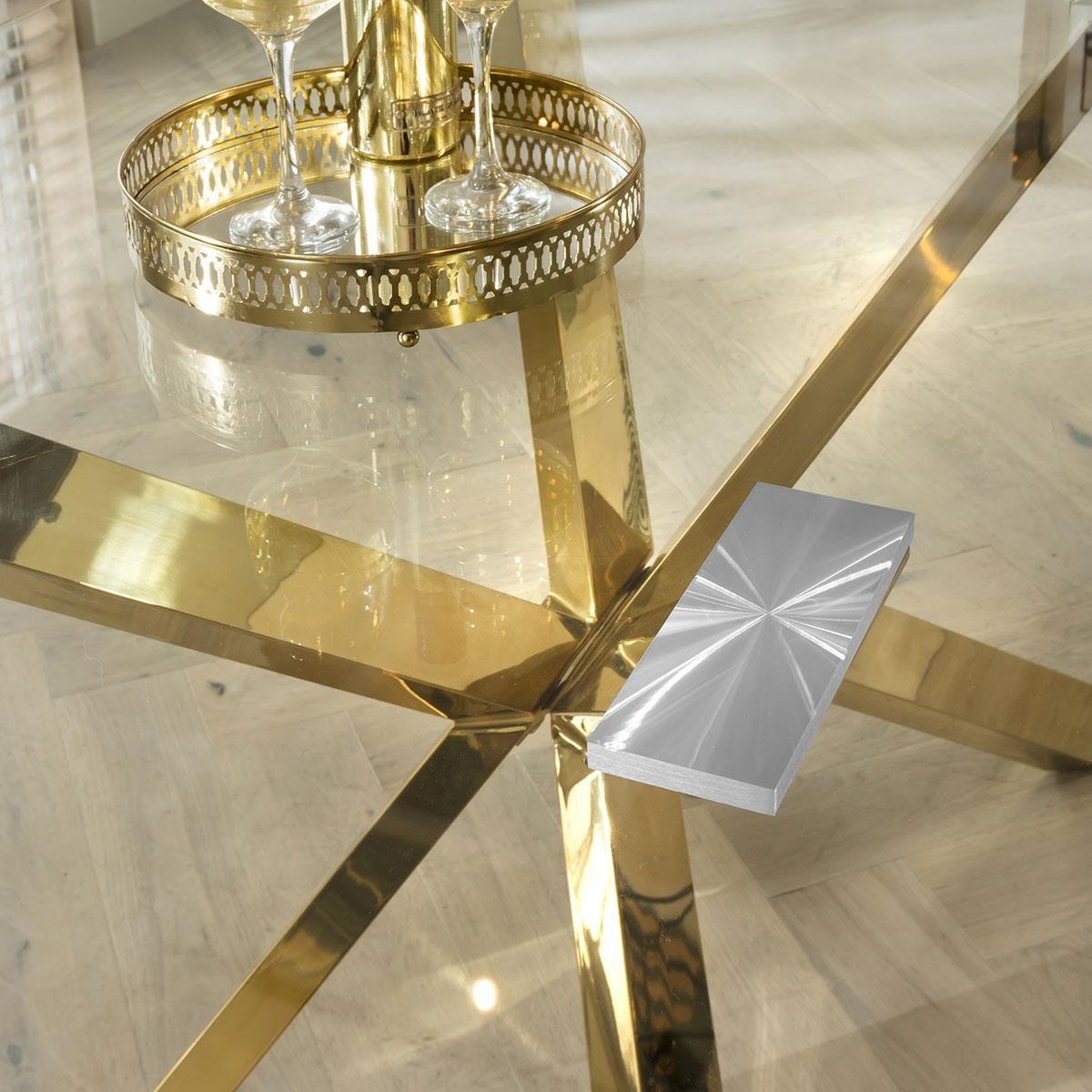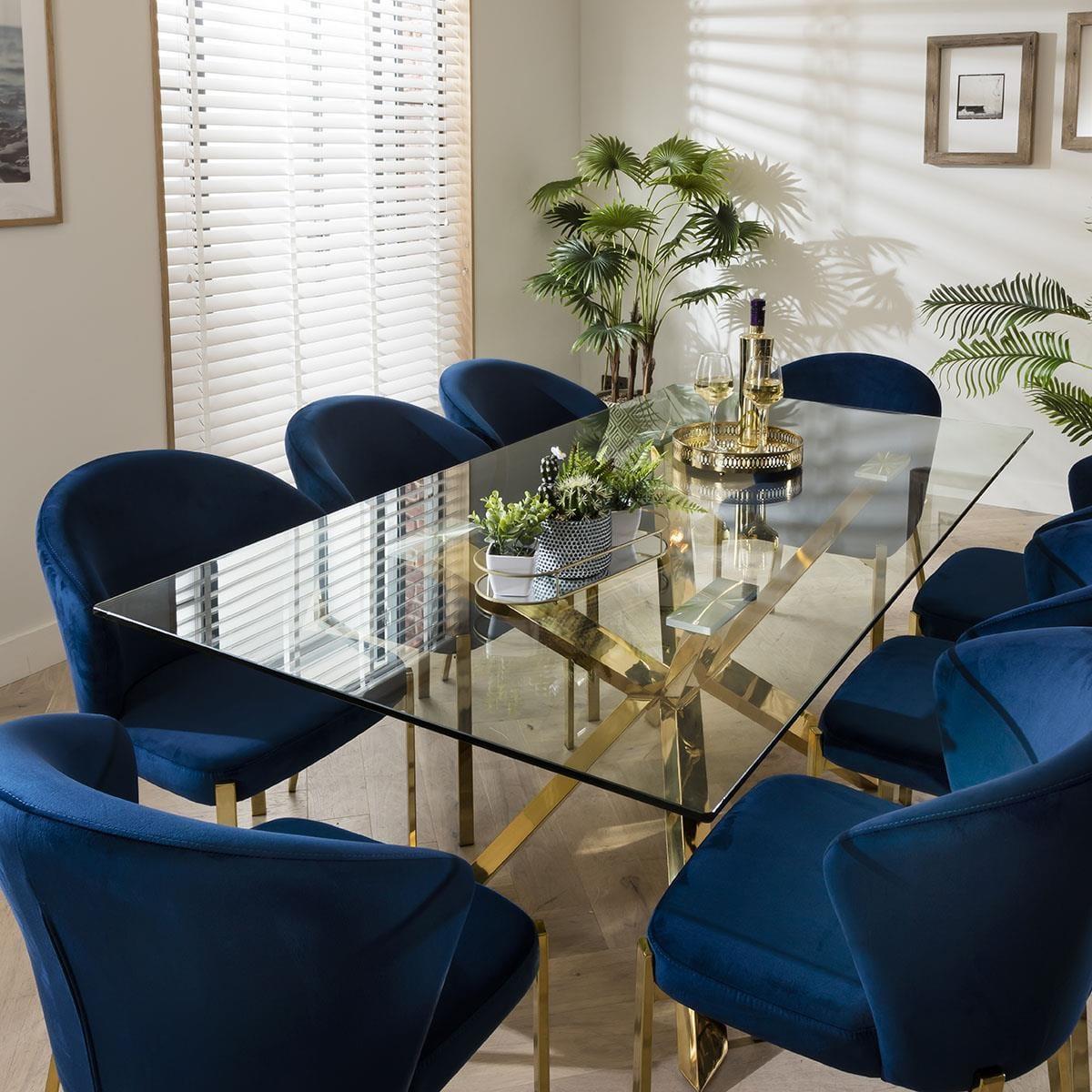 Elevate your dining space with the Zoe 2-metre long 8 seater dining table. With dimensions of 198cm x 99cm, this table comfortably accommodates up to 8 guests. Crafted with a keen eye for design and functionality, this glamorous dining table has a large tempered glass tabletop and a showpiece gold metal pedestal base. The clear tempered glass tabletop is not only visually stunning but also incredibly durable, ensuring long-lasting beauty and easy maintenance. Its sleek surface allows the intricate details of your culinary creations to shine through, adding an elegant touch to every meal. The showpiece of this dining table lies in its gold metal star feature pedestal base. This unique and glamorous design element adds a touch of opulence and sophistication, making a bold statement in any dining room. Whether you're hosting a formal dinner party or enjoying a casual brunch with loved ones, our 2-metre dining table promises to redefine your dining experience. With its generous seating capacity, striking clear glass top, and captivating gold metal star pedestal base, this table effortlessly combines practicality and luxury to create a truly unforgettable ambiance. Elevate your dining space with a touch of elegance. W198cm D99cm H77cm A modern 2-metre 8 seater dining table Clear Tempered Glass Top
