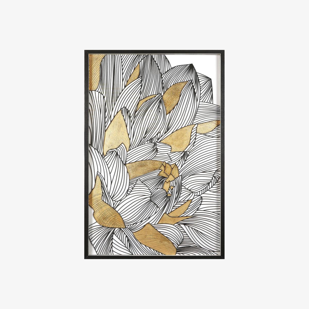 This product will be dispatched by one of our trusted suppliers. You’ll be contacted by their selected courier about your delivery. PREMI01. The Modello wall art is a contemporary interpretation of botanical forms with bold gold and black tones. Dimensions • H120 x W80 x D4cm • Weight 14kg