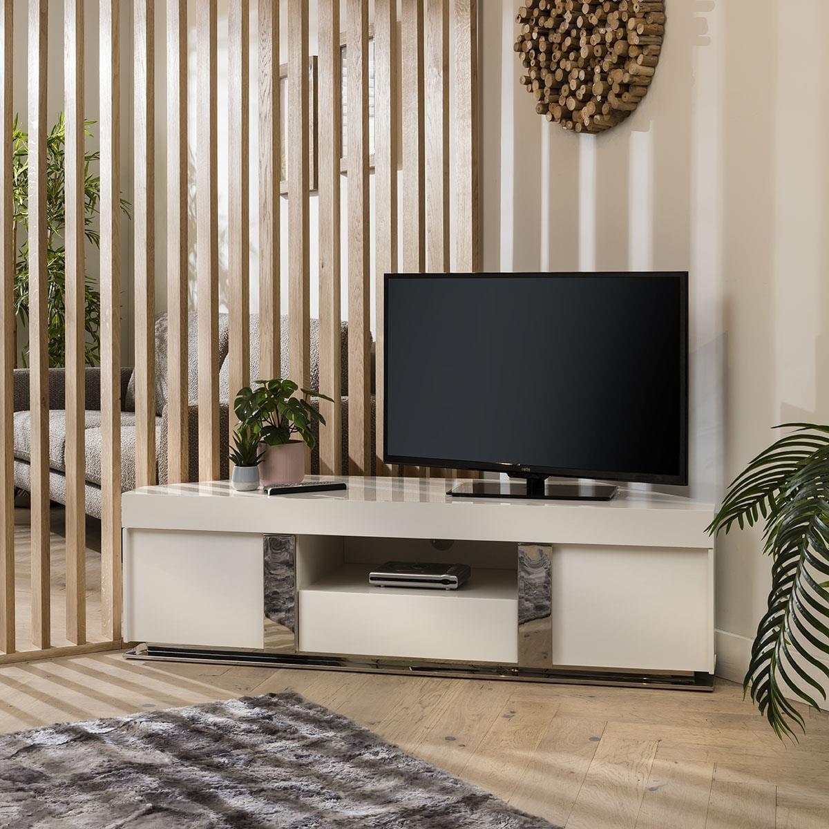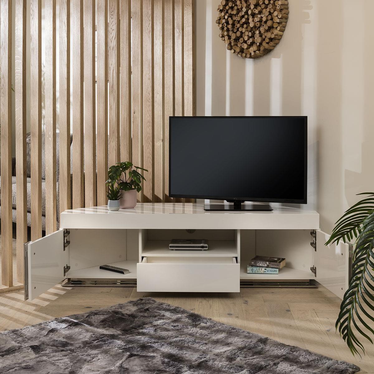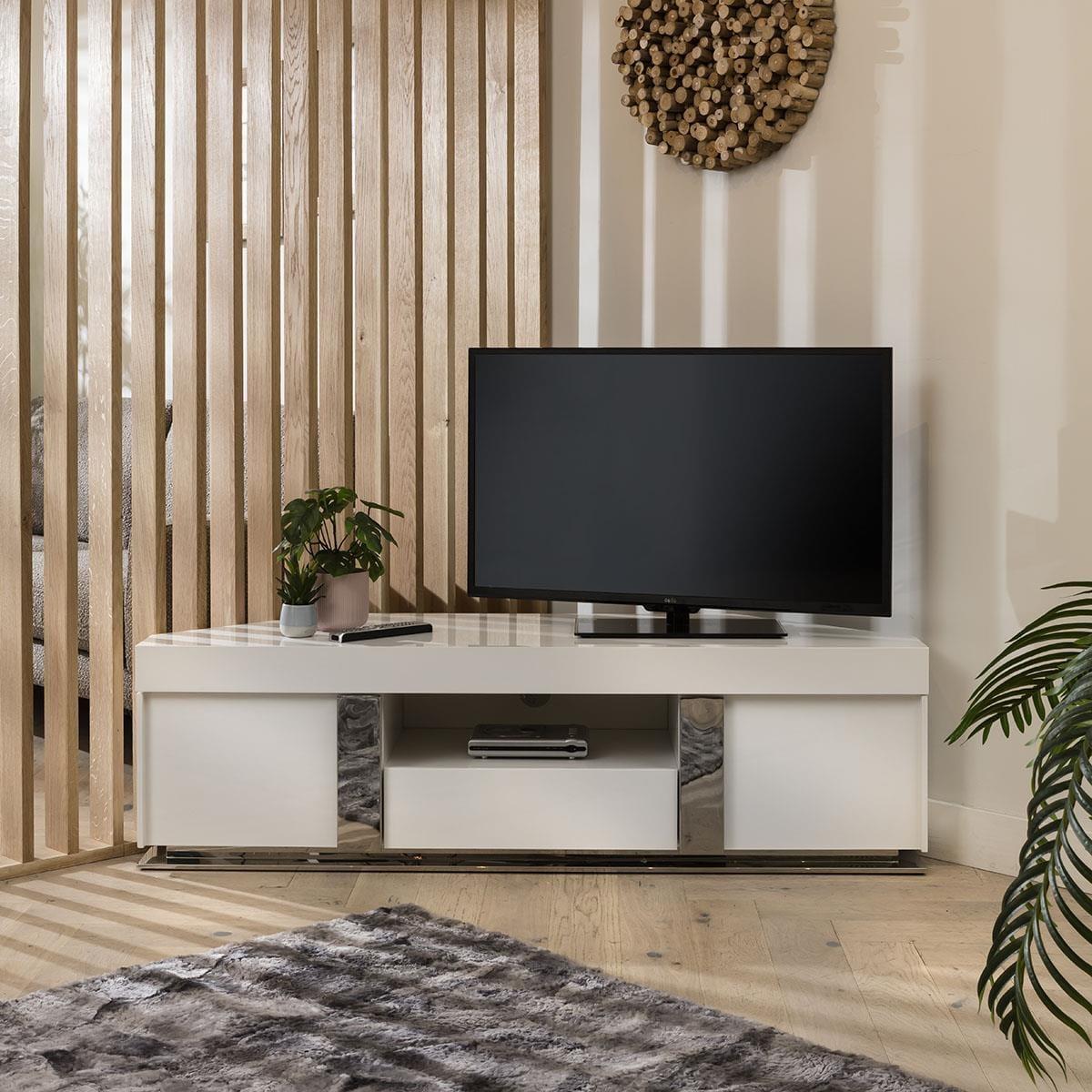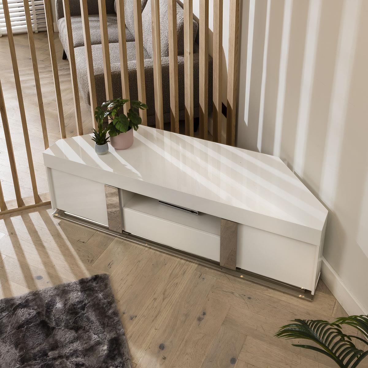 Our modern corner TV unit features a spacious tabletop for your screen. The self-assebly unit has storage space in abundance with 2 soft-close cupboards, a large open shelf for all of your entertainment systems and an ample storage drawer. The corner TV unit design is greaty for small rooms. The premium white gloss finish, combined with with polished stainless steel accents make this one attention-grabbing unit. If you need more information about this product, use the Live Chat service to speak to the team or send us a message. Spread the cost our with interest-free finance options. Minimum spend applies. W160cm D50cm H46cm White Gloss Finish Premium Quality Furniture
