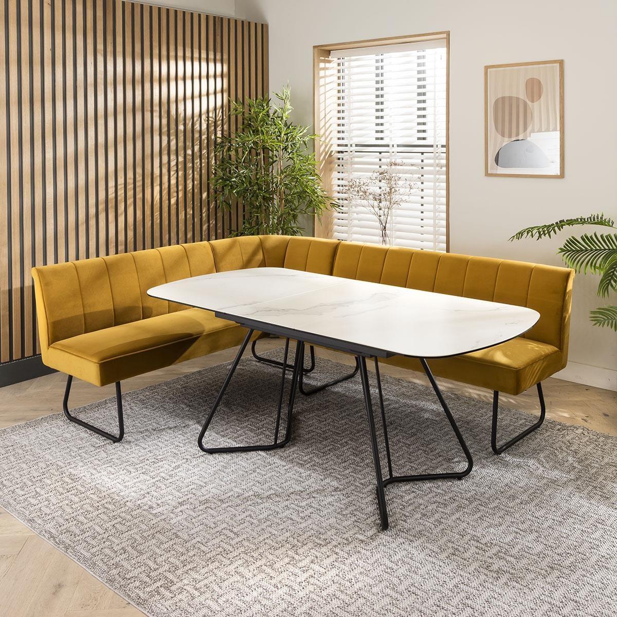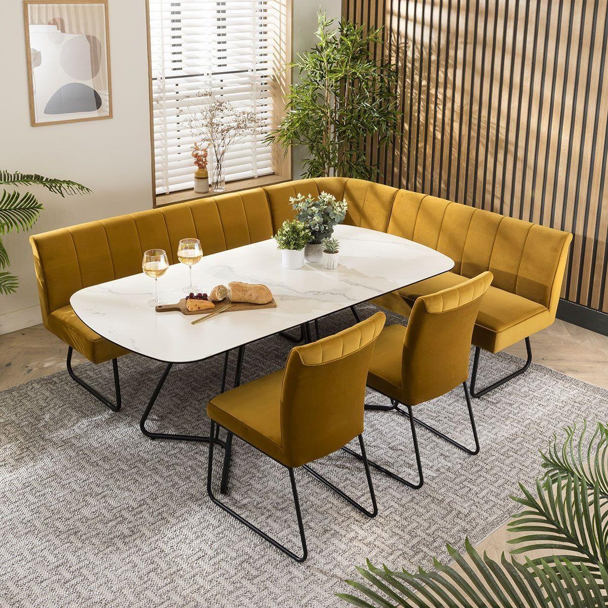 The Deco Corner Dining Bench is a versatile and stylish seating solution for any dining space. This corner bench seat can comfortably seat up to 5 people. Kitchen dining benches offer a perfect gathering spot for friends and family. The premium mustard velvet upholstery is luxurious in its richness and vibrancy. Crafted with attention to detail, our Corner Dining Bench features a sleek black powder-coated tubular frame. This sturdy construction not only provides durability but also adds a modern touch to your interior. The soft cushioning enhances the overall comfort, allowing you to enjoy a relaxed and enjoyable dining experience every time. Not only does this dining bench offer exceptional style, but it also offers versatility. You can easily configure it to fit your space by choosing between left or right-hand placement. This adaptability allows you to optimise your dining area, no matter the size or layout of your room. Designed to complement contemporary settings, this bench showcases a modern line tufted upholstery. The tufted details not only create a visually appealing look but also provide additional support. With our Corner Dining Bench, you can elevate the style and functionality of your dining space effortlessly. W174cm D212cm H82cm Seat Height 49cm Seat Depth 46cm Left or Right Hand Corner Dining Bench in Mustard