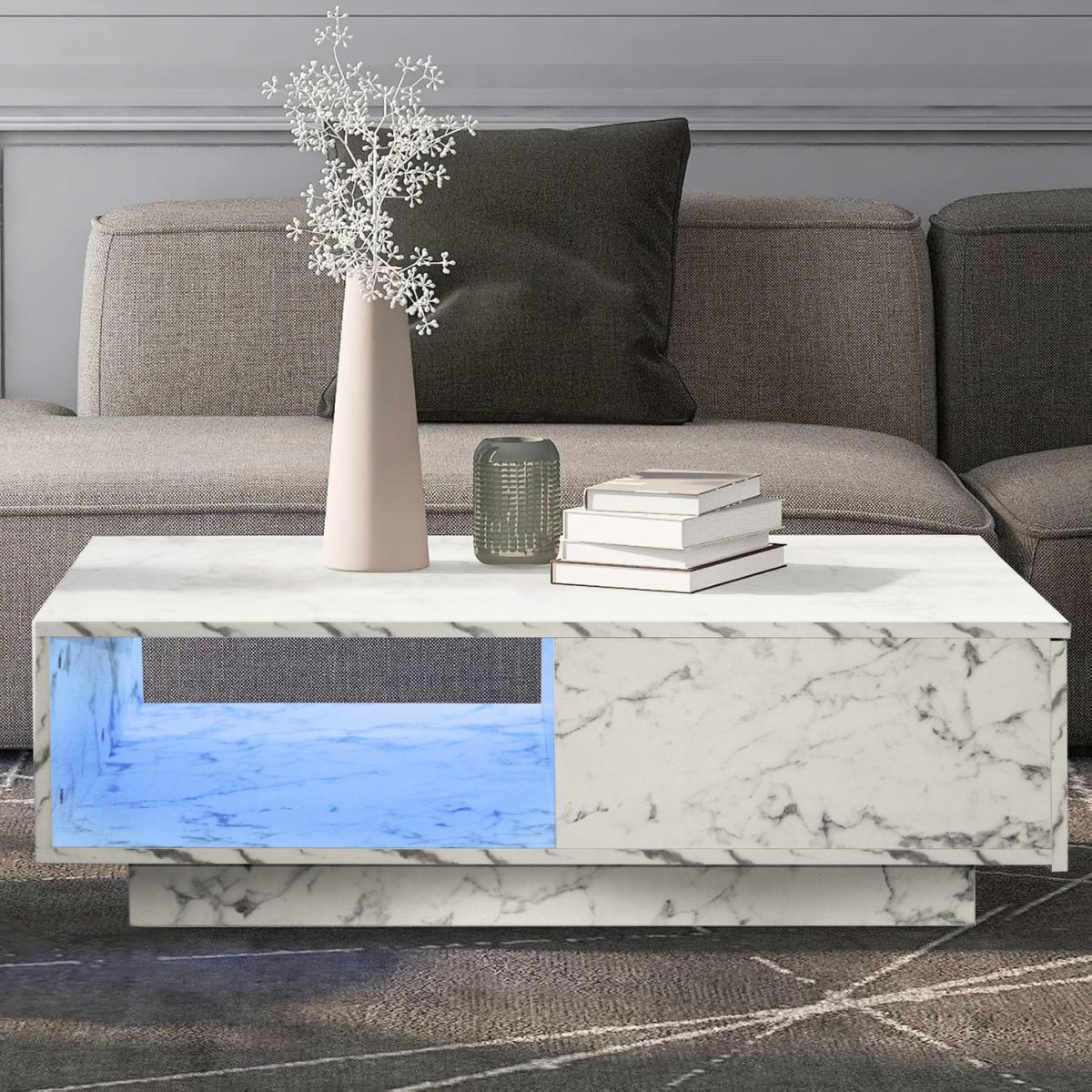 Transform your living space with this sleek, modern LED coffee table that combines style with functionality. The high-gloss finish creates a luxurious appearance. This contemporary piece features built-in LED lighting that creates an atmospheric ambience, perfect for evening entertainment. The cleverly designed storage compartment offers a practical solution for keeping your living room organised. Available in five stunning colours - black, white, grey, and marble effect in both black and white - this table complements any interior design scheme. The durable construction ensures long-lasting performance, while the smooth surface is easy to clean and maintain. The table's generous surface area and end drawer provide ample space for drinks, books, and decorative items, making it both a practical and stylish centrepiece for your living room. The LED feature with 16 colour options can be controlled to suit your mood, adding a contemporary touch to your space. Please note that all dimensions are approximate; please allow room for slight variations.