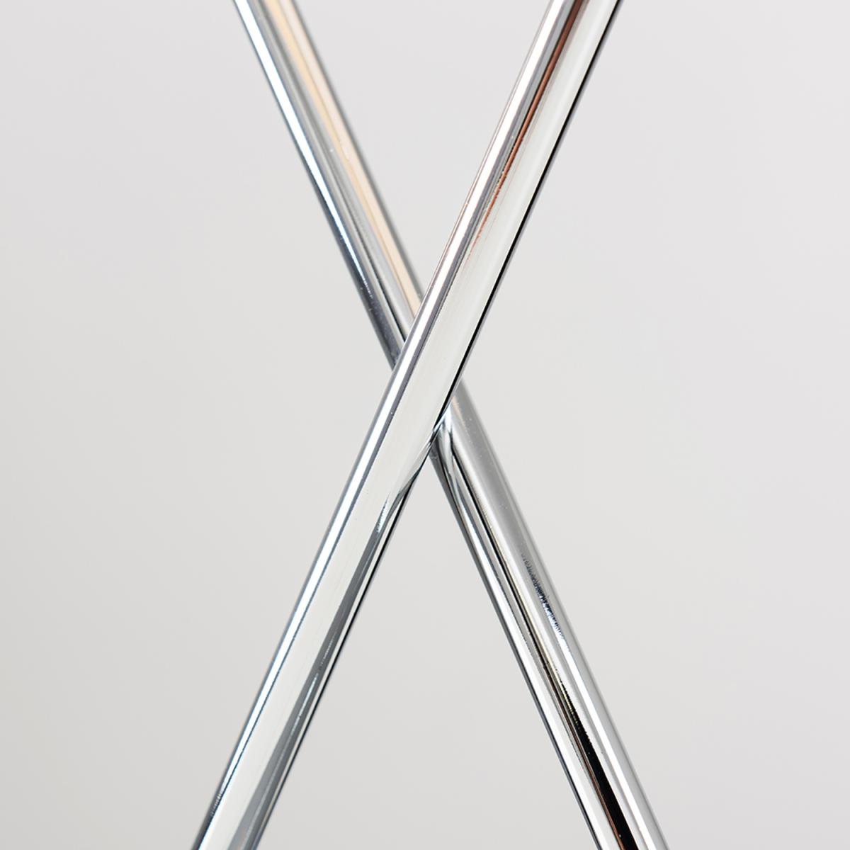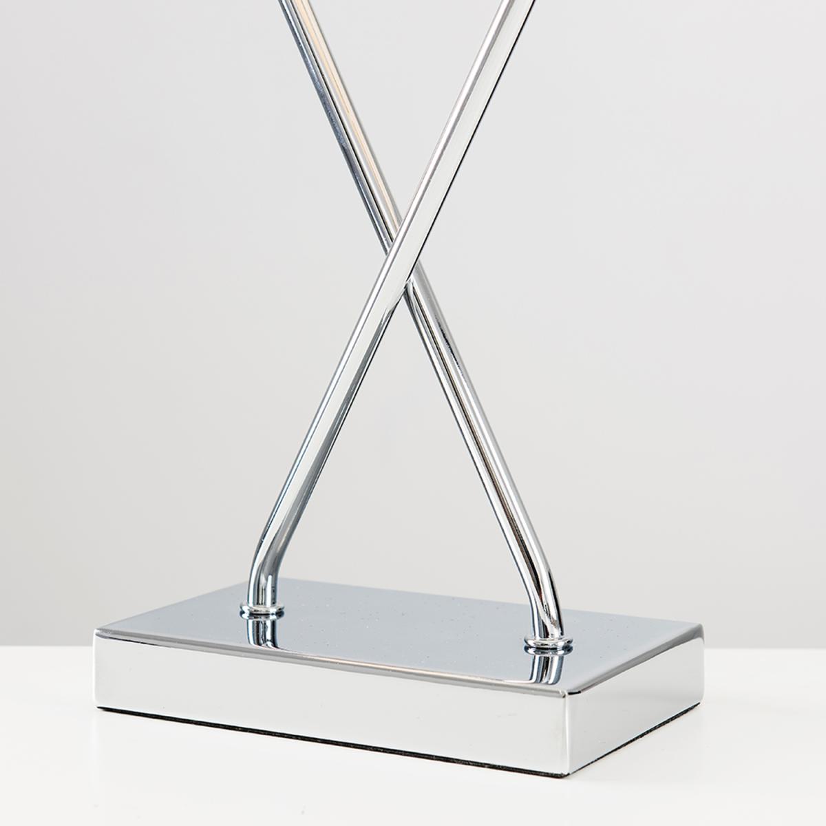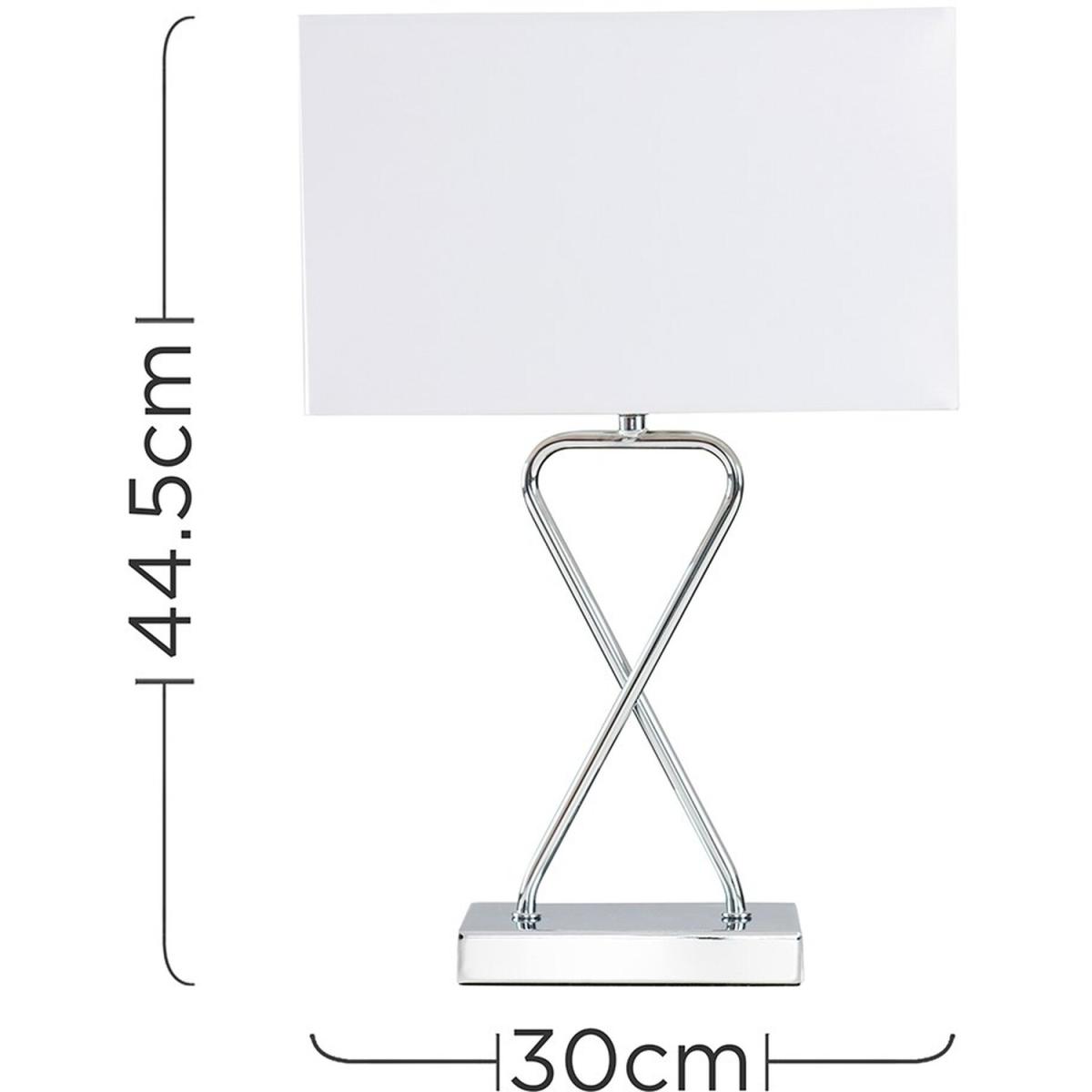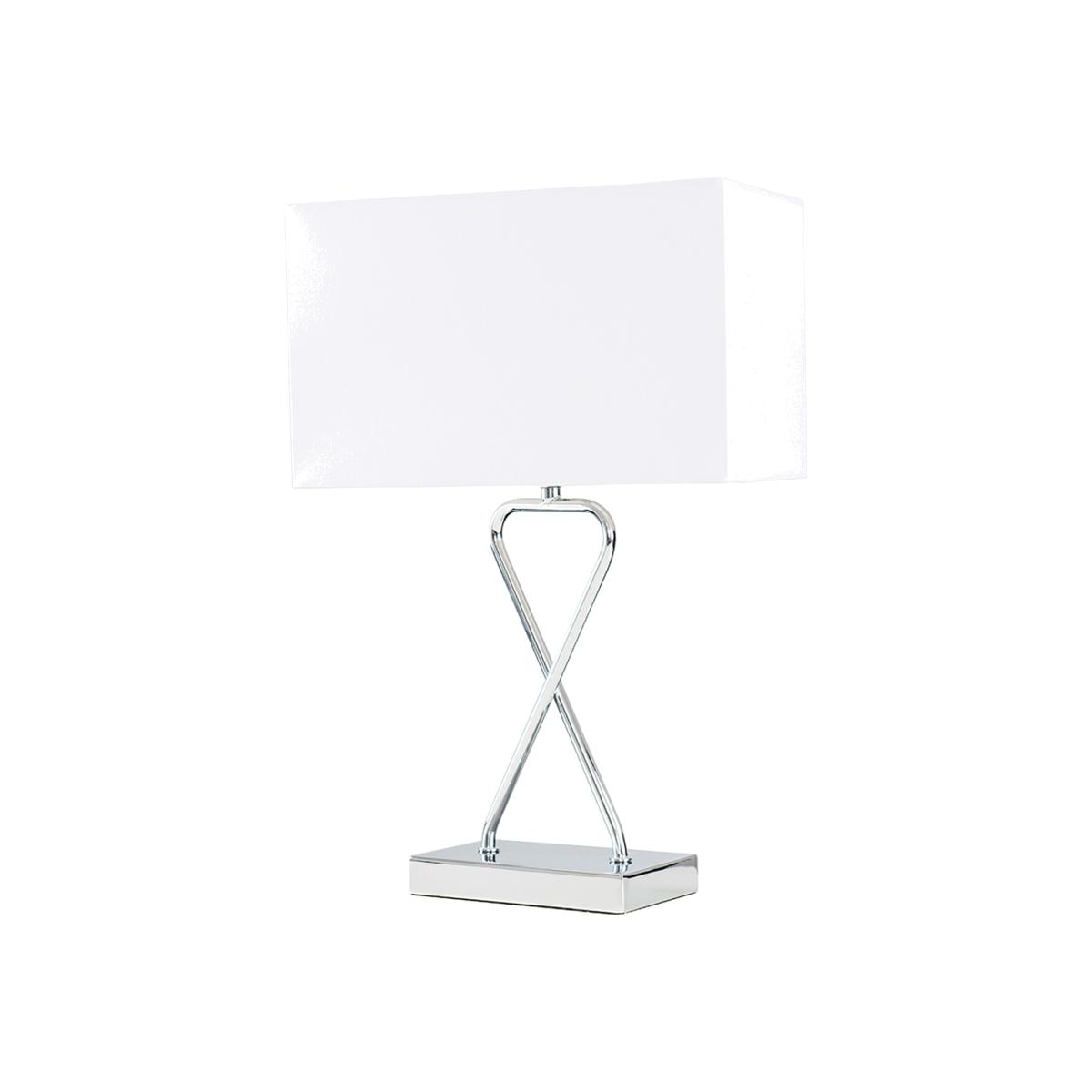 Crossed stem design table lamp in a silver polished chrome metal finish, complete with a white fabric rectangular lamp shade. Features an in-line onoff switch for easy use. Ideal for bedrooms, hallways, living rooms and other areas around the home. Table lamps are a great way to bring additional lighting to a room or you can use them to reduce your main light output, and create a more relaxing moodatmosphere.