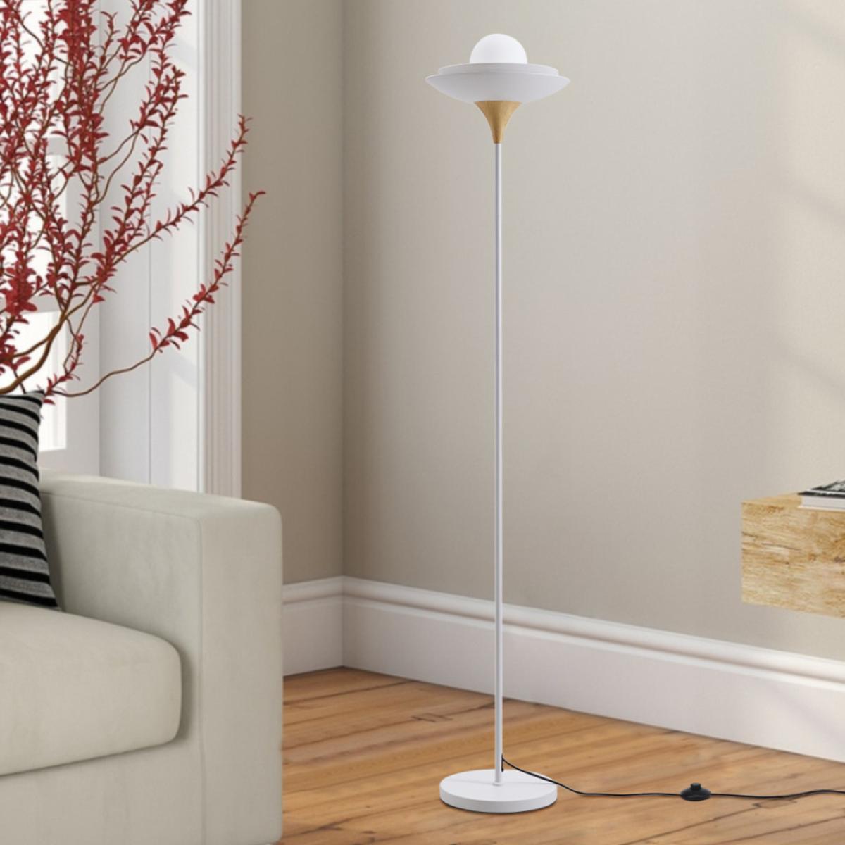 A well-chosen lamp serves not just as lighting but as a piece of art that elevates your home decor. This design features a sleek white metal body with wood grain accents, exuding minimalist charm. The slim post supports a frosted glass shade, providing elegant lighting. Ideal for enhancing your living room, bedroom, or home office.